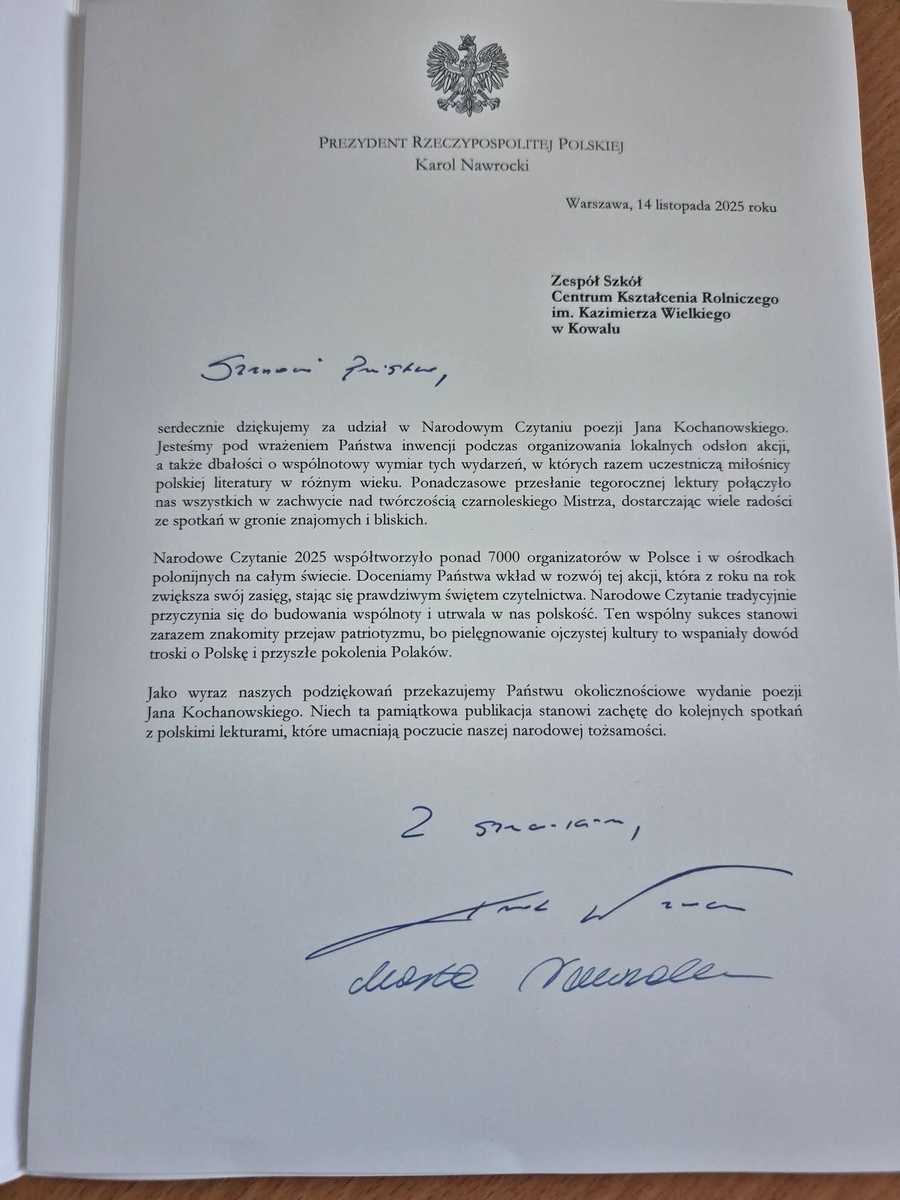 Z ogromną radością informujemy, że nasza szkoła otrzymała od Prezydenta Rzeczypospolitej Polskiej Karola Nawrockiego oraz Pierwszej Damy Marty Nawrockiej wyjątkowy upominek – piękne, okolicznościowe wydanie „Poezji Jana Kochanowskiego” oraz list gratulacyjny za zaangażowanie w tegoroczną edycję akcji Narodowe Czytanie.