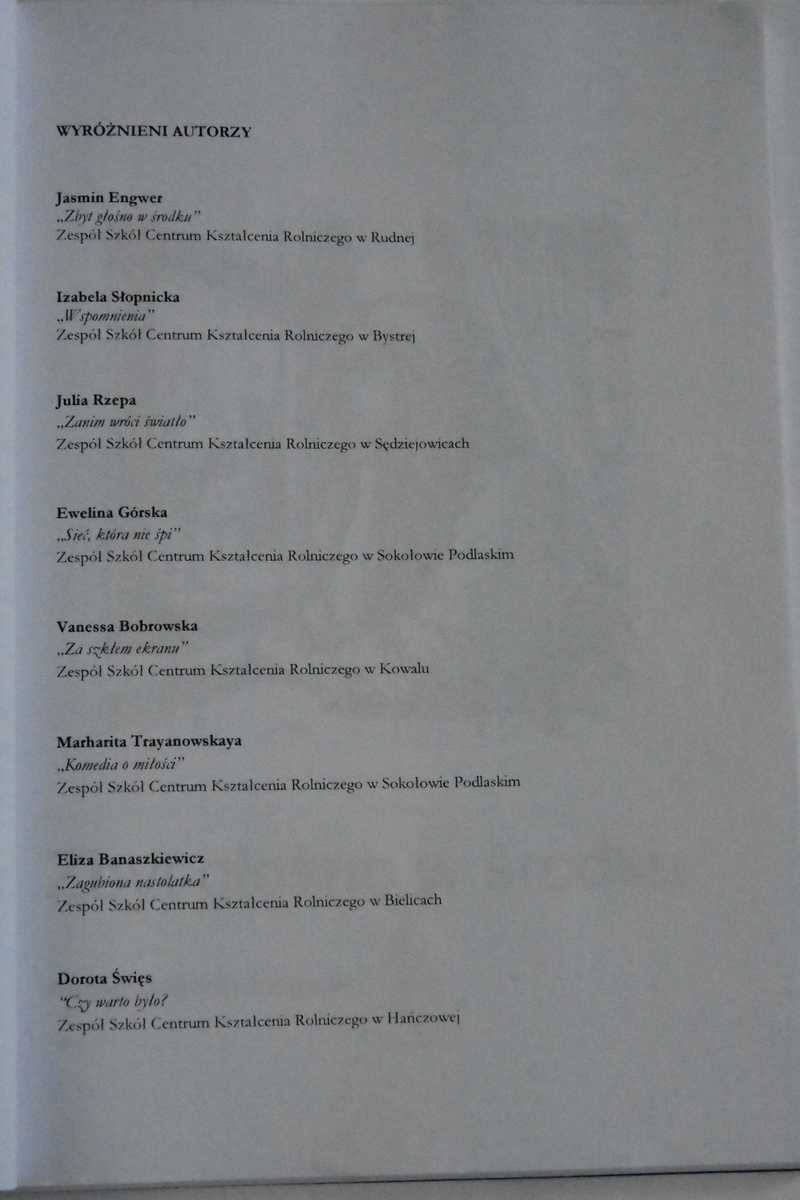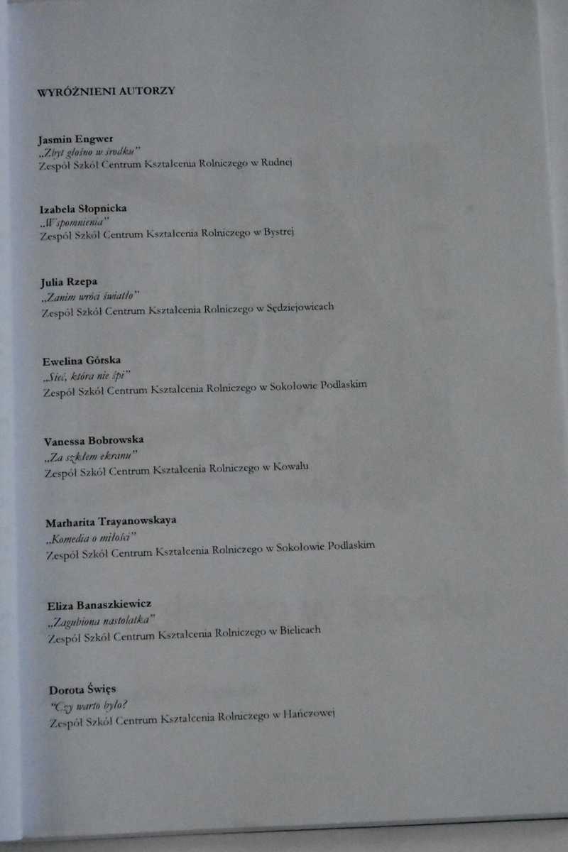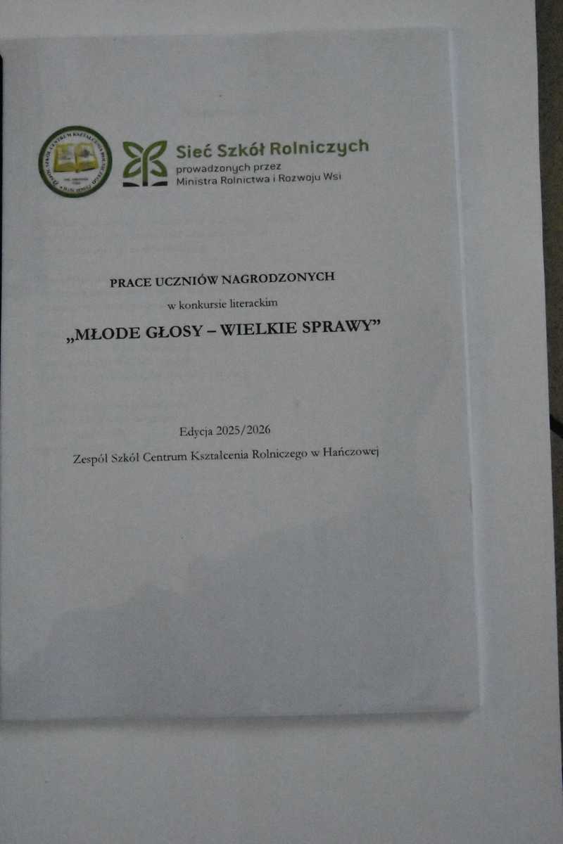 Podczas szkolnej uroczystości związanej z Dniem Kobiet podsumowany został także udział naszych uczennic w Konkursie Literackim „MŁODE GŁOSY – WIELKIE SPRAWY”, zorganizowanym przez Zespół Szkół Centrum kształcenia Rolniczego w Hańczowej dla uczniów z sieci szkół rolniczych prowadzonych przez Ministra Rolnictwa i Rozwoju Wsi. W tej ciekawej i prestiżowej rywalizacji wzięły udział: Patrycja Motylińska z kl. I Tżw oraz Ksenia Kubiak, Julia Sokół i Vanessa Bobrowska – wszystkie uczennice z kl. II Tżw. Miło nam poinformować, że praca Vanessy Bobrowskiej zatytułowana „Za szkłem ekranu” zyskała uznanie konkursowego jury, które przyznało jej wyróżnienie. Została ona wydrukowana w publikacji prac nagrodzonych w konkursie, której egzemplarz znajduje się także w naszej szkolnej bibliotece. Zachęcamy do zapoznania się z tymi ciekawymi tekstami. Przypomnijmy, że Vanessa w ubiegłorocznym Konkursie Poetyckim im. L. Stankiewicza w Śmiłowicach zdobyła III miejsce w kategorii uczniów szkół ponadpodstawowych. Trzeba dodać, że wszystkie wysłane prace na konkurs w Hańczowej odznaczały się młodzieńczą wrażliwością, odwagą wyrażenia swoich spostrzeżeń, nieskrępowaną pasją dzielenia się własnymi emocjami, obawami, niezgodą na zło i przemoc. Udział dziewczyn w tym konkursie to na pewno przejaw ambicji i chęci rozwoju swoich zainteresowań literackich. Z uwagi na to, iż są one w klasie I i II, mamy nadzieję, że będą nadal aktywne na tym polu. Serdecznie im tego życzymy i szczerze gratulujemy.