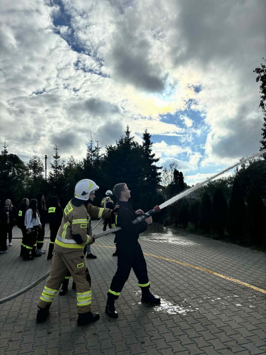 Dnia 29.09.2025r. odbyło się szkolenie dla młodzieży z rozszerzenia sportowo-mundurowego z udziałem strażaków z Ochotniczej Straży Pożarnej z Grabkowa. Spotkanie miało miejsce przy hali sportowej- na szkolnym parkingu, co pozwoliło na przeprowadzenie licznych pokazów praktycznych. Celem spotkania było przybliżenie pracy strażaka, zasad bezpieczeństwa pożarowego oraz nauka właściwego zachowania w sytuacjach zagrożenia.