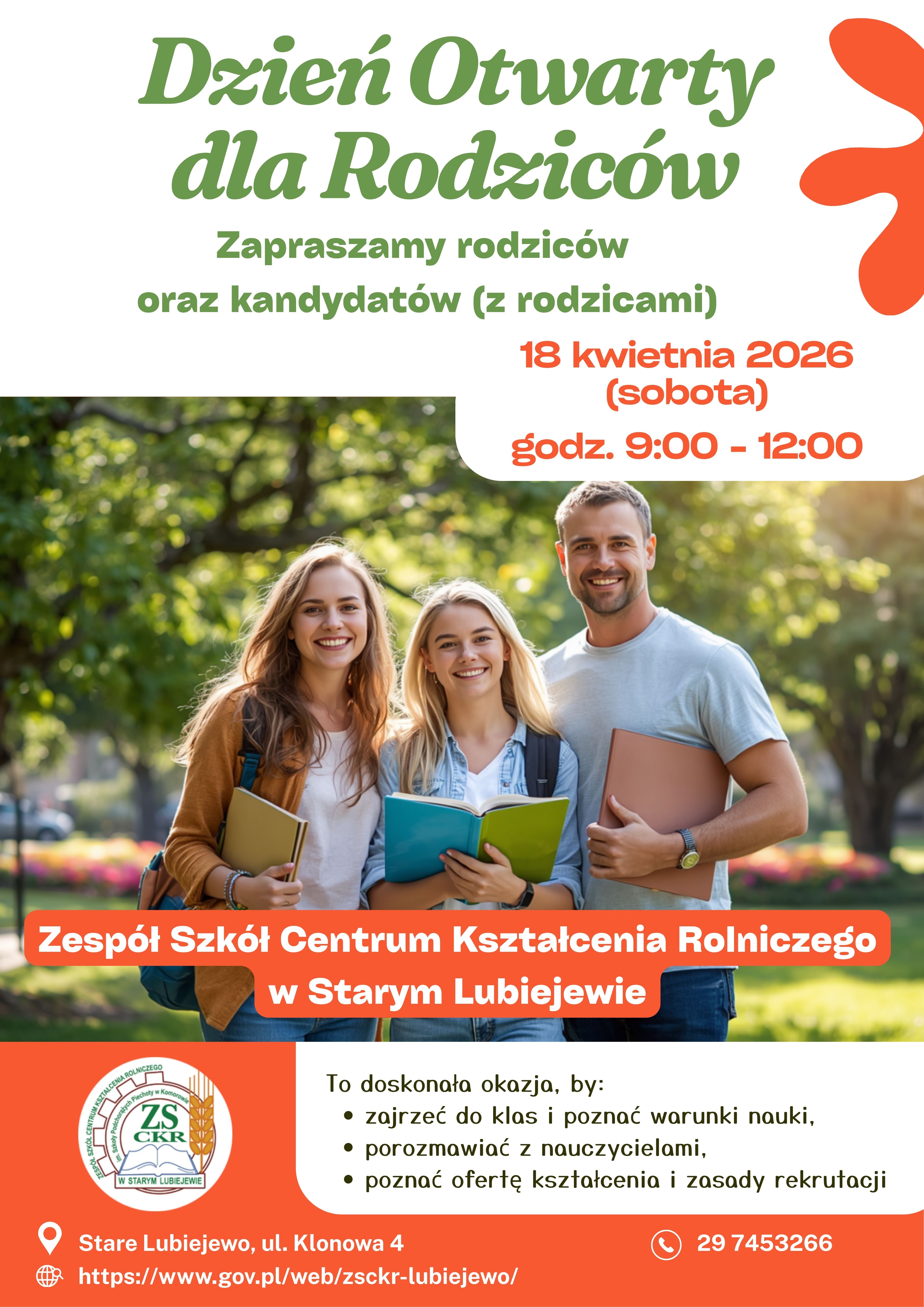Już w najbliższą sobotę, 18 kwietnia w godzinach 9:00 - 12:00, zapraszamy rodziców oraz kandydatów (z rodzicami) na Dzień Otwarty. To doskonała okazja, by: zajrzeć do klas i poznać warunki nauki, porozmawiać z nauczycielami, poznać ofertę kształcenia i zasady rekrutacji.