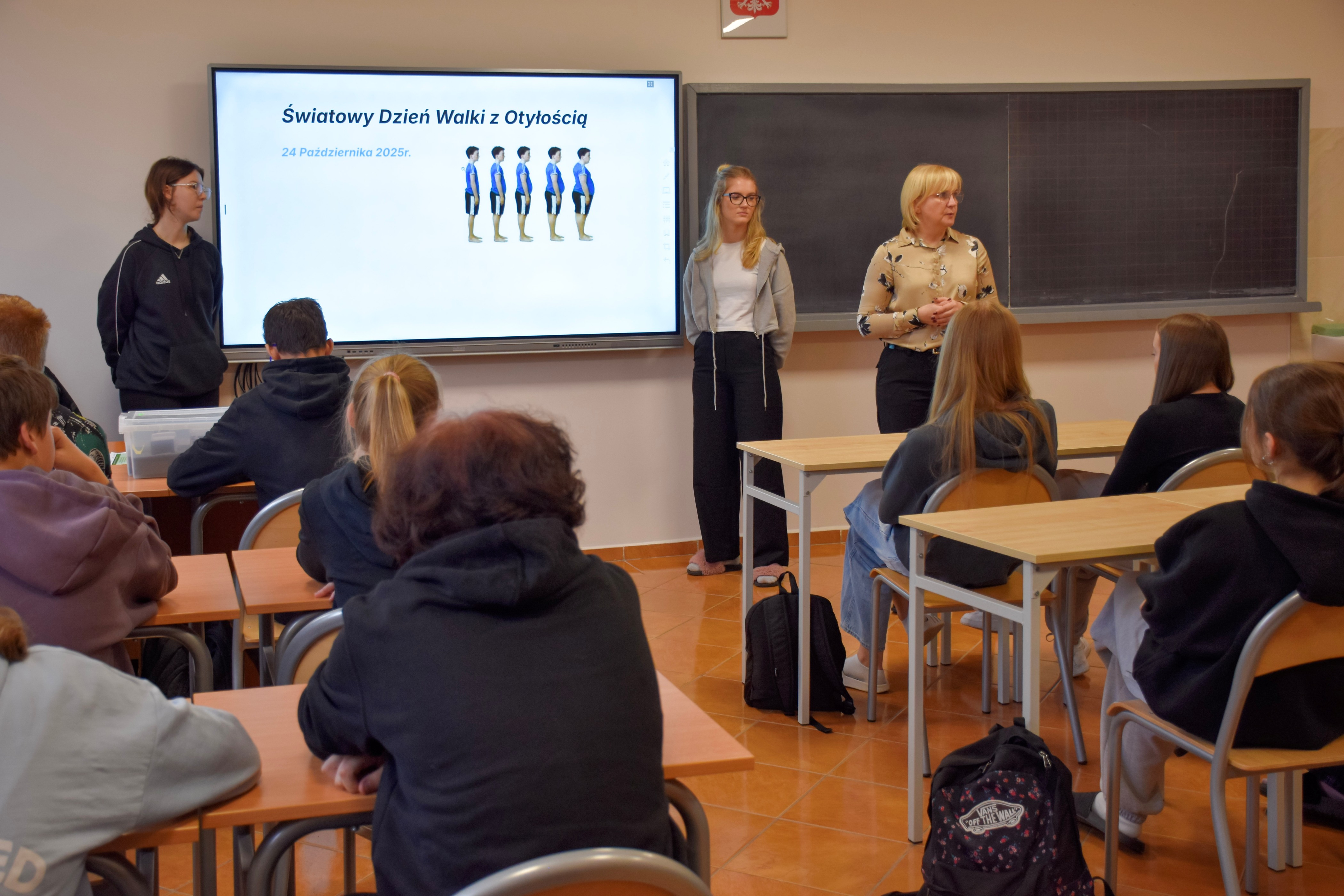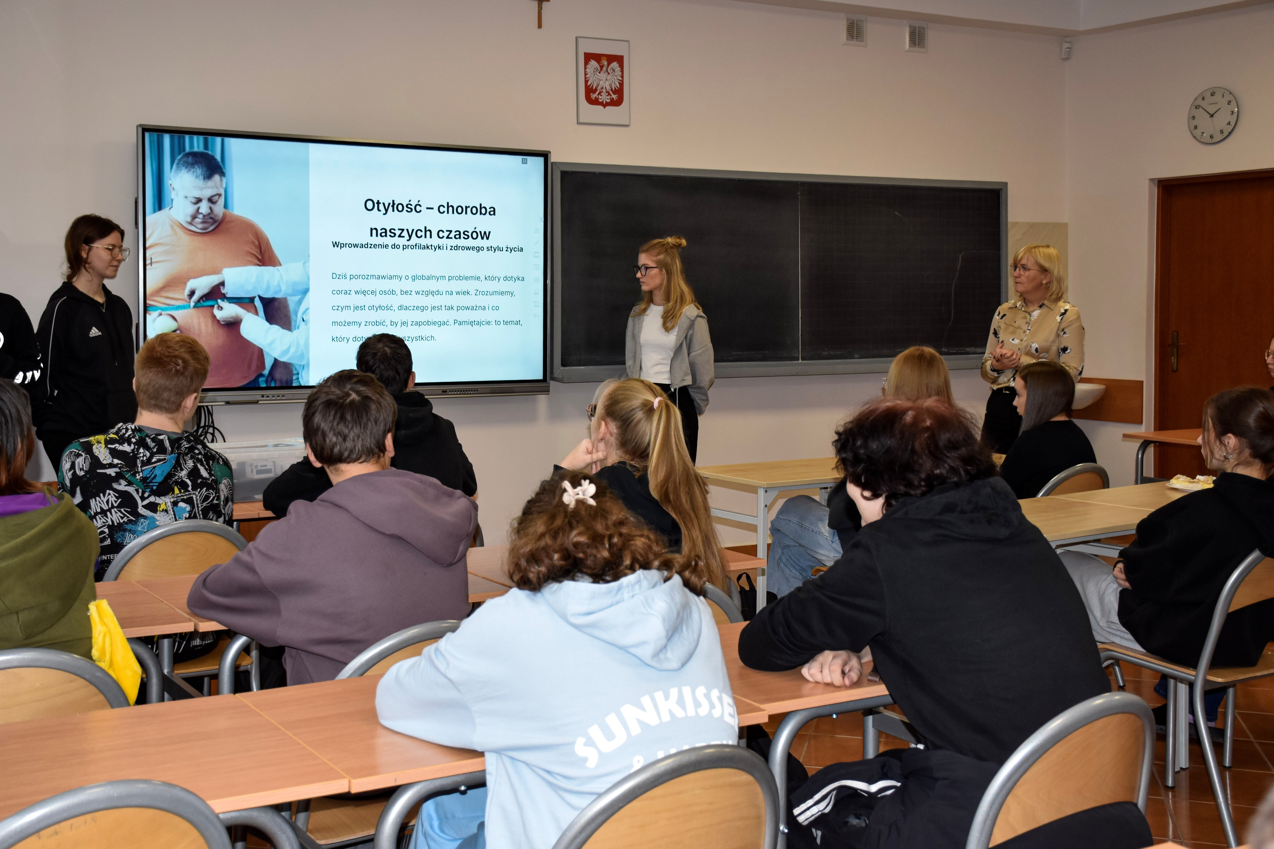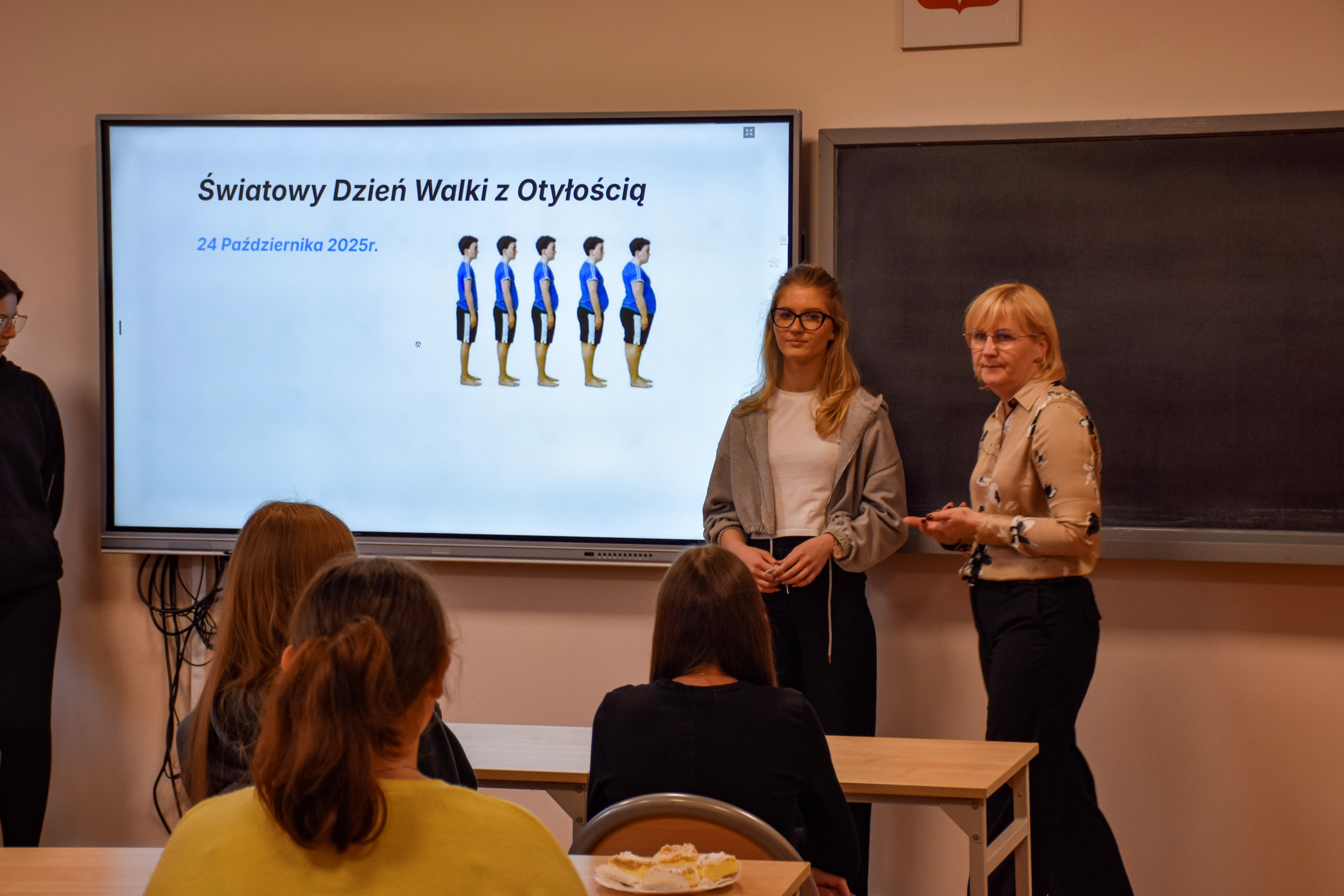 24 października włączyliśmy się w obchody Światowego Dnia Walki z Otyłością, by zwrócić uwagę na rosnący problem nadwagi i promować troskę o zdrowie poprzez właściwe odżywianie oraz regularny ruch. Uczniowie z klasy IV PT: Szymon Młynarczyk, Magda Wyszomierska oraz Alicja Trzaska przygotowali i przeprowadzili interesującą prelekcję na temat otyłości oraz metod jej zwalczania. Spotkanie było dedykowane młodszym koleżankom i kolegom z klas: I PTH, I BBA oraz II BBA.