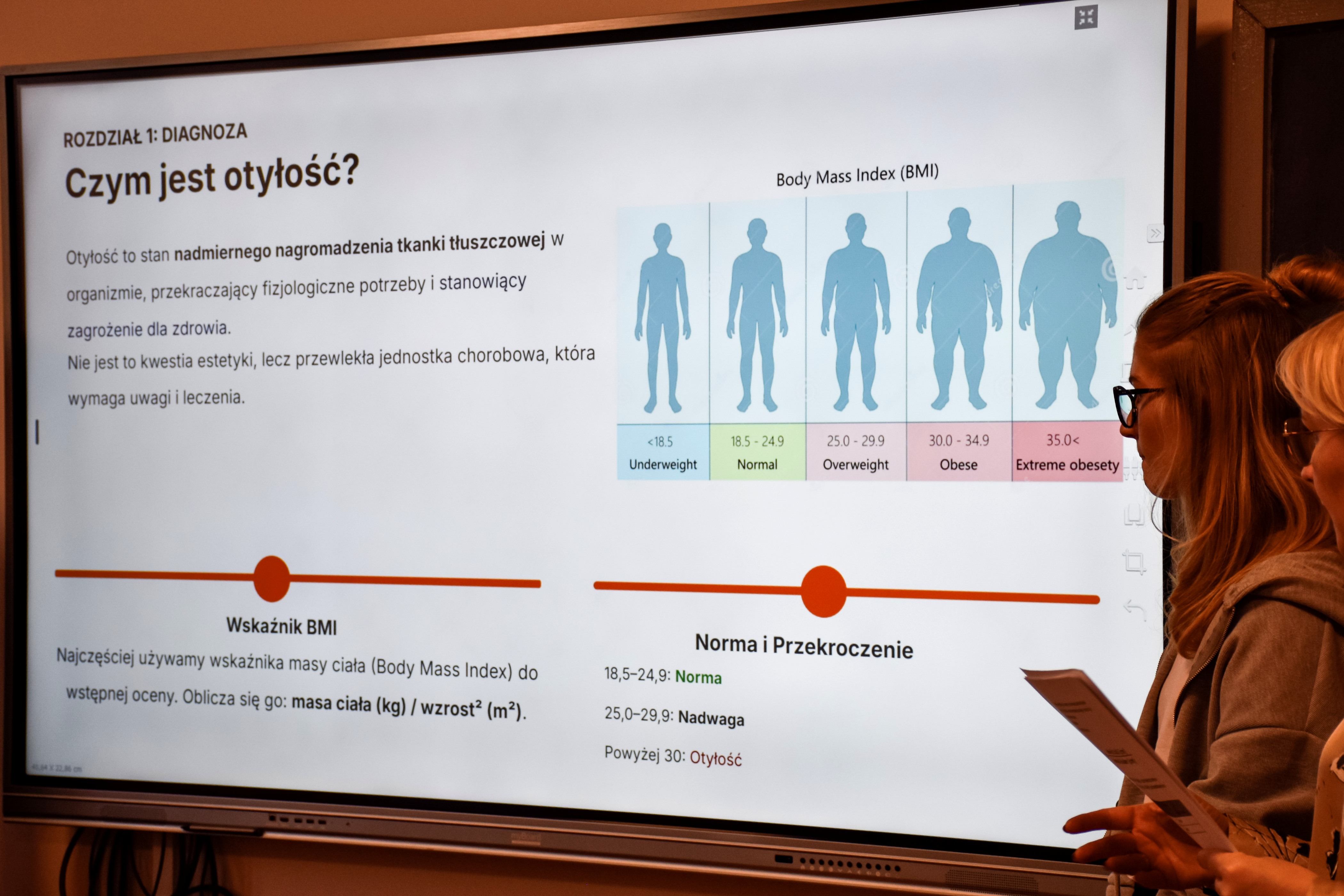 Nie zabrakło również części praktycznej, podczas której uczniowie zapoznali swoich młodszych kolegów z pojęciami BMI (Body Mass Index) oraz WHR (Waist-Hip Ratio), które służą do oceny proporcji i składu ciała. Następnie przeprowadzono analizę składu ciała przy użyciu profesjonalnego analizatora, dzięki czemu uczestnicy mogli zobaczyć, jak w praktyce wygląda badanie poziomu tkanki tłuszczowej, masy mięśniowej czy nawodnienia organizmu.