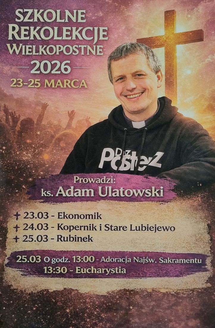 Zapraszamy Was serdecznie do udziału w rekolekcjach, które w dniach 23–25 marca 2026 r. poprowadzi ks. Adam Ulatowski. W tych dniach spotkamy się w naszych szkołach, aby wspólnie przeżyć czas refleksji, modlitwy i rozmowy o tym, co naprawdę ważne.
