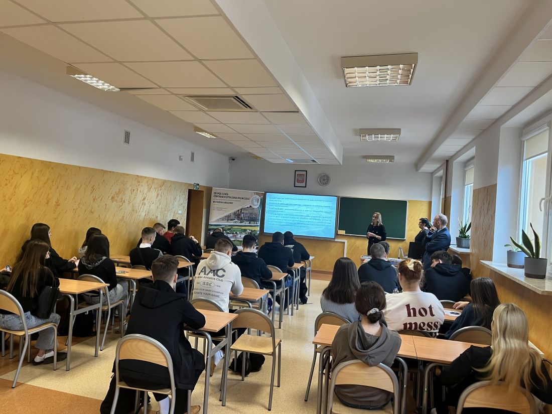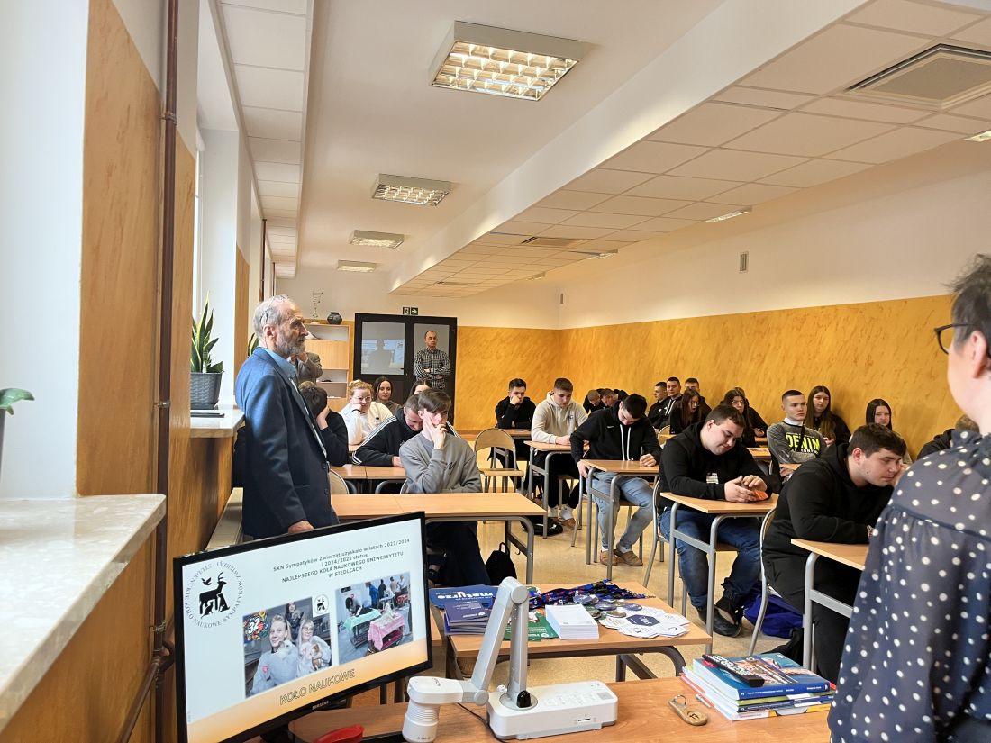 Podczas wizyty zaprezentowano ofertę edukacyjną precyzyjnie przygotowaną do kierunków kształcenia w naszej szkole. Przedstawiciele uczelni omówili studia związane z architekturą krajobrazu, rolnictwem, zootechniką oraz rybactwem i gospodarką wodną, wskazując jednocześnie konkretne możliwości rozwoju zawodowego po zakończeniu nauki. Uczniowie dowiedzieli się, jakie kompetencje zdobywają studenci, jakie są perspektywy zatrudnienia oraz w jakich sektorach rynku pracy mogą znaleźć zatrudnienie – od nowoczesnych gospodarstw rolnych, przez firmy projektujące tereny zielone, po instytucje doradcze i działalność naukowo-badawczą. Szczególne zainteresowanie wzbudziła zootechnika — autorski kierunek studiów o unikatowym charakterze w skali kraju, dostępny jedynie w ofercie nielicznych uczelni w Polsce. Delegacja szczegółowo omówiła również programy stypendialne dostępne dla studentów, przedstawiając możliwości wsparcia finansowego zarówno za wyniki w nauce, jak i za osiągnięcia sportowe oraz ze względu na sytuację socjalną. Uczniowie poznali także realne koszty zakwaterowania w akademiku, co pozwoliło im lepiej wyobrazić sobie organizację życia studenckiego. Dużo uwagi poświęcono działalności klubów i kół naukowych funkcjonujących przy UwS, podkreślając, że studia to nie tylko nauka, ale również rozwijanie pasji, udział w projektach badawczych, integracja i budowanie relacji, które często procentują w przyszłej karierze zawodowej.