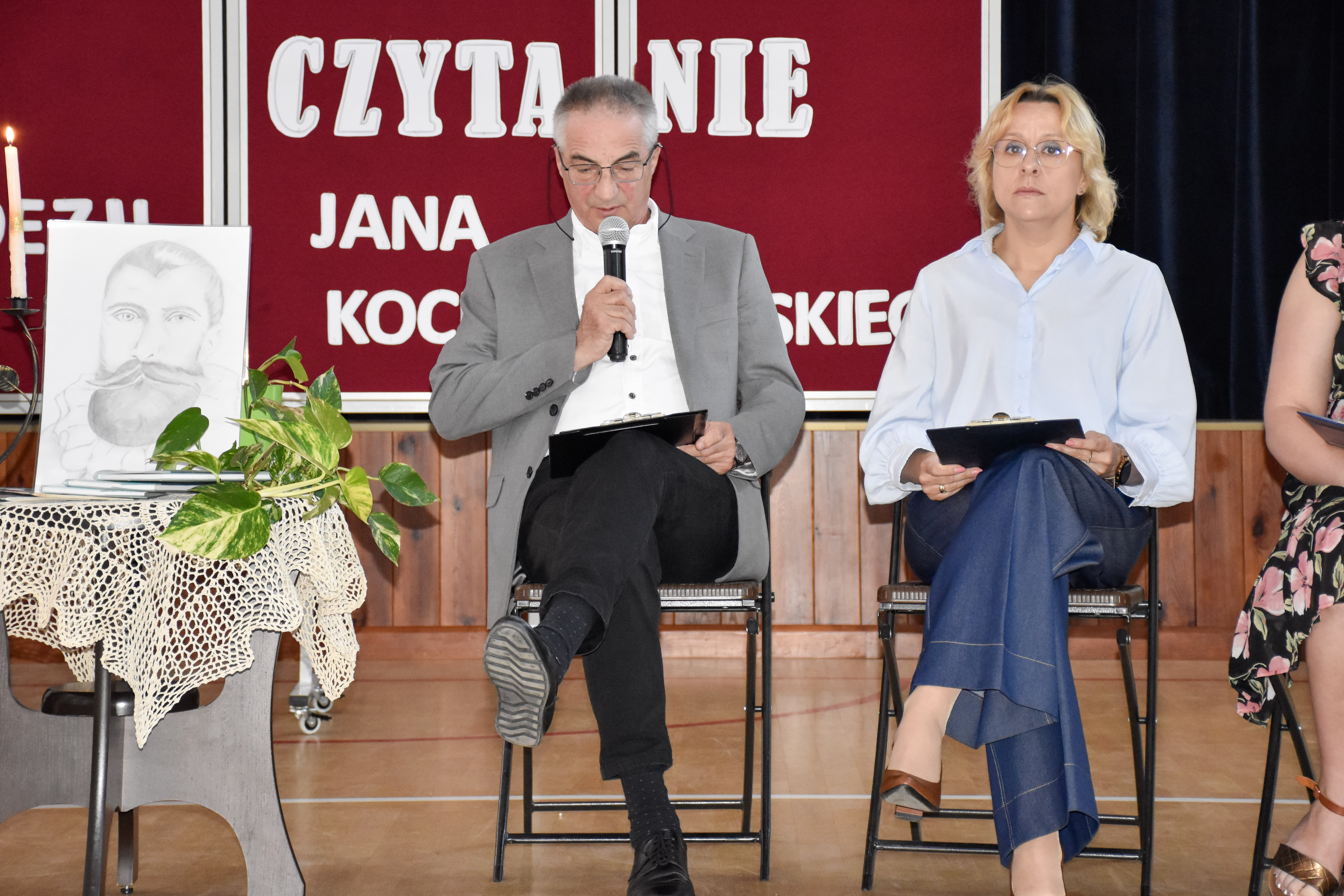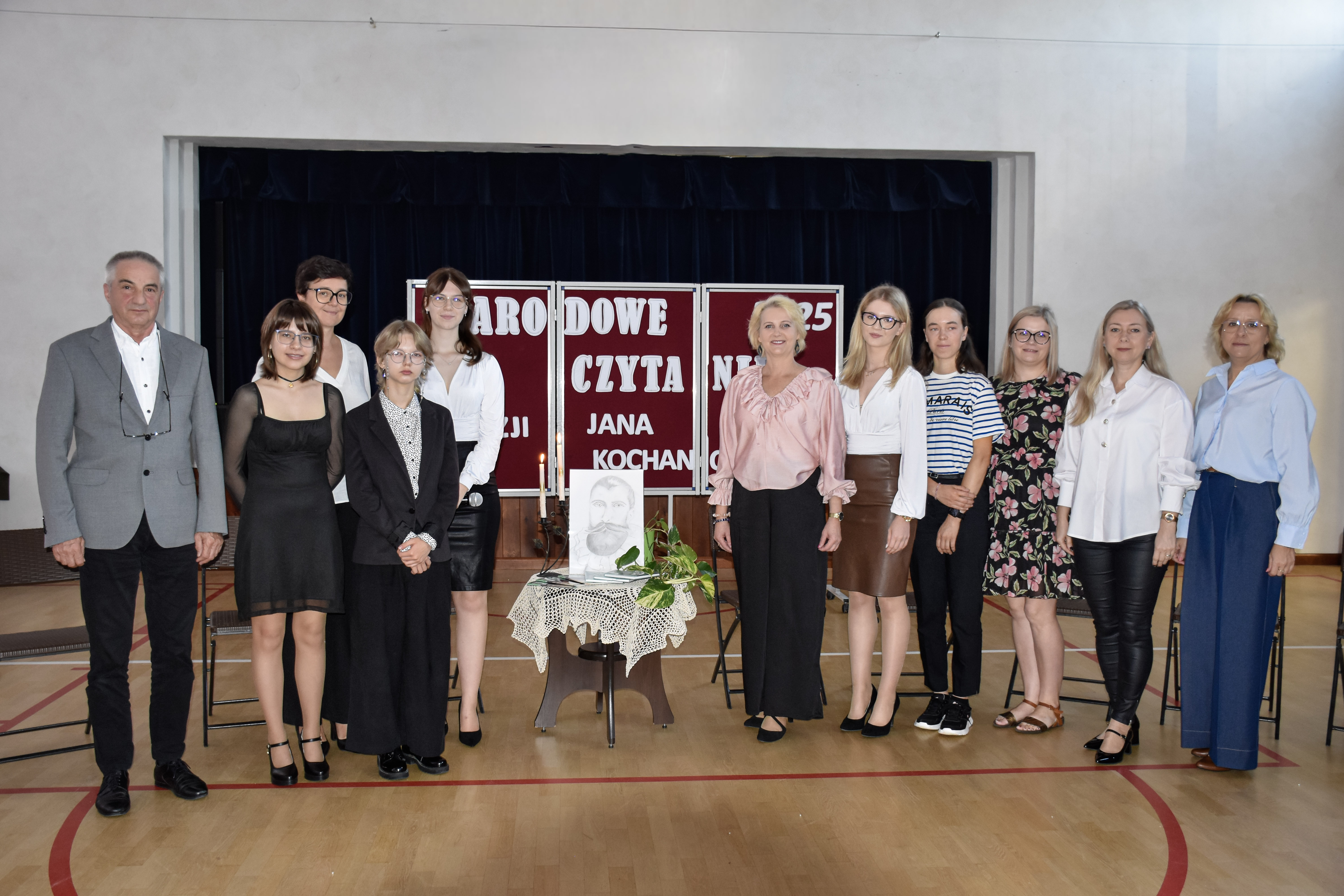 Uroczystą chwilę rozpoczął pan dyrektor Andrzej Sakowicz i przybliżył genezę powstania Narodowego Czytania. Zainspirowani ogólnopolską akcją uczestnicy czytali poezję „wielkiego mistrza słowa” i „ojca poezji polskiej” - Jana Kochanowskiego. Poezja Jana z Czarnolasu jest aktualna do dnia dzisiejszego, ponieważ porusza różnorodne tematy, począwszy od żartobliwych, refleksyjnych, politycznych, obyczajowych, moralnych i religijnych. W głębi zapalonych świec społeczność szkolna wysłuchała pieśni, fraszek i trenów w wykonaniu: dyrektora pana Andrzeja Sakowicza, wicedyrektor pani Marty Falbowskiej, pani Moniki Tyl, pani Moniki Stawierej, pani Anny Wierzbowskiej, pani Małgorzaty Malickiej oraz uczennic: Katarzyny Borowej, Zuzanny Przastek, Ewy Kesler i Julii Jastrzębskiej. Uroczystość z ogromnym wdziękiem poprowadziły uczennice: Magda Wyszomierska i Alicja Trzaska.