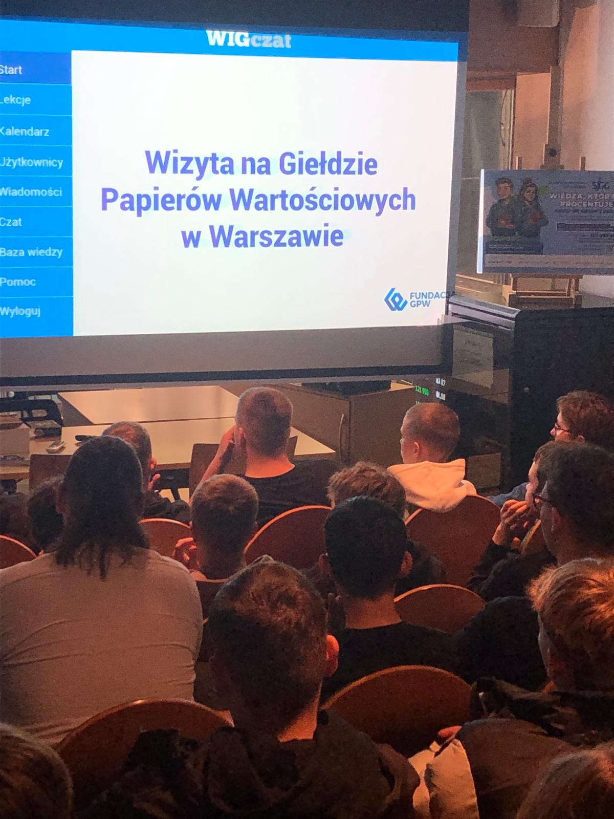 Punktem głównym wycieczki była Giełda Papierów Wartościowych. Podczas wizyty edukacyjnej na GPW uczniowie poznali fakty i zdarzenia z historii oraz życia giełdy, zapoznali się z materiałem filmowym na temat funkcjonowania giełdy i inwestowania na rynku kapitałowym, połączonym z prezentacją multimedialną oraz pogadanką animatora z Fundacji GPW. Zdobytą wiedzę utrwalili wypełniając, a następnie omawiając karty pracy. Zobaczyli również jak wygląda Sala Notowań oraz słynna figura byka – symbol hossy na giełdzie, czyli długotrwałego wzrostu cen papierów wartościowych dopuszczonych do obrotu. Wizyta przebiegła w miłej atmosferze i była atrakcyjną lekcją Biznesu i Zarzadzania. Ostatnim punktem pobytu w Warszawie było przejście pod Sejm RP i plac Trzech Krzyży.
