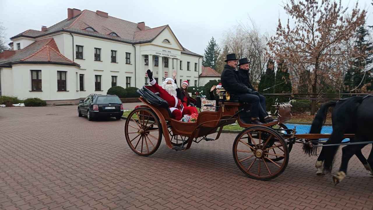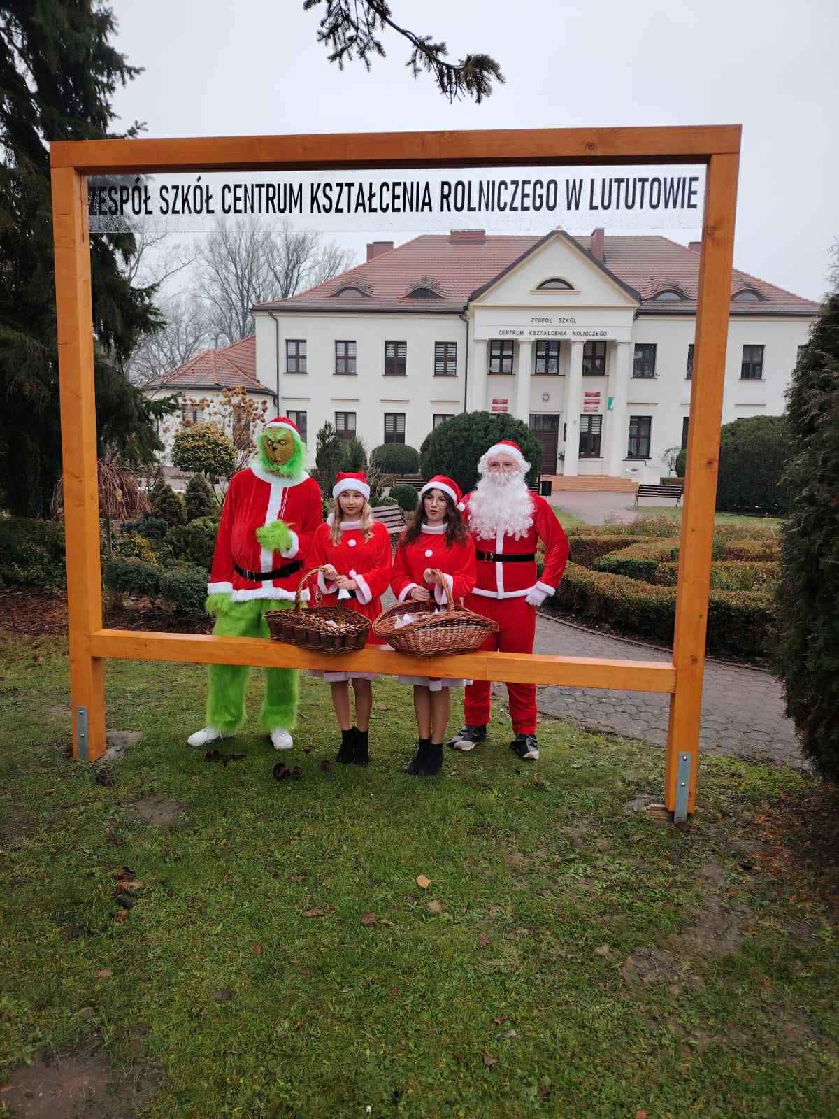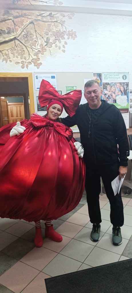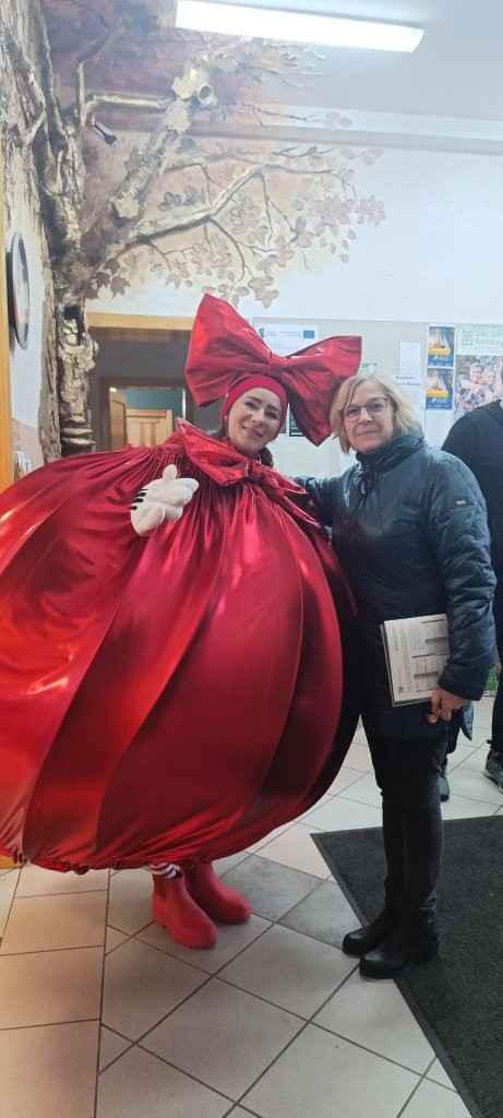 Zanim szkolny Mikołaj ruszył w kolejną misję, na parking podjechała prawdziwa bryczka, a w niej – niczym z zimowej baśni – pani wiceburmistrz Lututowa Magdalena Kałuża. Towarzyszyła jej pani dyrektor Przedszkola Publicznego w Lututowie Malwina Grzybek, w stroju pięknej czerwonej bombki choinkowej. Całe pojawienie się bryczki zrobiło furorę — uczniowie przystawali, robili zdjęcia, a nawet Grinch na chwilę zapomniał, że miał psuć atmosferę. Obie panie przekazały serdeczne życzenia świąteczne dla wszystkich: uczniów, nauczycieli i pracowników szkoły.
