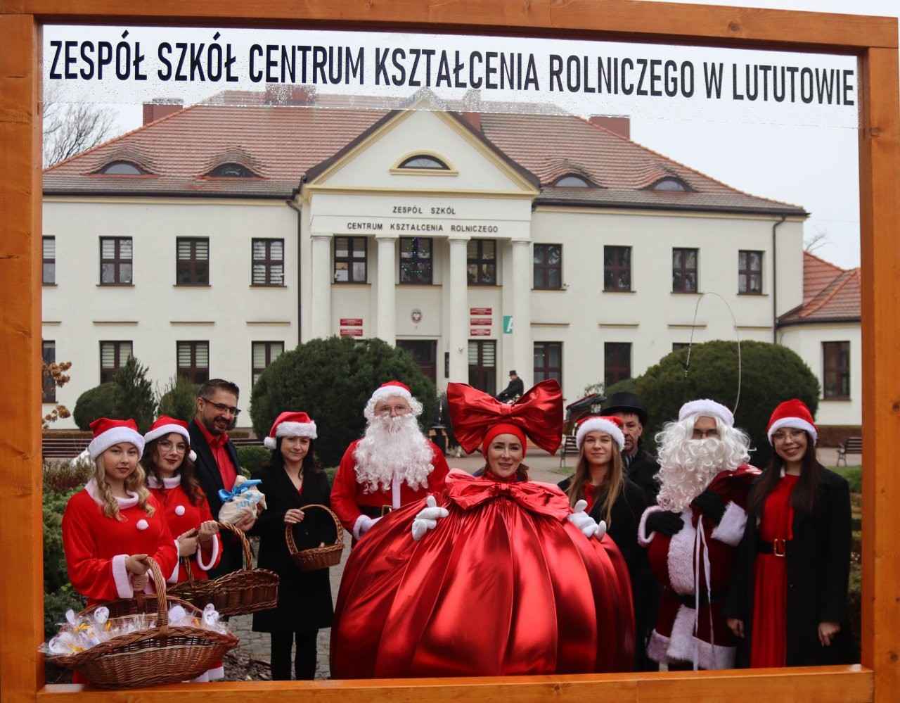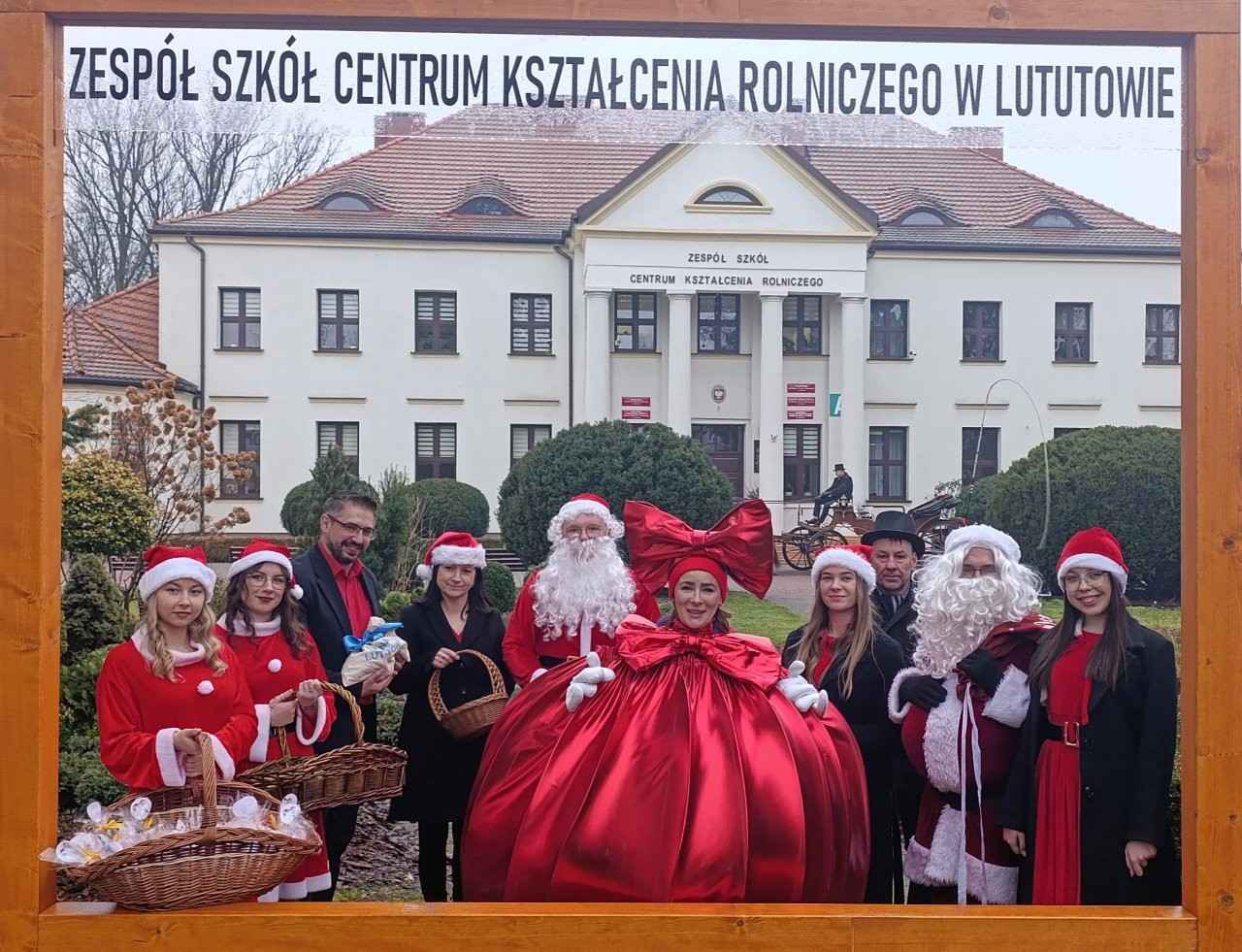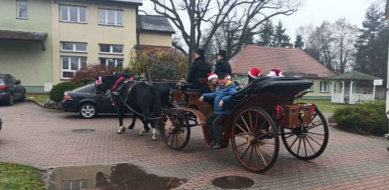 Zanim szkolny Mikołaj ruszył w kolejną misję, na parking podjechała prawdziwa bryczka, a w niej – niczym z zimowej baśni – pani wiceburmistrz Lututowa Magdalena Kałuża. Towarzyszyła jej pani dyrektor Przedszkola Publicznego w Lututowie Malwina Grzybek, w stroju pięknej czerwonej bombki choinkowej. Całe pojawienie się bryczki zrobiło furorę — uczniowie przystawali, robili zdjęcia, a nawet Grinch na chwilę zapomniał, że miał psuć atmosferę. Obie panie przekazały serdeczne życzenia świąteczne dla wszystkich: uczniów, nauczycieli i pracowników szkoły.