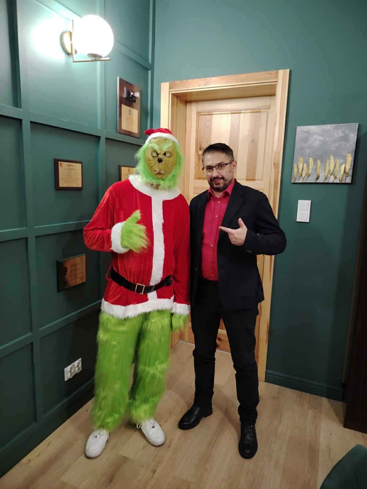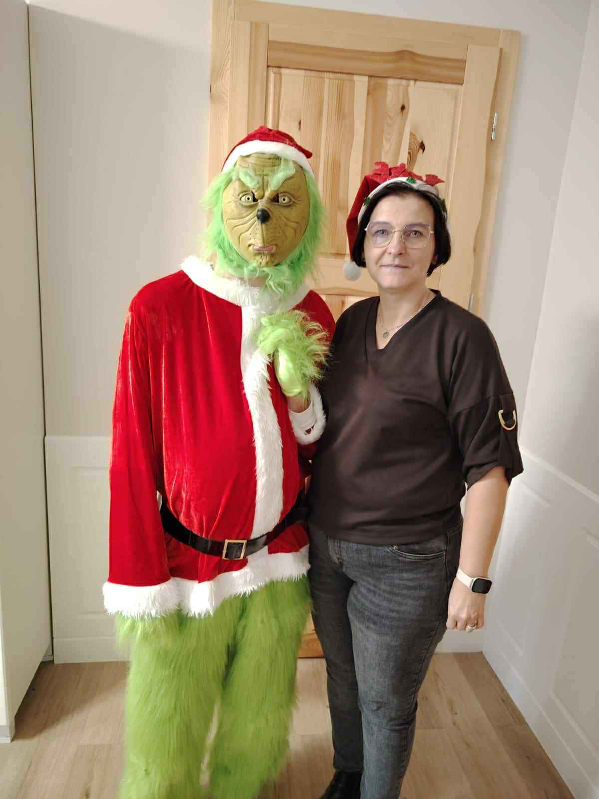 „Ho, ho, ho! Pamiętajcie, kochani — prezenty są ważne, ale uśmiech, życzliwość i dobre serce to największe skarby. I nie martwcie się o Grincha, ja się nim zajmę! Wesołych Świąt!”