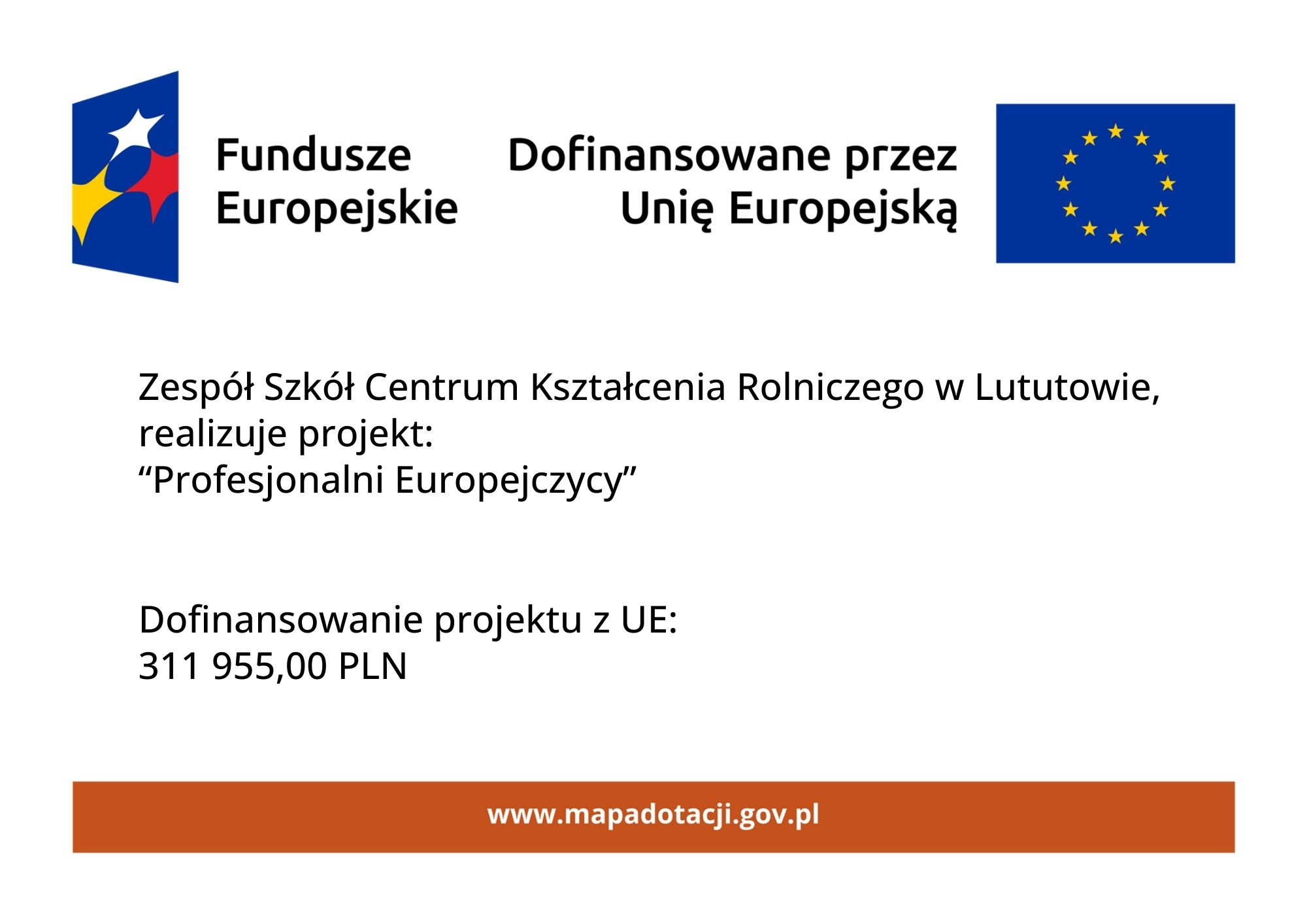 Przedsięwzięcie realizowane w ramach Akcji 1 „Mobilność edukacyjna” w sektorze Kształcenie i szkolenia zawodowe, w ramach projektu „Zagraniczna mobilność edukacyjna uczniów i absolwentów oraz kadry kształcenia zawodowego” realizowanego w programie Fundusze Europejskie dla Rozwoju Społecznego 2021-2027 współfinansowanego ze środków Europejskiego Funduszu Społecznego Plus.