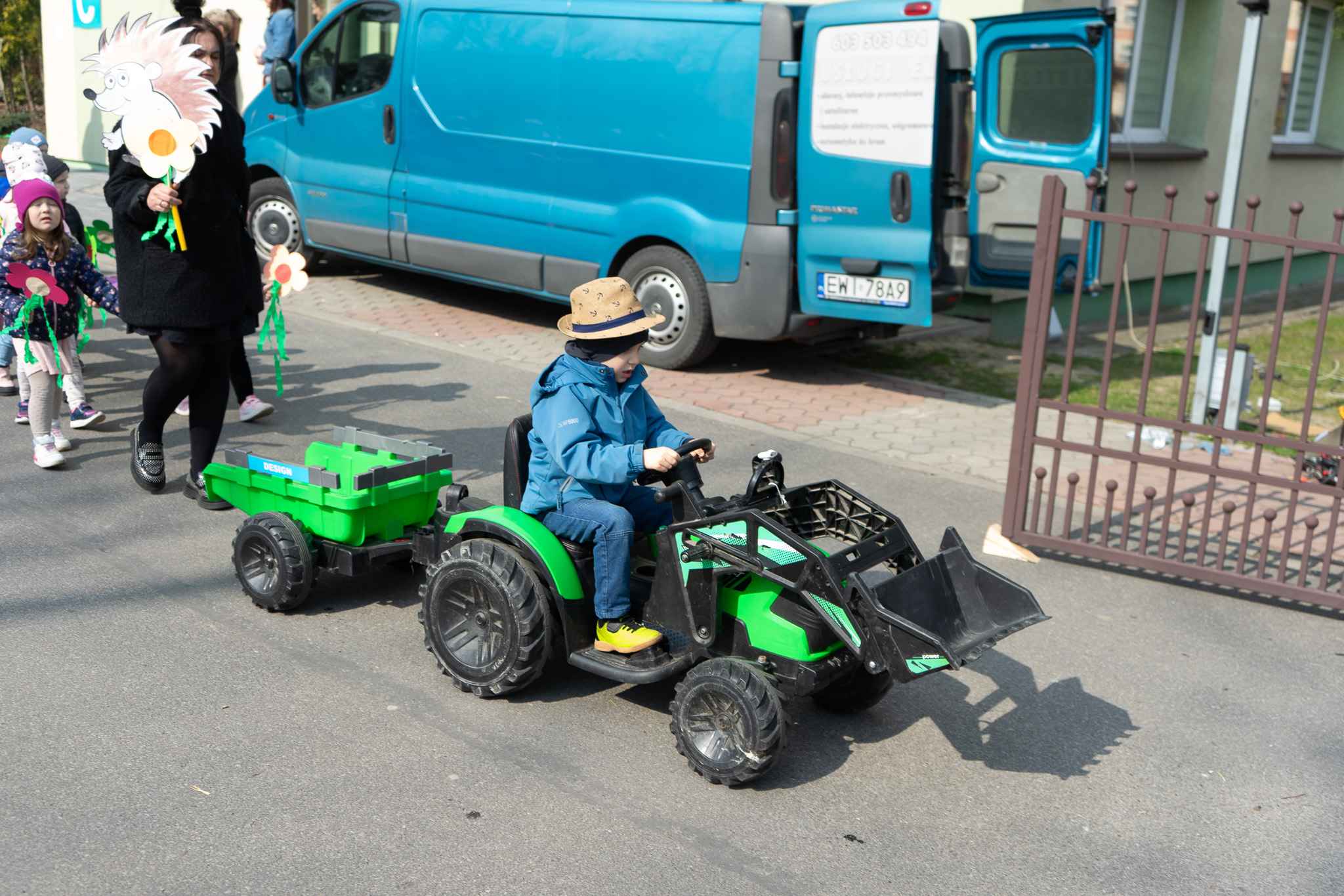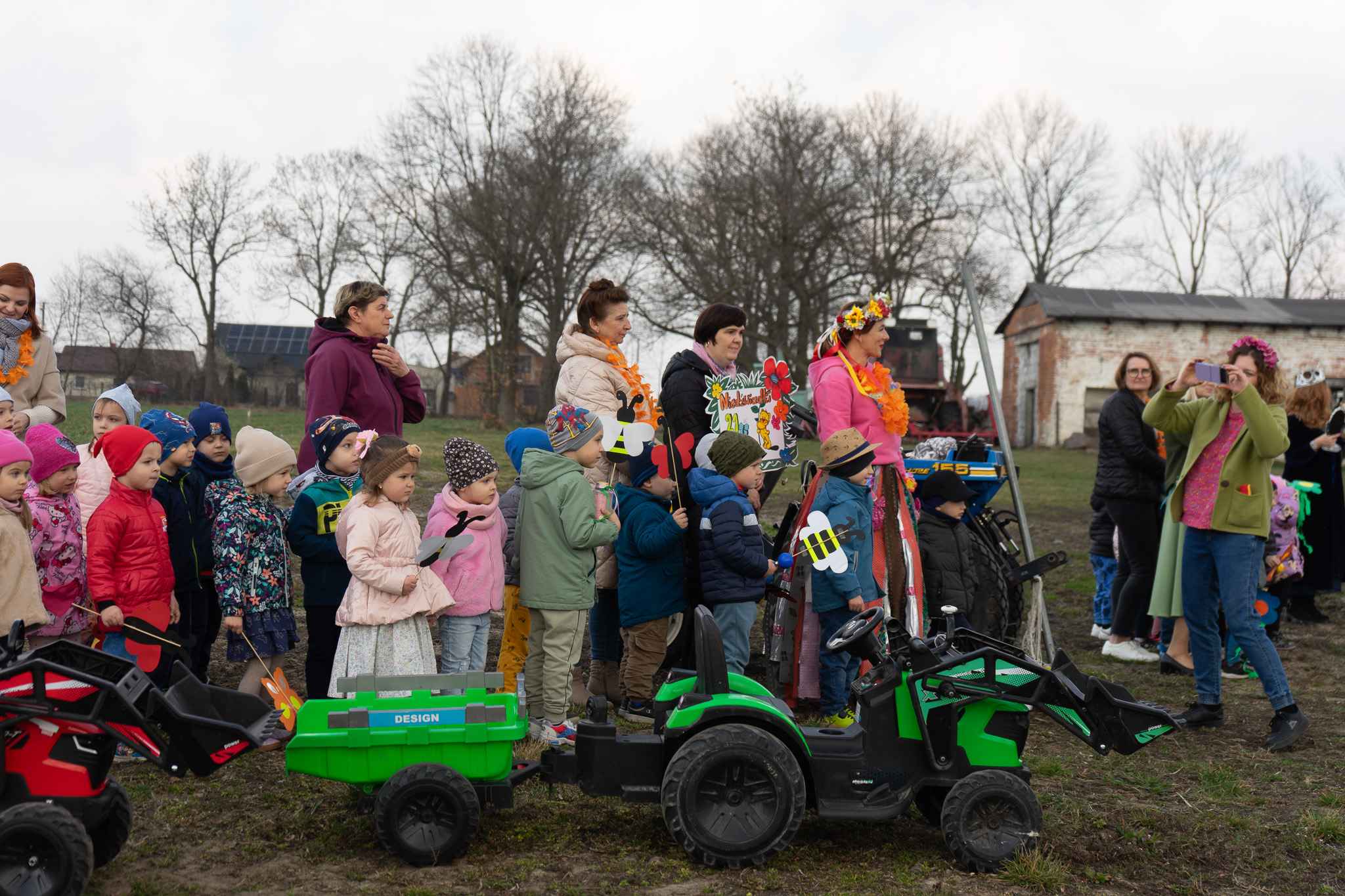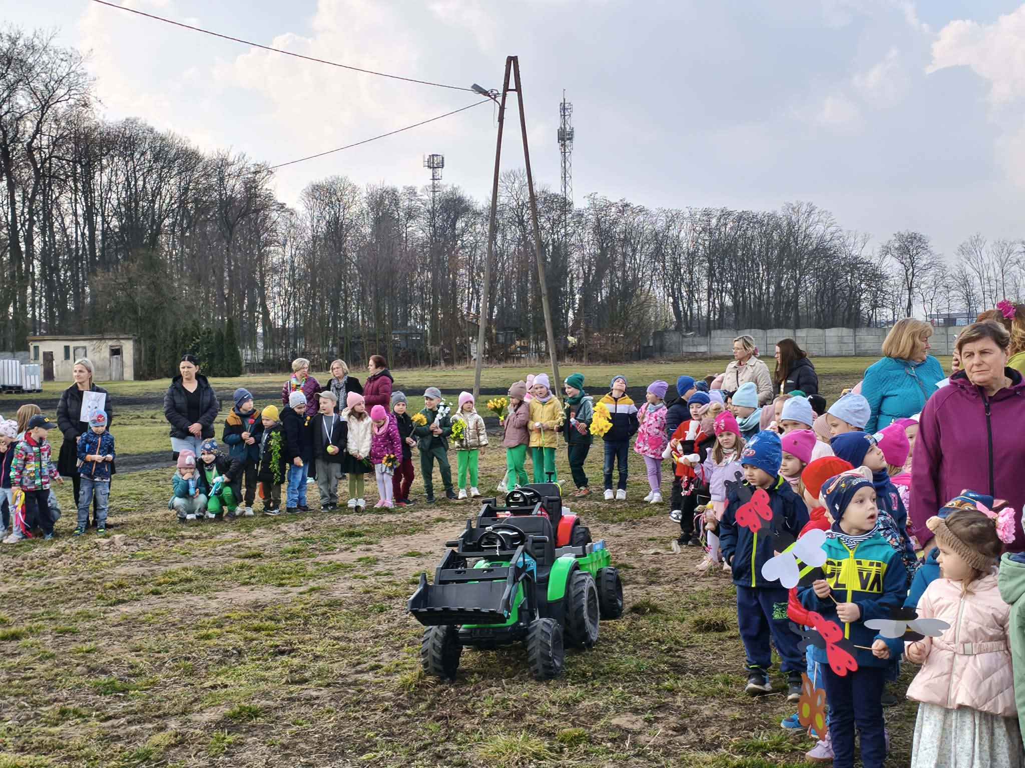Szczególnego uroku wydarzeniu dodała obecność honorowych gości – przedszkolaków, którzy pojawili się w kolorowych, wiosennych strojach. Dzieci niosły w rękach barwne kwiaty oraz własnoręcznie wykonane grzechotki, wprowadzając radosną atmosferę. Na czele grupy pojawiła się pani dyrektor Malwina Grzybek, która przyjechała małym traktorkiem w asyście dwóch przedszkolaków – co więcej, mali uczestnicy również prowadzili swoje małe traktorki, wzbudzając podziw wśród uczestników wydarzenia. Poszczególne grupy dzieci prowadziły ich wychowawczynie. Towarzyszyła im także ich własna Marzanna, przygotowana specjalnie na tę okazję.