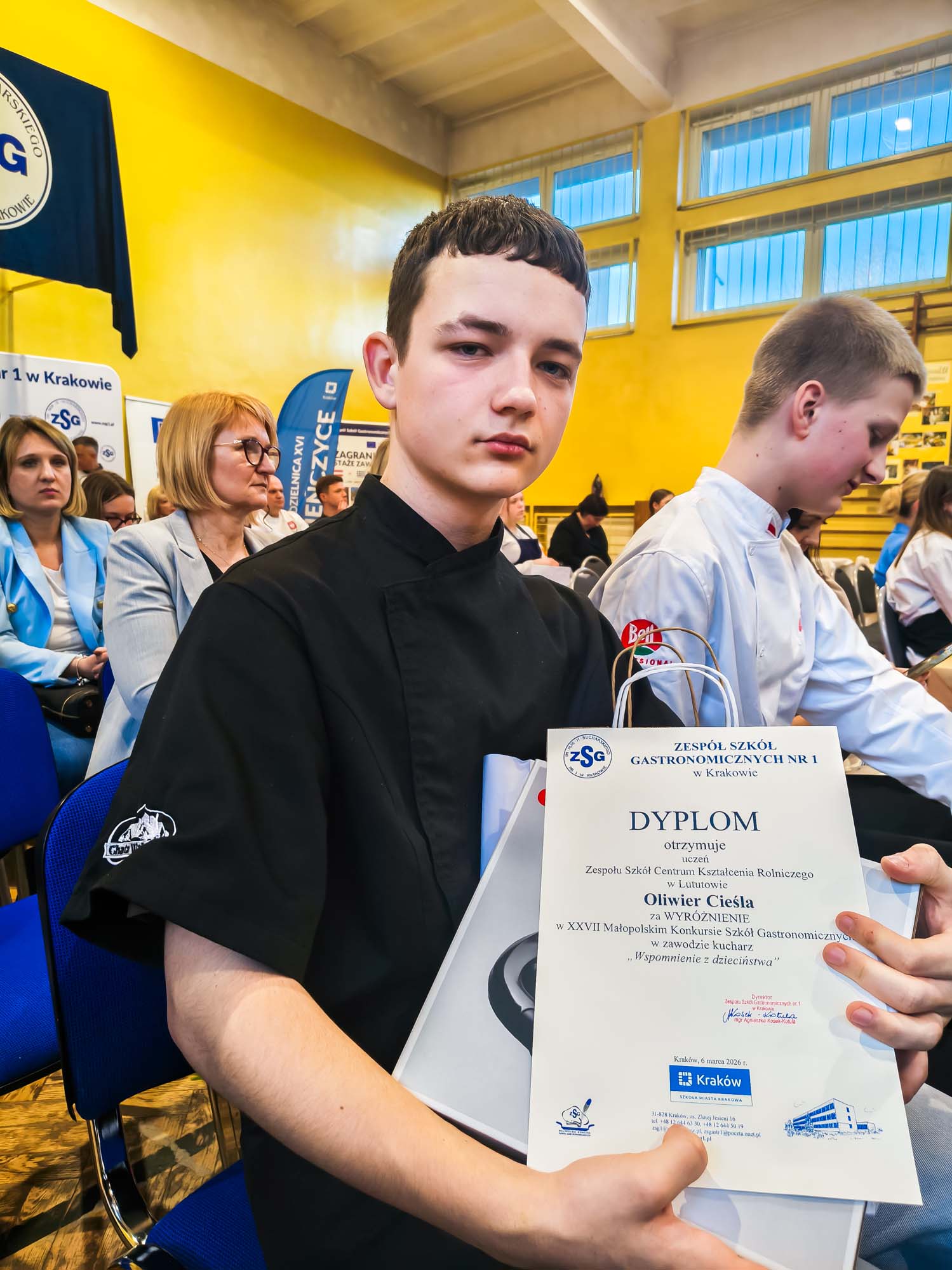 Uczeń Zespołu Szkół Centrum Kształcenia Rolniczego w Lututowie – Oliwier Cieśla z klasy 3 Technikum w zawodzie technik żywienia i usług gastronomicznych dostał się do drugiego etapu XXVII Małopolskiego Konkursu Szkół Gastronomicznych „Wspomnienie z dzieciństwa”, który odbył się 6 marca 2026 r. w ZSG nr 1 w Krakowie. Do konkursu o zasięgu międzynarodowym przygotowała ucznia nauczycielka przedmiotów gastronomicznych Marzena Maciejewska.