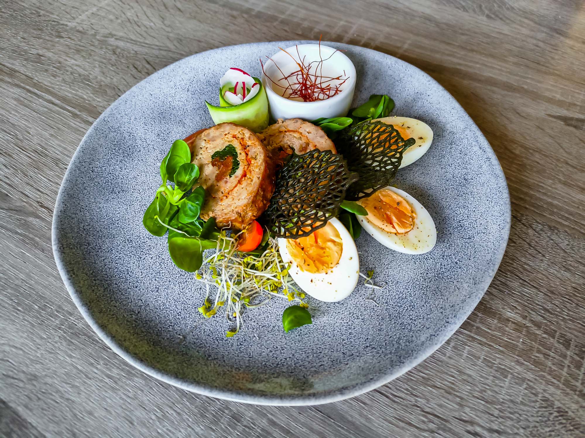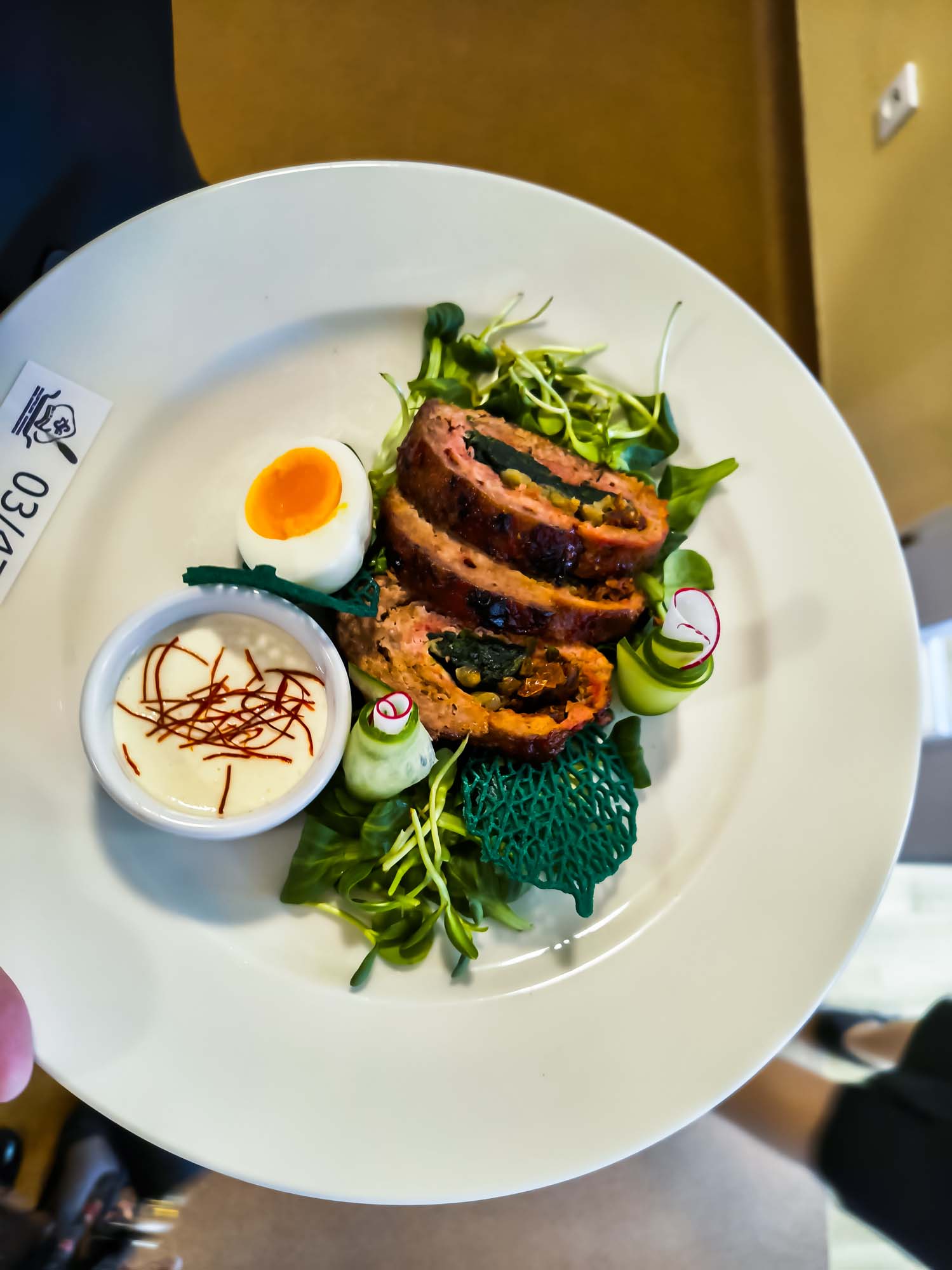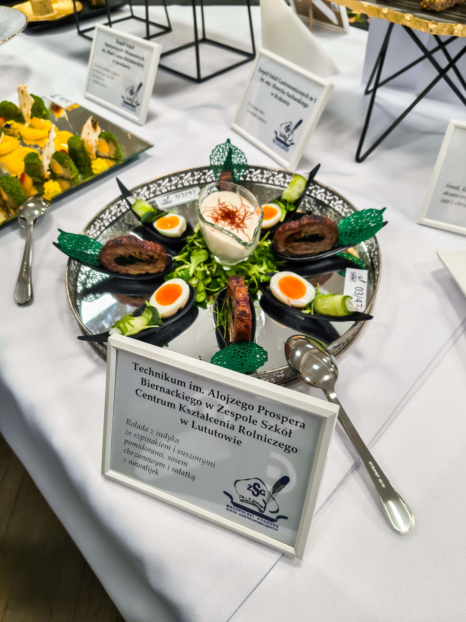 Tematem przewodnim było zrobienie zakąski zimnej z mięsa drobiowego oraz jaj i chrzanu. Oliwier wykonał zadanie obowiązkowe – rozbiór tuszki z kurczaka oraz roladę z indyka ze szpinakiem i suszonymi pomidorami, sosem chrzanowym i sałatką z nowalijek. Nasz uczeń wydał potrawę na dwóch talerzach jednoporcjowo do oceny przez jury degustacyjne oraz na zastawie wieloporcjowej w ilości co najmniej 5 porcji, w czasie nieprzekraczającym 180 min. Komisja konkursowa doceniła pracę Oliwiera za smak, technikę wykonania, estetykę podania oraz nawiązanie do kuchni minionego czasu. Potrawa zaprezentowana na stole bankietowym, cieszyła się dużym zainteresowaniem uczestników i zaproszonych gości.