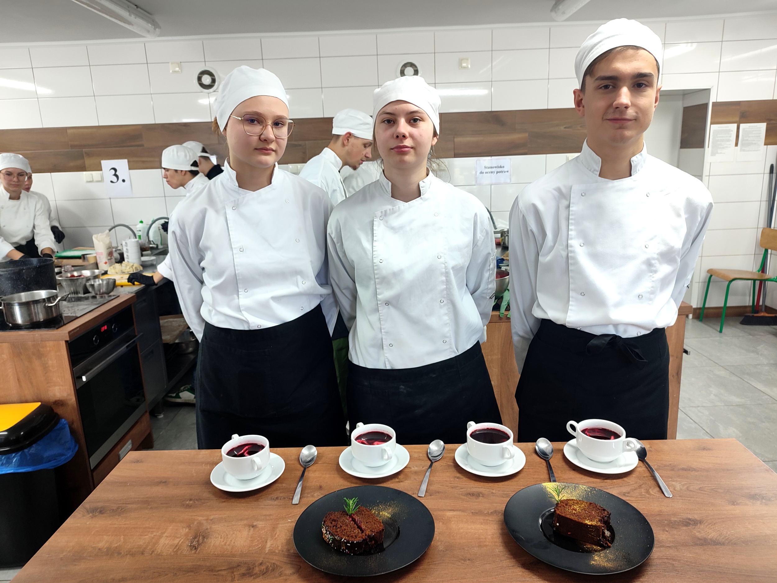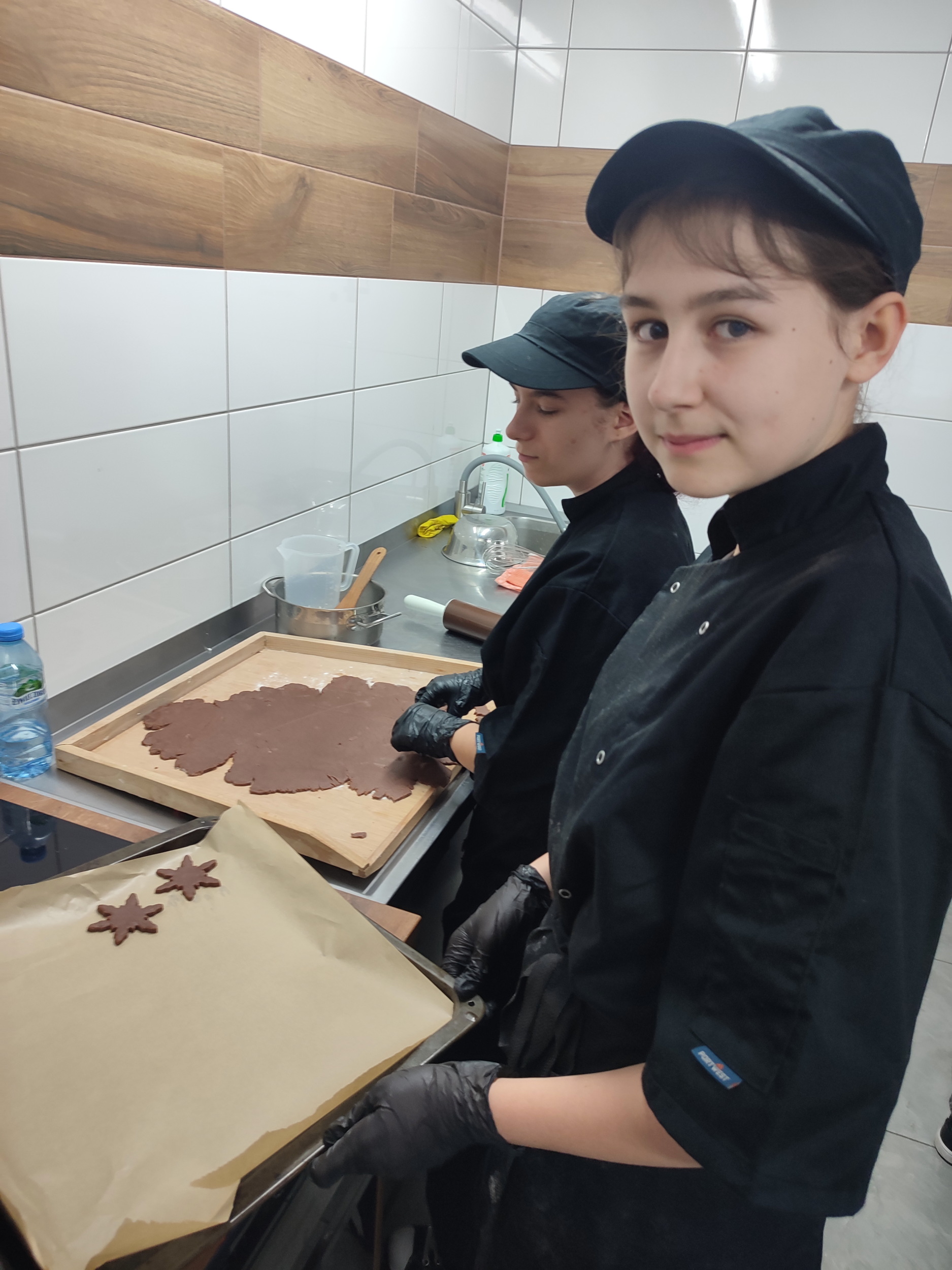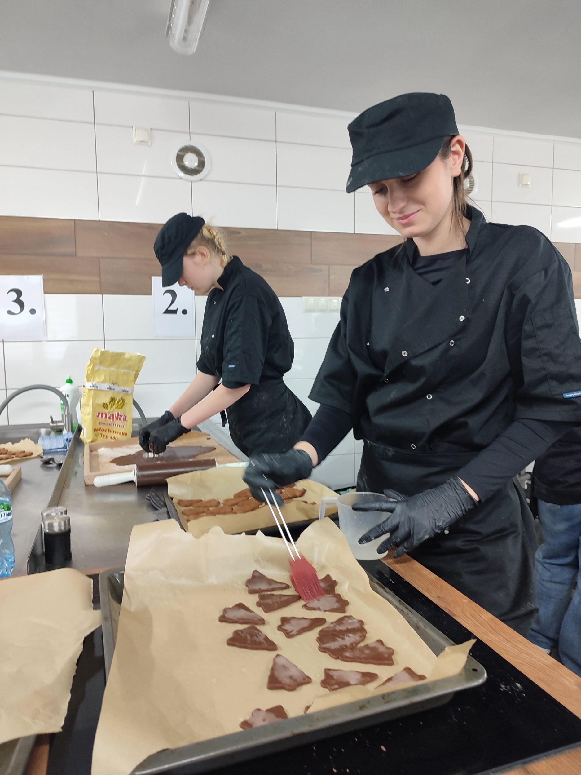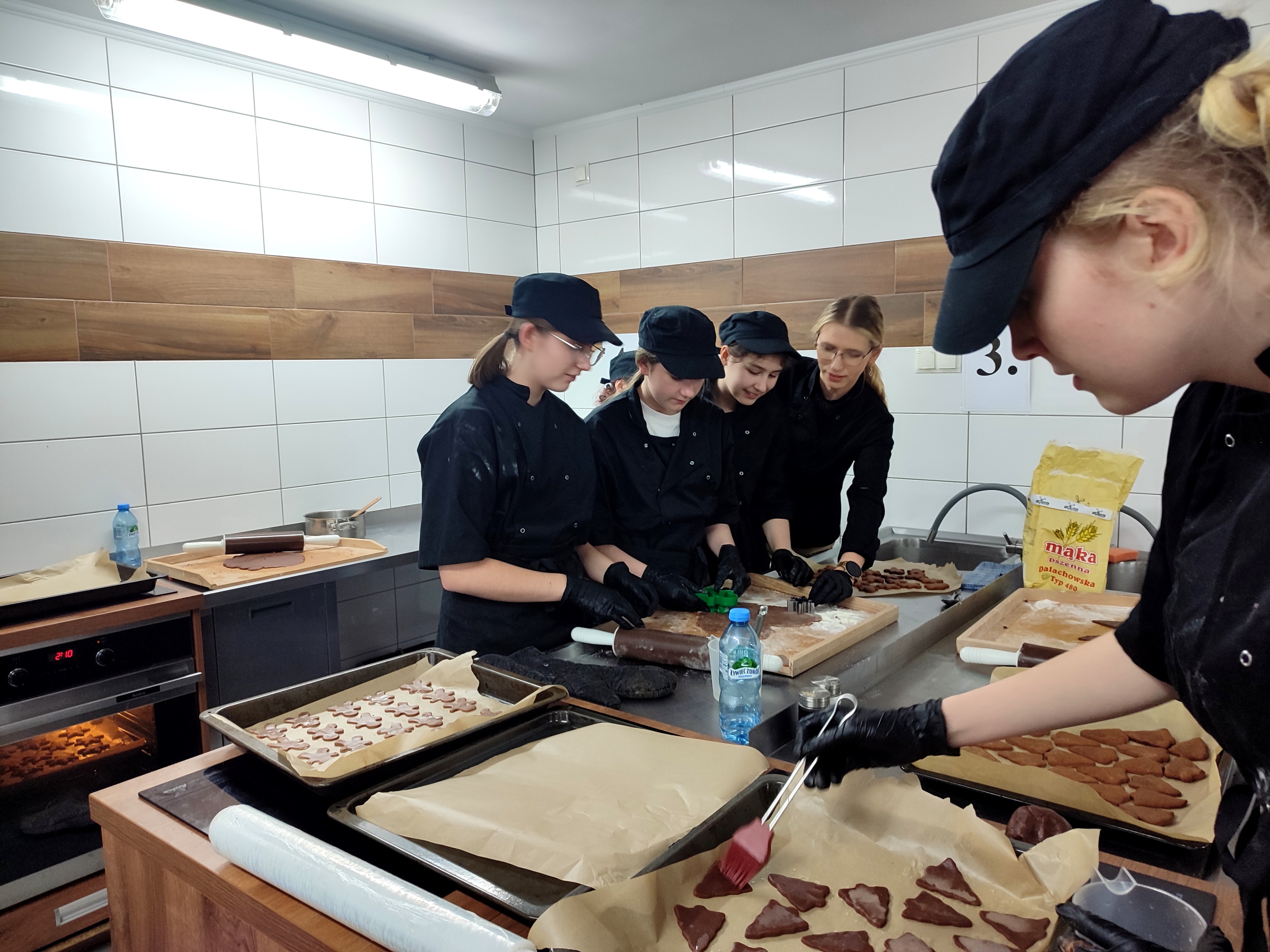 W dniach poprzedzających święta Bożego Narodzenia w naszej szkolnej pracowni gastronomicznej unosił się wyjątkowy aromat – zapach korzennych przypraw, wanilii, pomarańczy oraz pieczonych ciast. Uczniowie technikum w zawodzie technik żywienia i usług gastronomicznych przygotowywali tradycyjne potrawy świąteczne, doskonaląc swoje umiejętności kulinarne i organizacyjne. Pod czujnym okiem nauczycielek praktycznej nauki zawodu młodzi kucharze tworzyli zarówno klasyczne dania kuchni polskiej, jak i ich nowoczesne warianty. Na stołach pojawiły się m.in. uszka z grzybami, barszcz czerwony. Nie zabrakło również słodkości – uczniowie przygotowywali pierniki przekładane i pierniki sztukowe do ozdabiania.