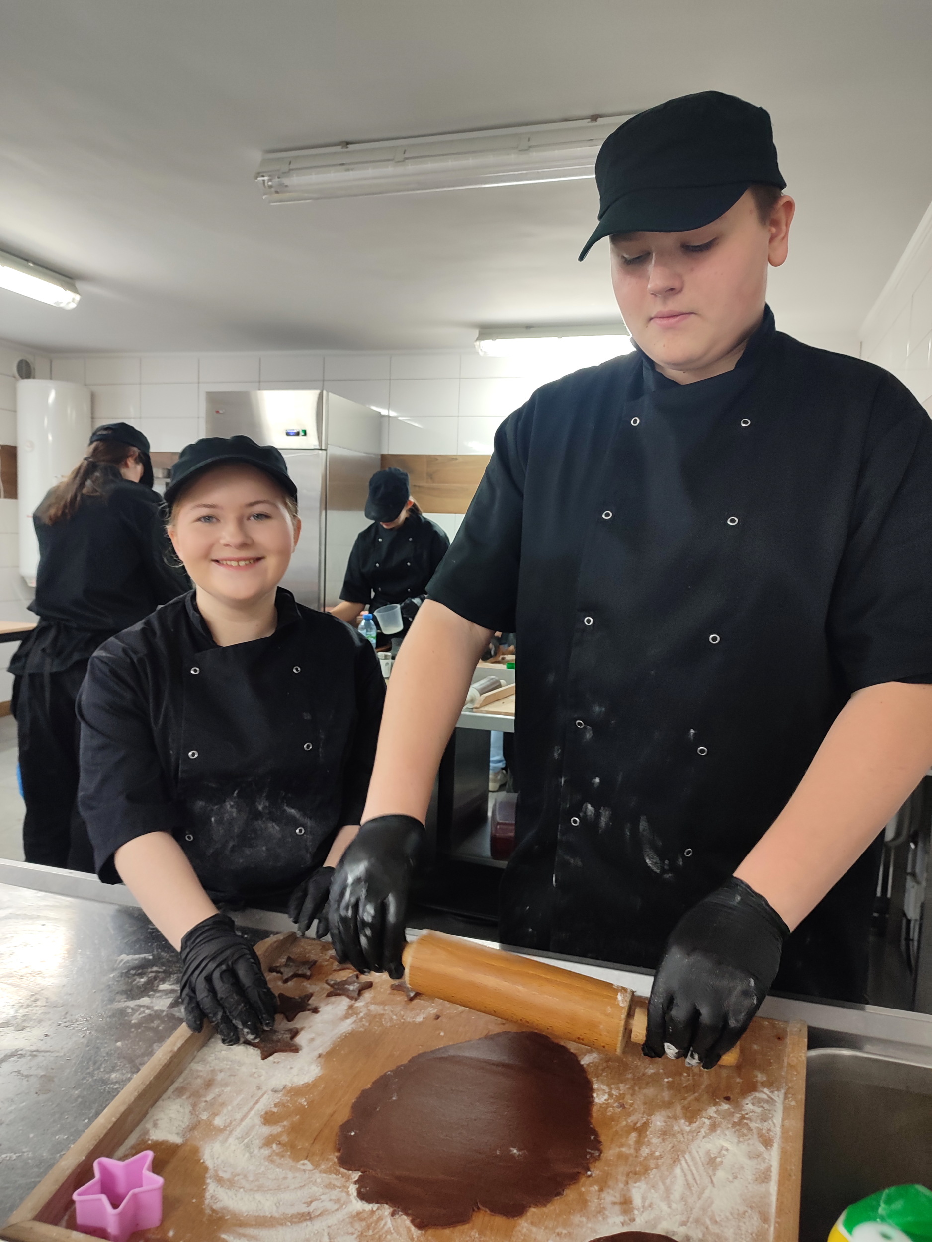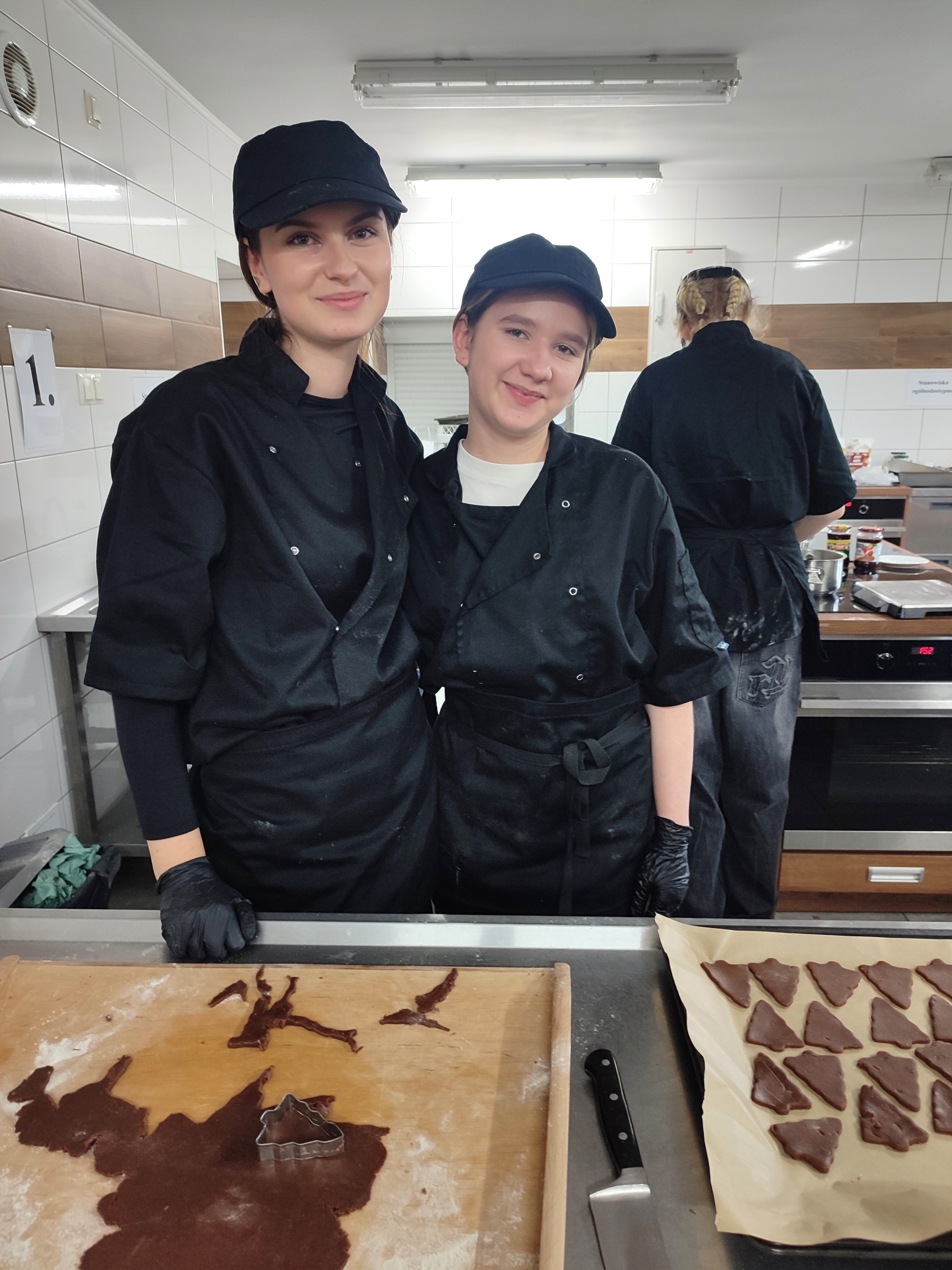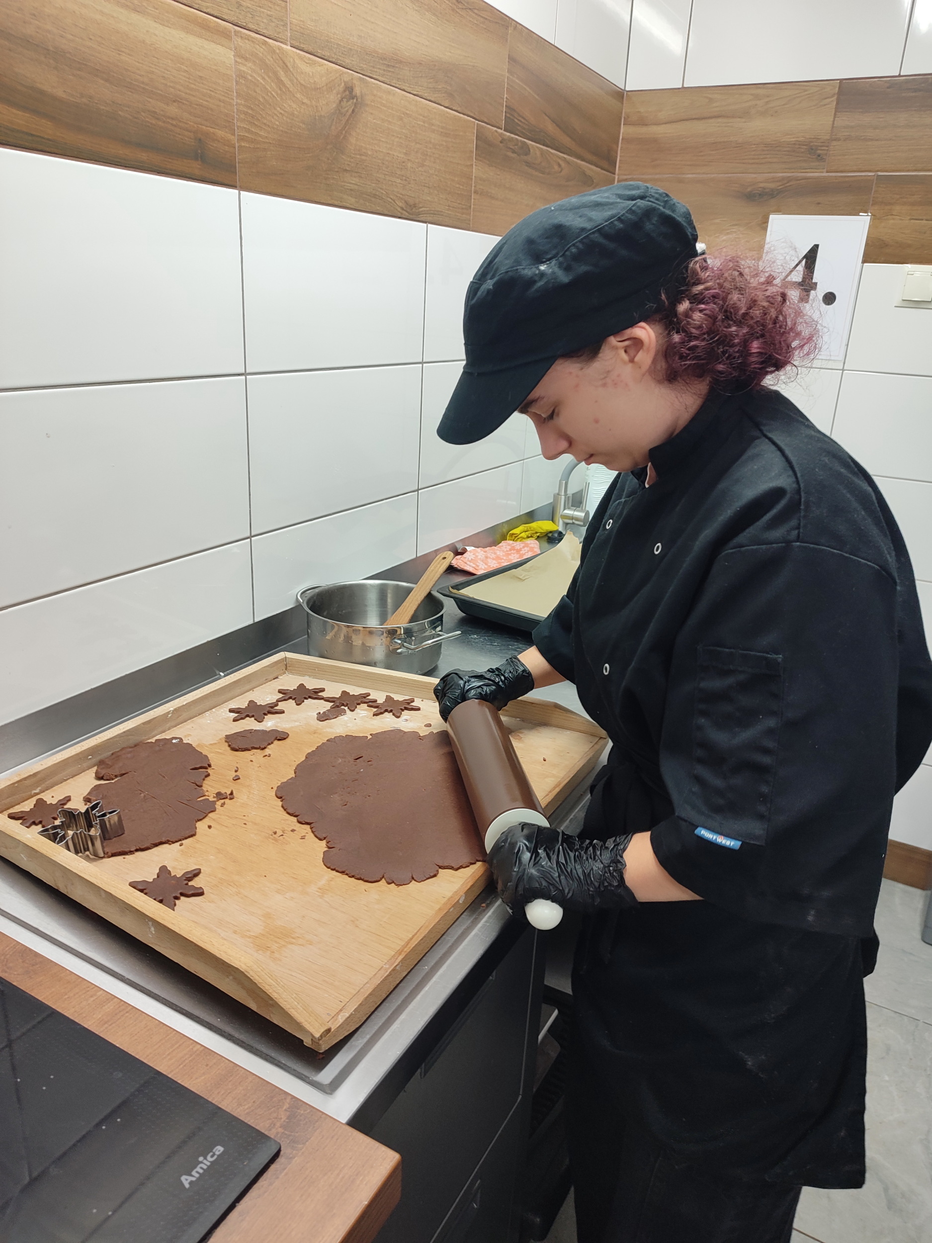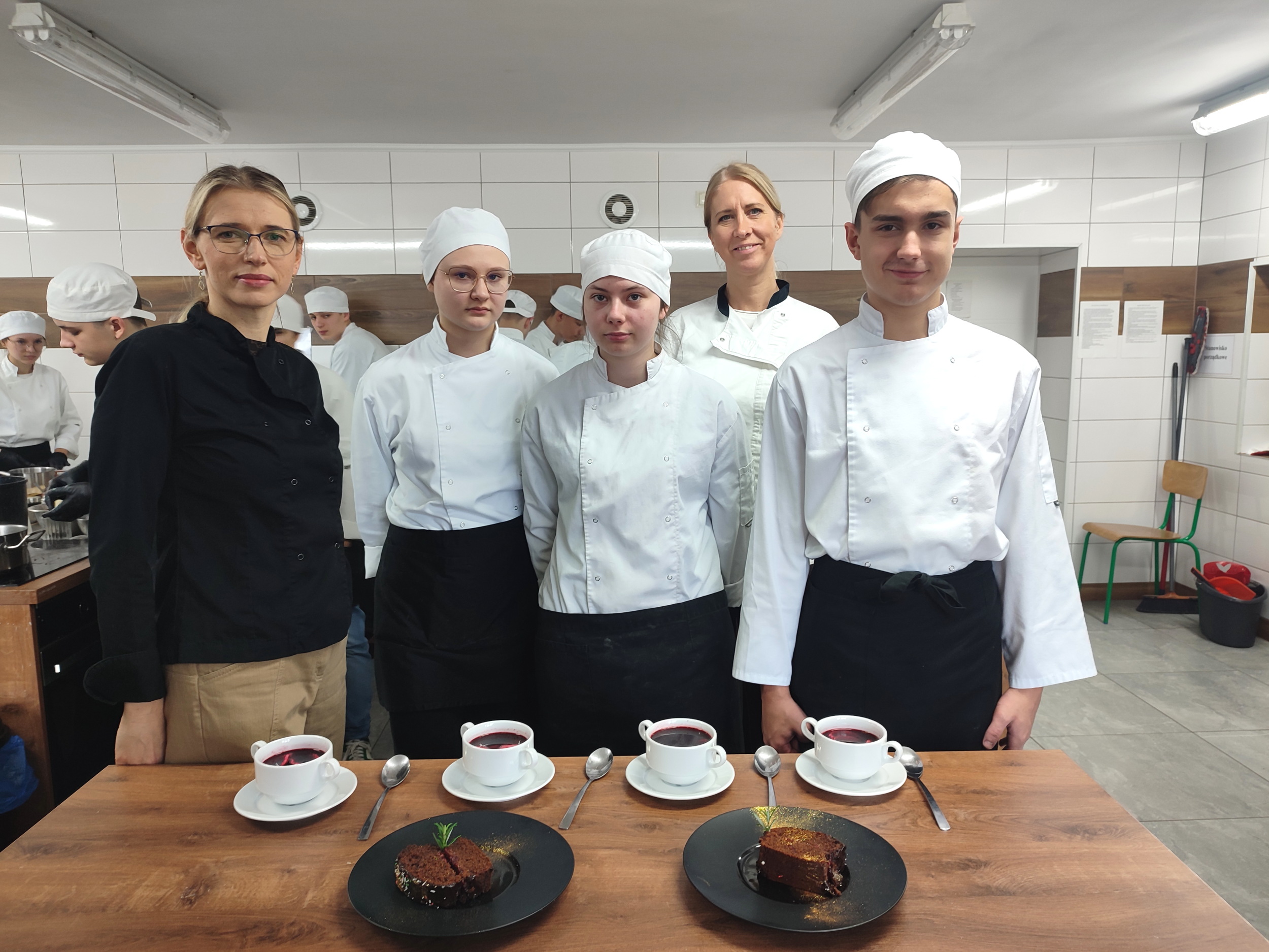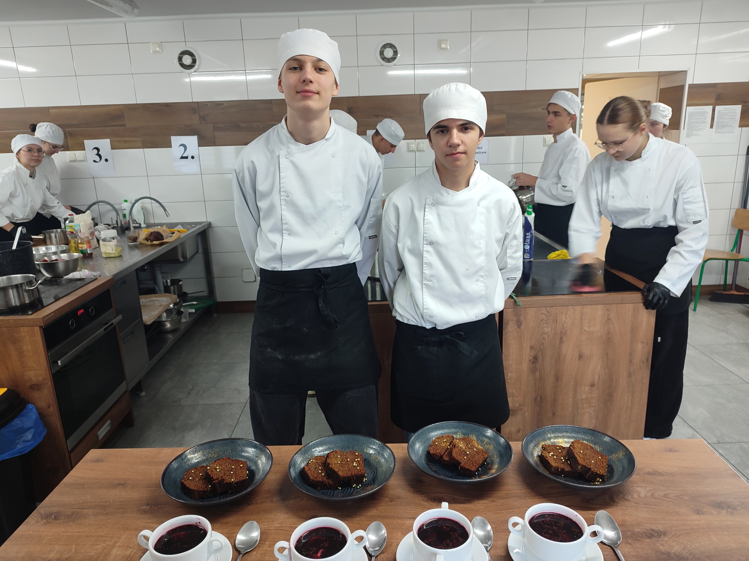 W dniach poprzedzających święta Bożego Narodzenia w naszej szkolnej pracowni gastronomicznej unosił się wyjątkowy aromat – zapach korzennych przypraw, wanilii, pomarańczy oraz pieczonych ciast. Uczniowie technikum w zawodzie technik żywienia i usług gastronomicznych przygotowywali tradycyjne potrawy świąteczne, doskonaląc swoje umiejętności kulinarne i organizacyjne. Pod czujnym okiem nauczycielek praktycznej nauki zawodu młodzi kucharze tworzyli zarówno klasyczne dania kuchni polskiej, jak i ich nowoczesne warianty. Na stołach pojawiły się m.in. uszka z grzybami, barszcz czerwony. Nie zabrakło również słodkości – uczniowie przygotowywali pierniki przekładane i pierniki sztukowe do ozdabiania.