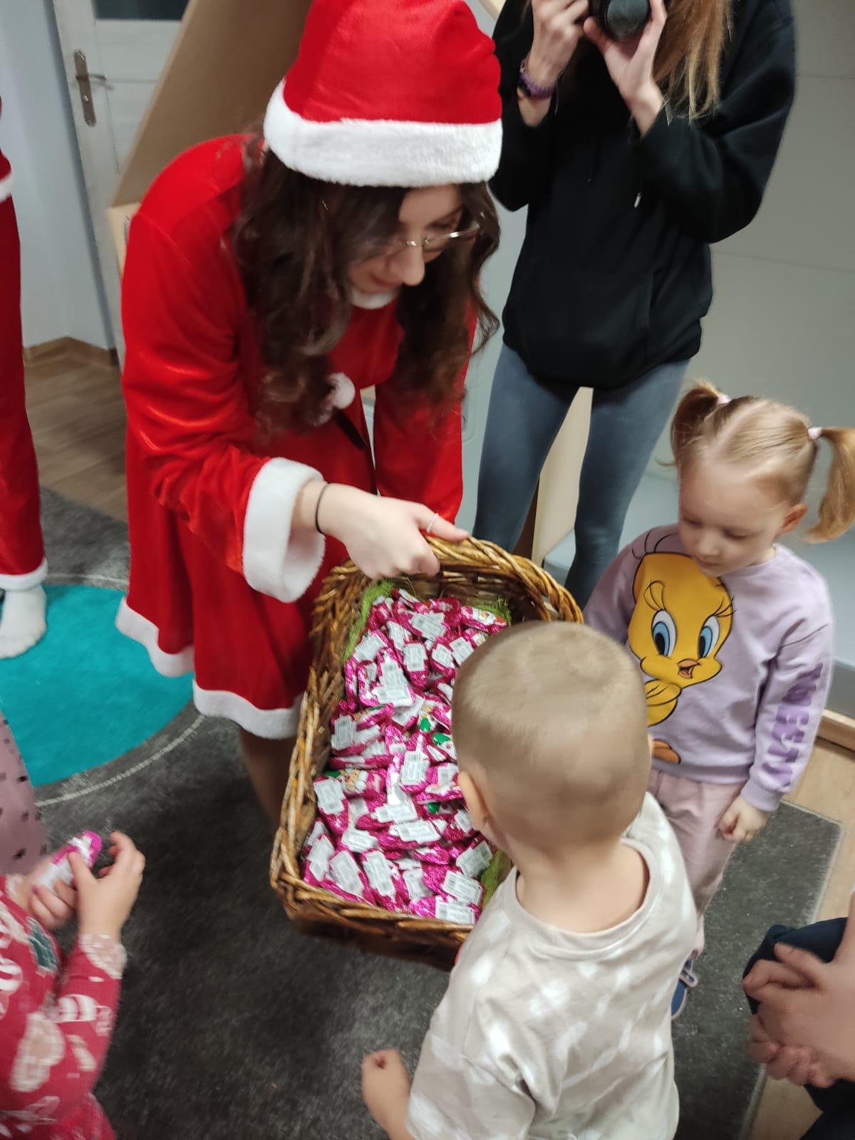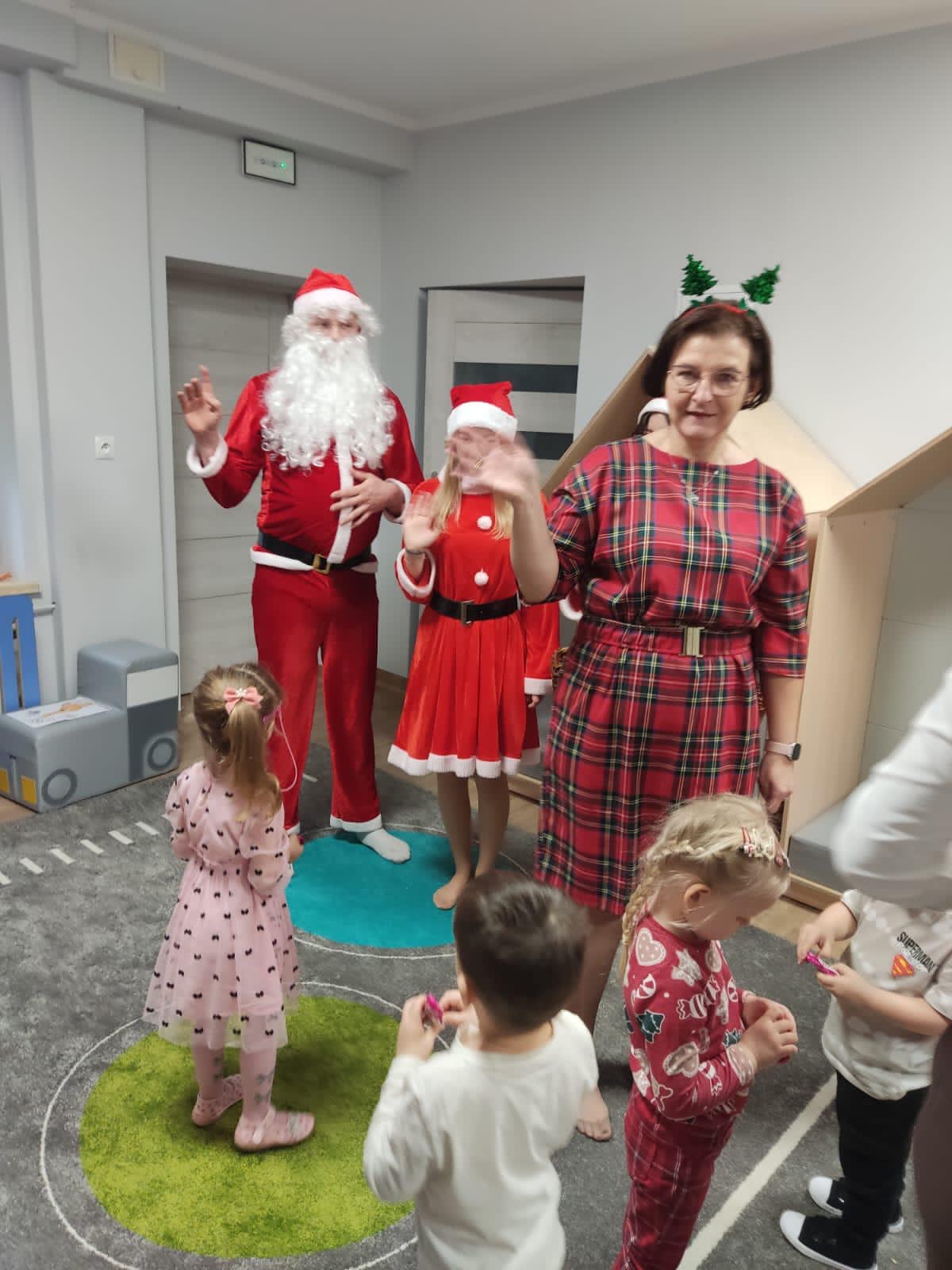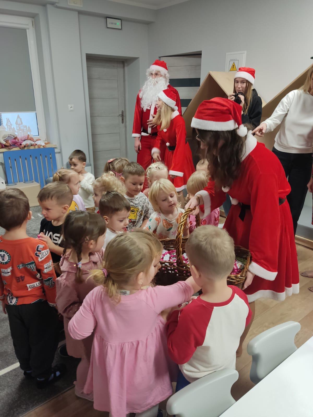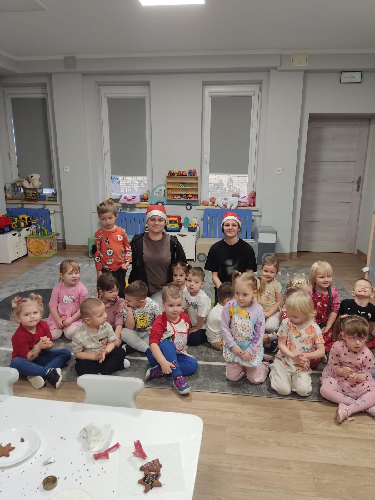 Na zakończenie wspólnego dekorowania dzieci i uczniowie zostali zaskoczeni wyjątkowym gościem – do sali wkroczył sam Święty Mikołaj. Jego pojawienie się wywołało ogromną radość, zwłaszcza wśród przedszkolaków, które z przejęciem opowiadały o swoich piernikowych dziełach. Mikołaj z uśmiechem pochwalił wszystkich za kreatywność i zaangażowanie, a następnie wręczył każdemu słodki upominek w podziękowaniu za pięknie udekorowane pierniki. Ten magiczny moment był wspaniałym zwieńczeniem wspólnego spotkania i jeszcze długo pozostanie w pamięci uczestników.