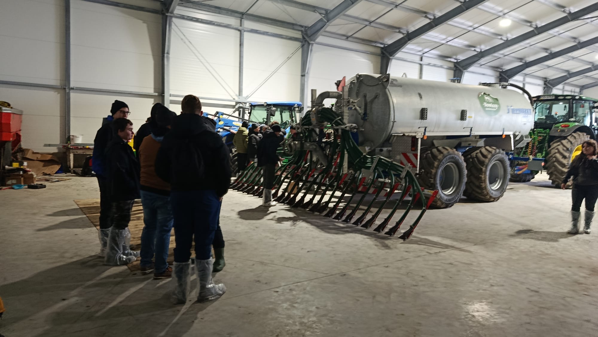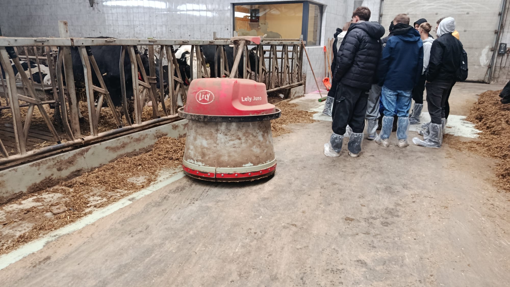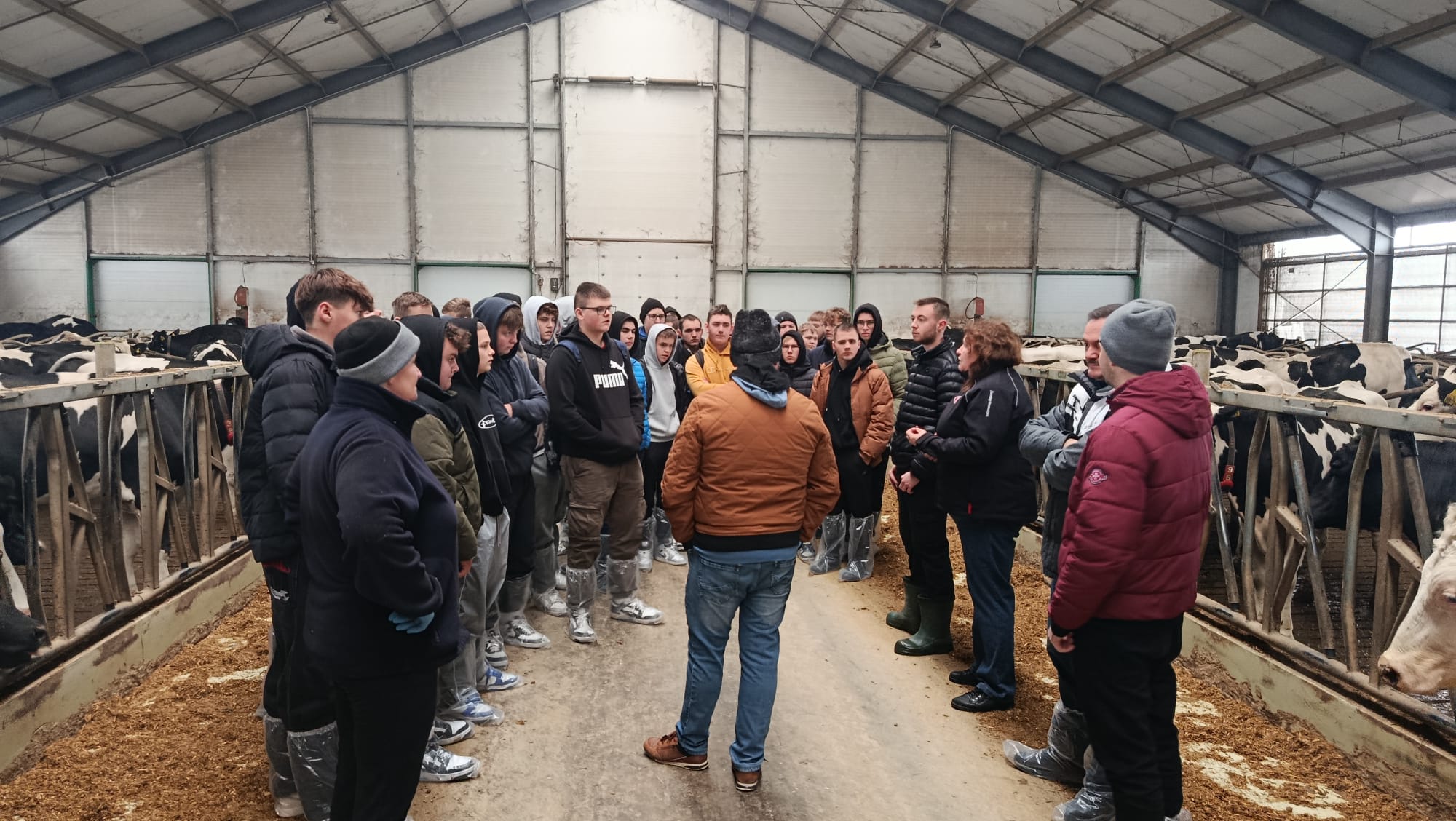 Gospodarstwo pana Pawła jest wyposażone w trzy roboty udojowe firmy Lely, które na co dzień zapewniają automatyczny i precyzyjny dój krów mlecznych. Oprócz tego młodzież mogła zobaczyć działanie robota do podgarniania paszy oraz robota czyszczącego podłogę rusztową – także tej samej marki. Dzięki temu uczniowie mieli okazję przekonać się, jak wygląda praca w nowoczesnej, zautomatyzowanej oborze oraz jakie korzyści niosą ze sobą innowacyjne rozwiązania w produkcji mleka.