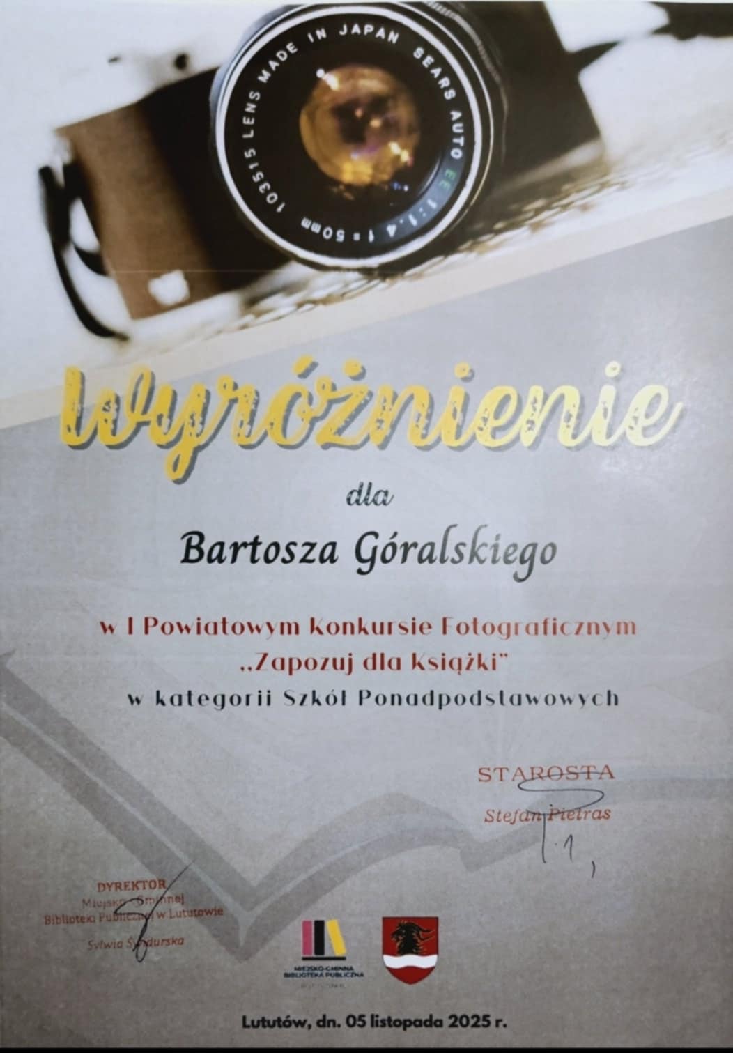 Bartosz Góralski uczeń Zespołu Szkół Centrum Kształcenia Rolniczego w Lututowie zdobył wyróżnienie w kategorii szkół ponadpodstawowych w I Powiatowym Konkursie Fotograficznym „Zapozuj dla książki”.