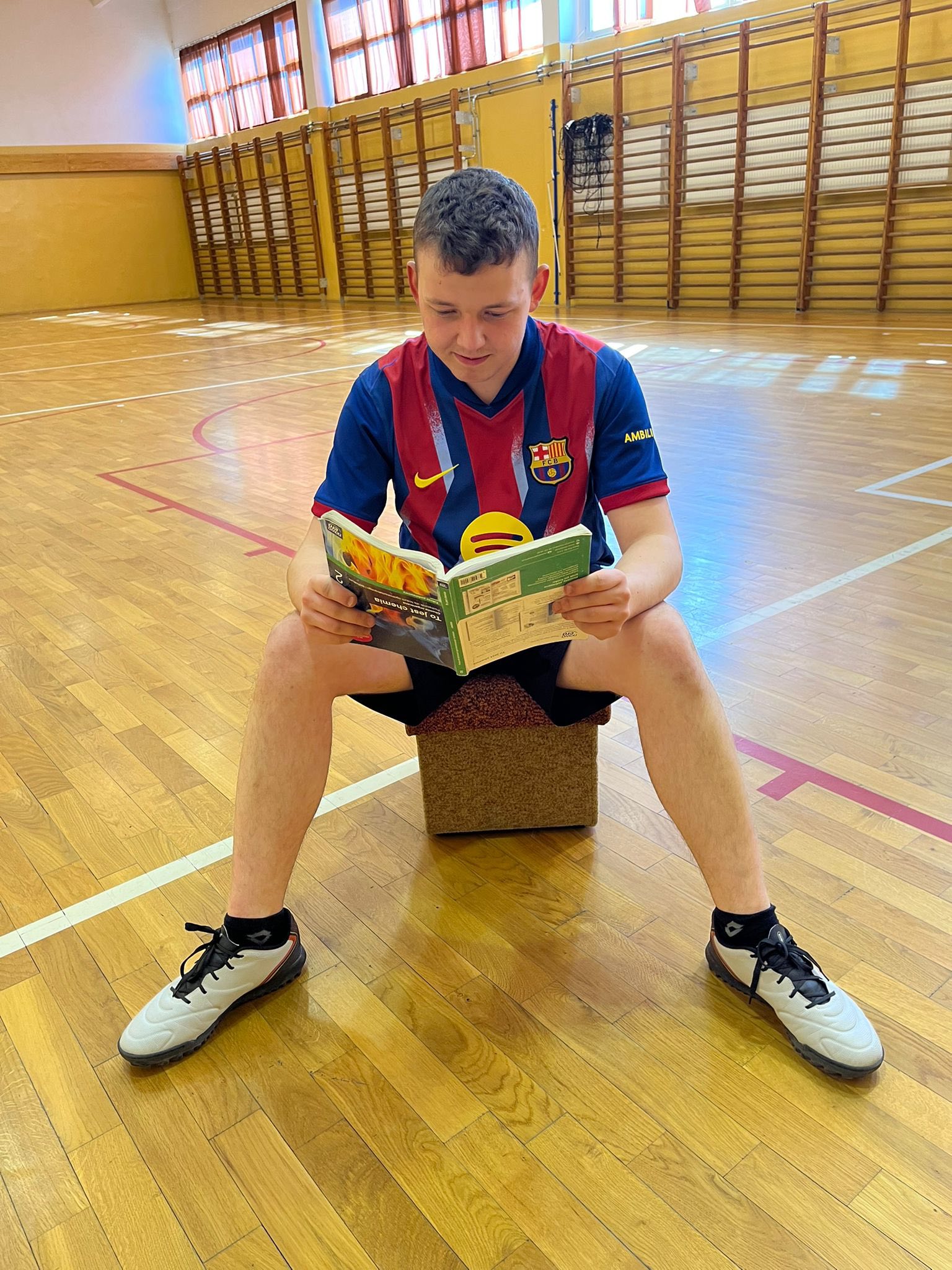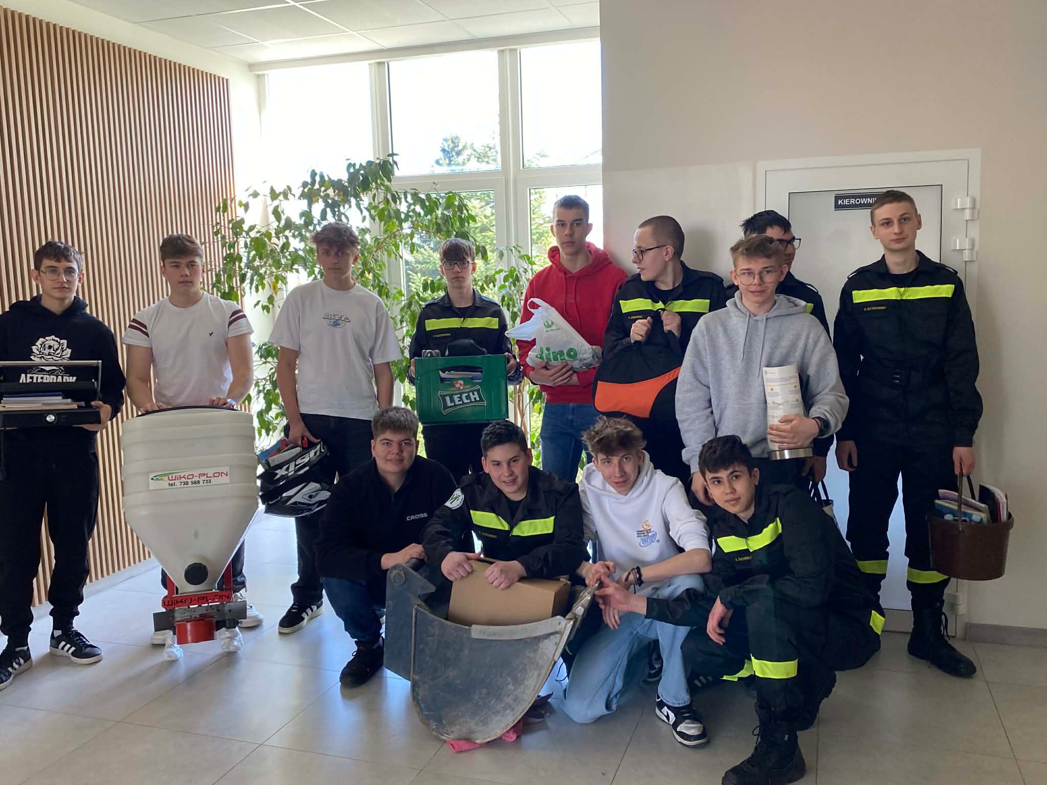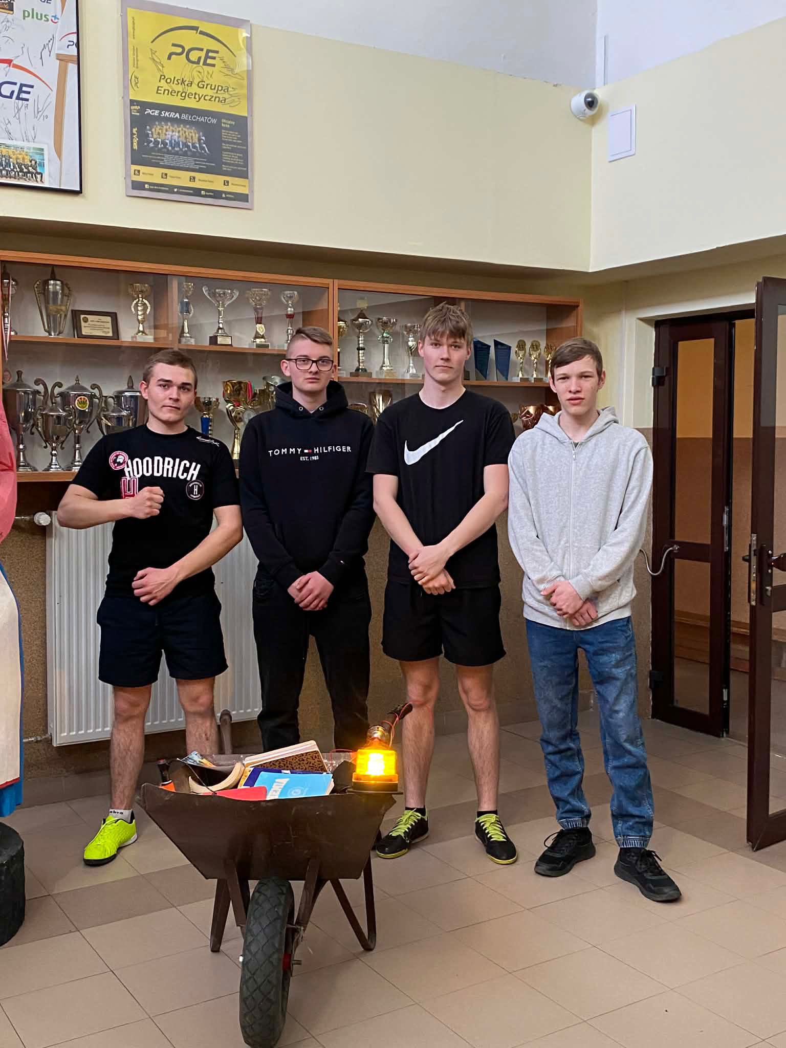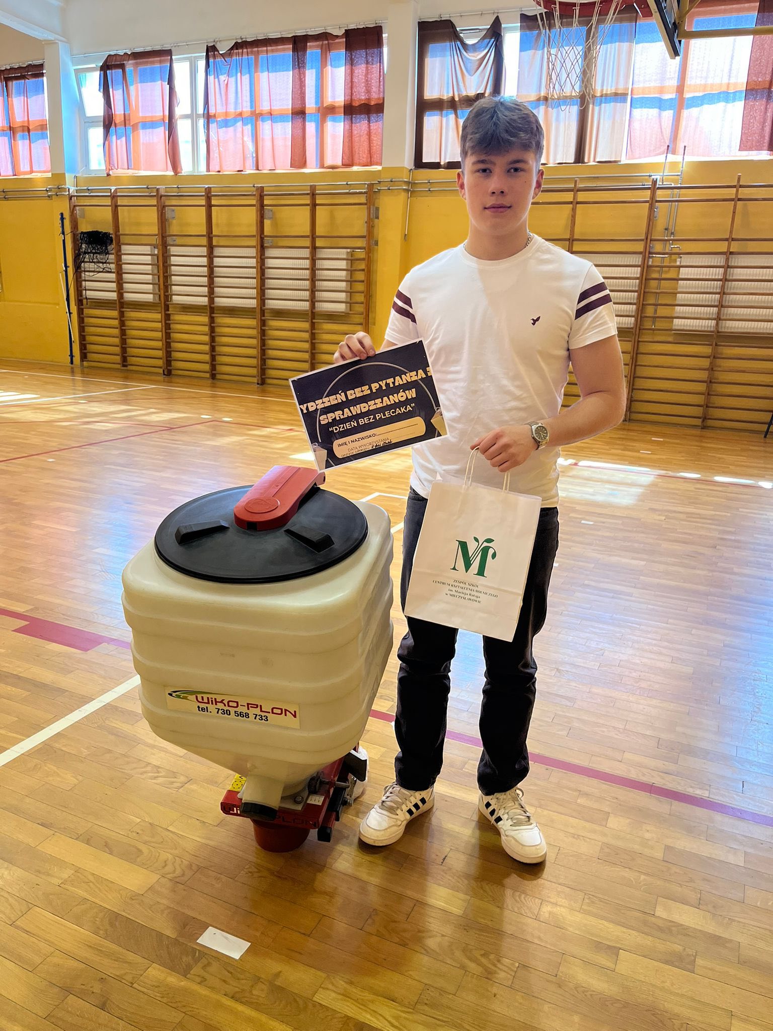 Nagrodę niespodziankę, czyli czek na tydzień bez sprawdzianów i pytania oraz szkolne gadżety otrzymał uczeń klasy 1 TMS Jakub Mysłowski, który swoje książki nosił w dniu dzisiejszym w rozsiewaczu do poplonu