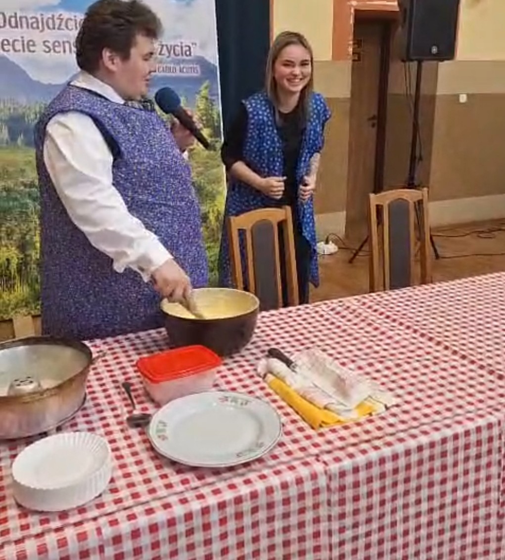 Młodzież mieszkająca w internacie miała okazję wziąć udział w wyjątkowych zajęciach kulinarnych zorganizowanych przez księdza oraz Koło Gospodyń Wiejskich z Mokrzeszowa. Spotkanie miało na celu nie tylko naukę gotowania, ale również integrację międzypokoleniową oraz poznanie tradycji kulinarnych kuchni śląskiej i gwary śląskiej. Zajęcia prowadził znany influencer z internetowych filmików, który promuje kuchnię oraz gwarę śląską. Atmosfera podczas spotkania była niezwykle przyjazna. Zajęcia okazały się dużym sukcesem i na długo pozostaną w pamięci uczniów jako inspirujące doświadczenie.(MJ)