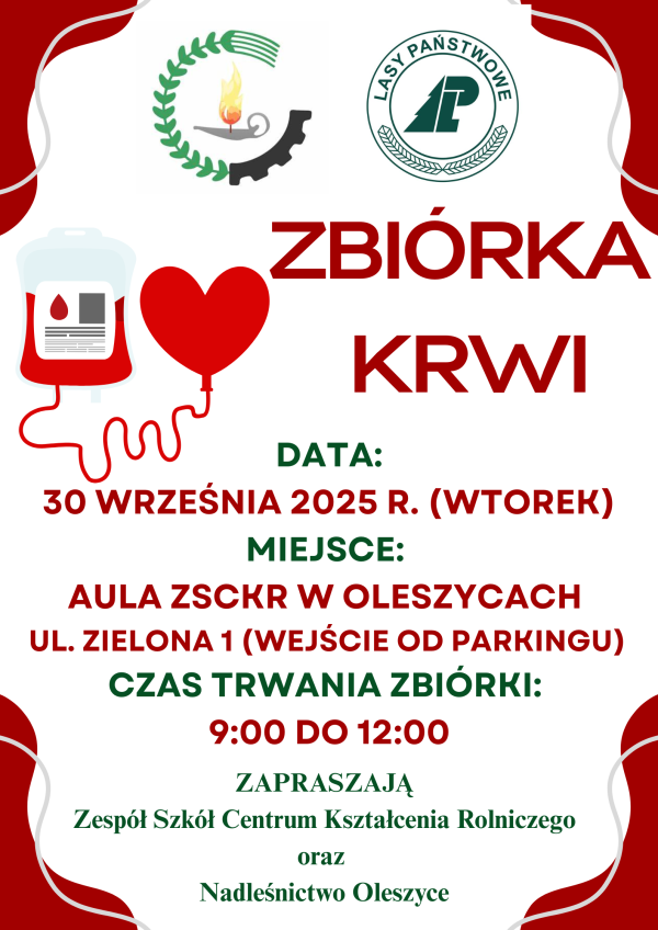 Z przyjemnością informuję, że w Naszej szkole dnia 30 września 2025r. (wtorek) odbędzie się ZBIÓRKA KRWI organizowana przez Zespół Szkół Centrum Kształcenia Rolniczego w Oleszycach we współpracy z Nadleśnictwem Oleszyce.