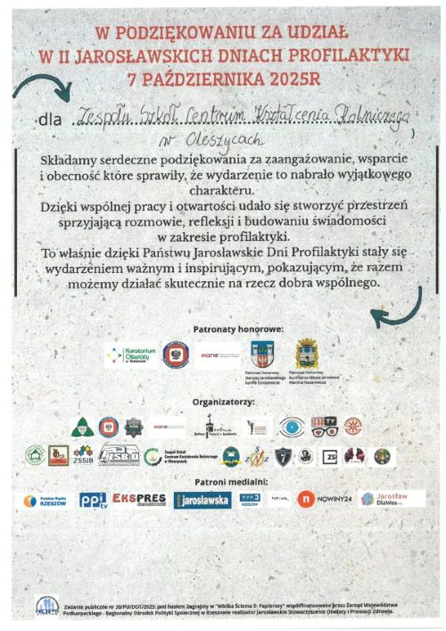 W ramach zadania publicznego nr 20/PU/DOT/2025 „Zagrajmy w Wielką Ściemę – e-papierosy”, realizowanego na zlecenie Regionalnego Ośrodka Polityki Społecznej w Rzeszowie przez Jarosławskie Stowarzyszenie Oświaty i Promocji Zdrowi w wydarzeniu uczestniczyło 939 uczniów szkół podstawowych i ponadpodstawowych z powiatów: jarosławskiego, przeworskiego i lubaczowskiego, pod opieką 69 nauczycieli.
