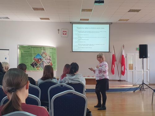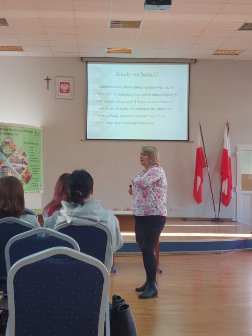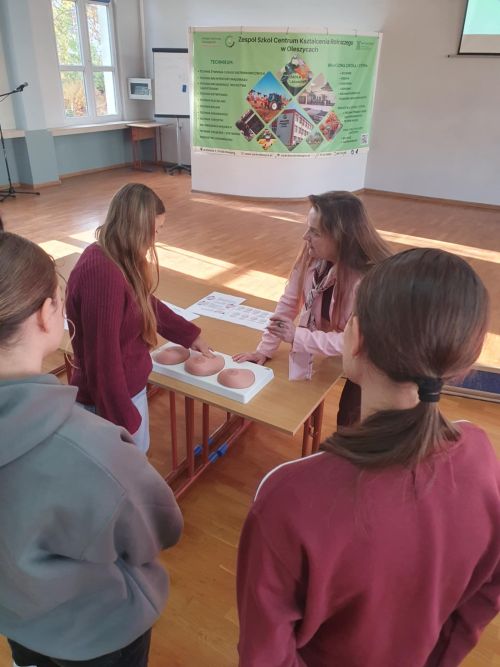 22 października w auli szkoły odbyło się spotkanie uczennic klas IV Technikum oraz III BS I-go stopnia z panią Elżbietą Rubin, edukatorką Powiatowej Stacji Sanitaro-Epidemiologicznej w Lubaczowie oraz panią Małgorzatą Lewkowicz, położną środowiskową. Tematem spotkania było samobadanie piersi oraz profilaktyka chorób nowotworowych, w szczególności raka piersi.