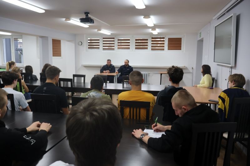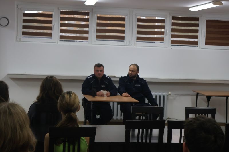 Tematem spotkania było bezpieczeństwo – zarówno w szkole, w internecie, jak i poza nią. Policjanci przypomnieli młodzieży, jak unikać zagrożeń, reagować w trudnych sytuacjach i gdzie szukać pomocy w razie potrzeby. Młodzież aktywnie uczestniczyła w rozmowie, dzieląc się swoimi doświadczeniami i zadając pytania dotyczące codziennych sytuacji.