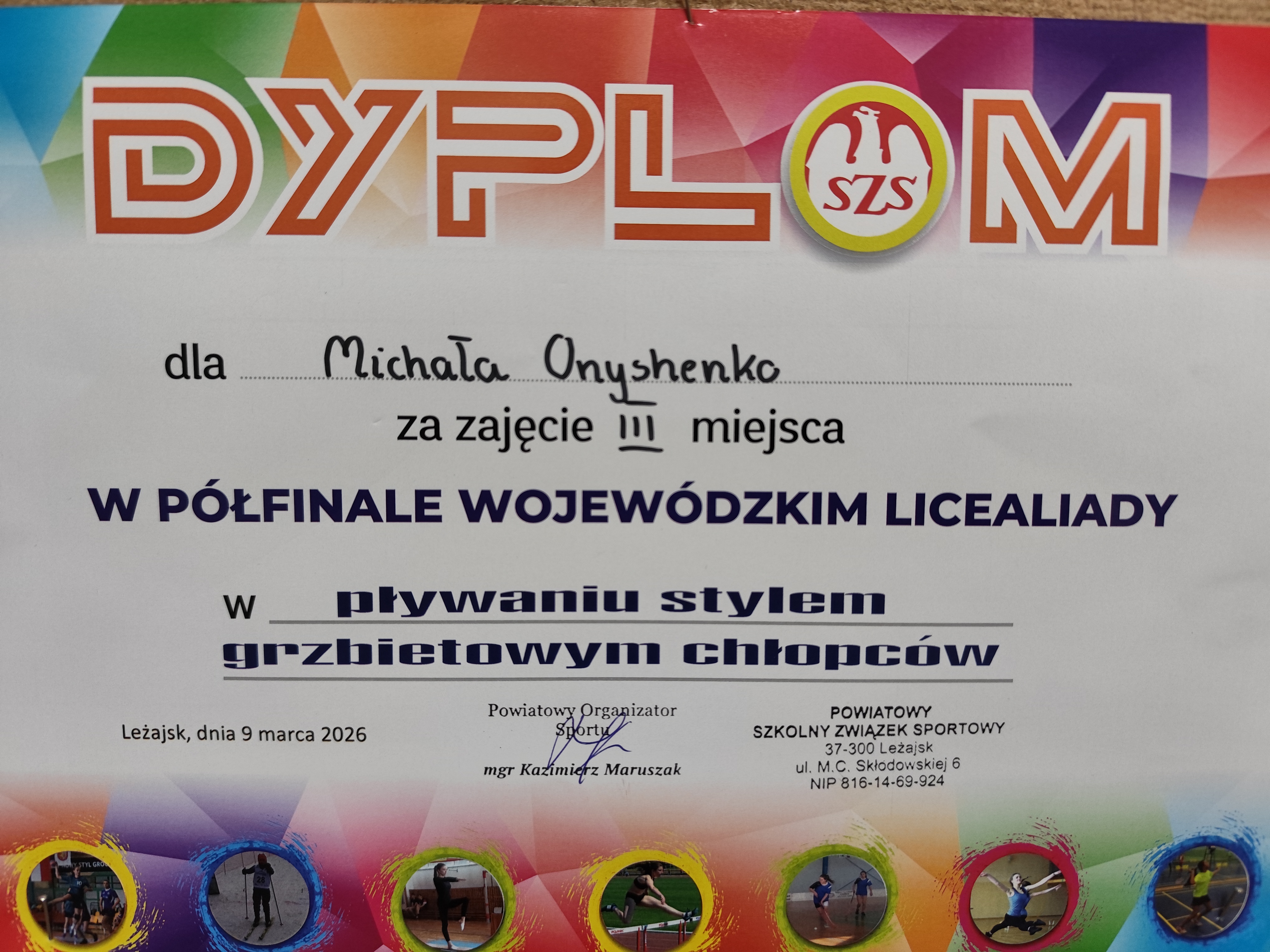 – Michał Onyshchenko zajął III miejsce w wyścigu na 50 m stylem grzbietowym i oczekuje na awans do finału wojewódzkiego.