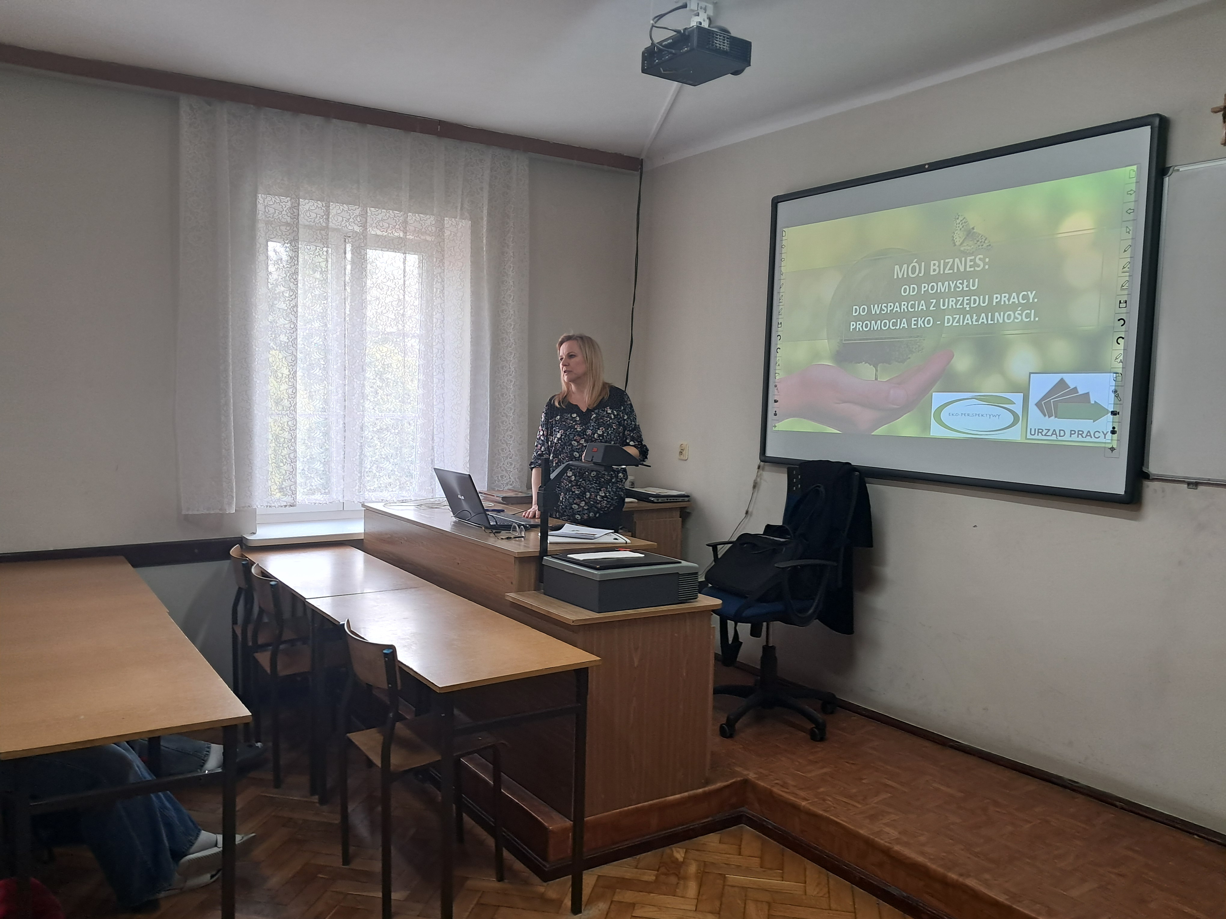 Celem spotkań było przybliżenie młodzieży dostępnych form wsparcia oferowanych przez urząd pracy, a także zachęcenie uczniów do świadomego planowania swojej przyszłości edukacyjno-zawodowej. Uczestnicy mieli okazję dowiedzieć się, z jakich możliwości pomocy będą mogli skorzystać po zakończeniu nauki oraz jakie kroki warto podjąć, aby zwiększyć swoje szanse na rynku pracy. Podczas zajęć szczególną uwagę poświęcono tematyce przedsiębiorczości. Uczniowie poznali zarówno zalety, jak i potencjalne trudności związane z prowadzeniem własnej działalności gospodarczej. Omówiono również kwestie związane z uzyskaniem dofinansowania na rozpoczęcie działalności, w tym warunki przyznawania dotacji. Istotnym elementem spotkań było także wprowadzenie do zagadnień związanych z ekologią w biznesie. Uczniowie dowiedzieli się, czym jest eko-biznes, jakie niesie ze sobą korzyści oraz z jakimi wyzwaniami muszą mierzyć się przedsiębiorcy działający w obszarze tzw. „zielonego biznesu”. Podkreślono również znaczenie działań proekologicznych w kontekście samozatrudnienia i współczesnego rynku pracy.