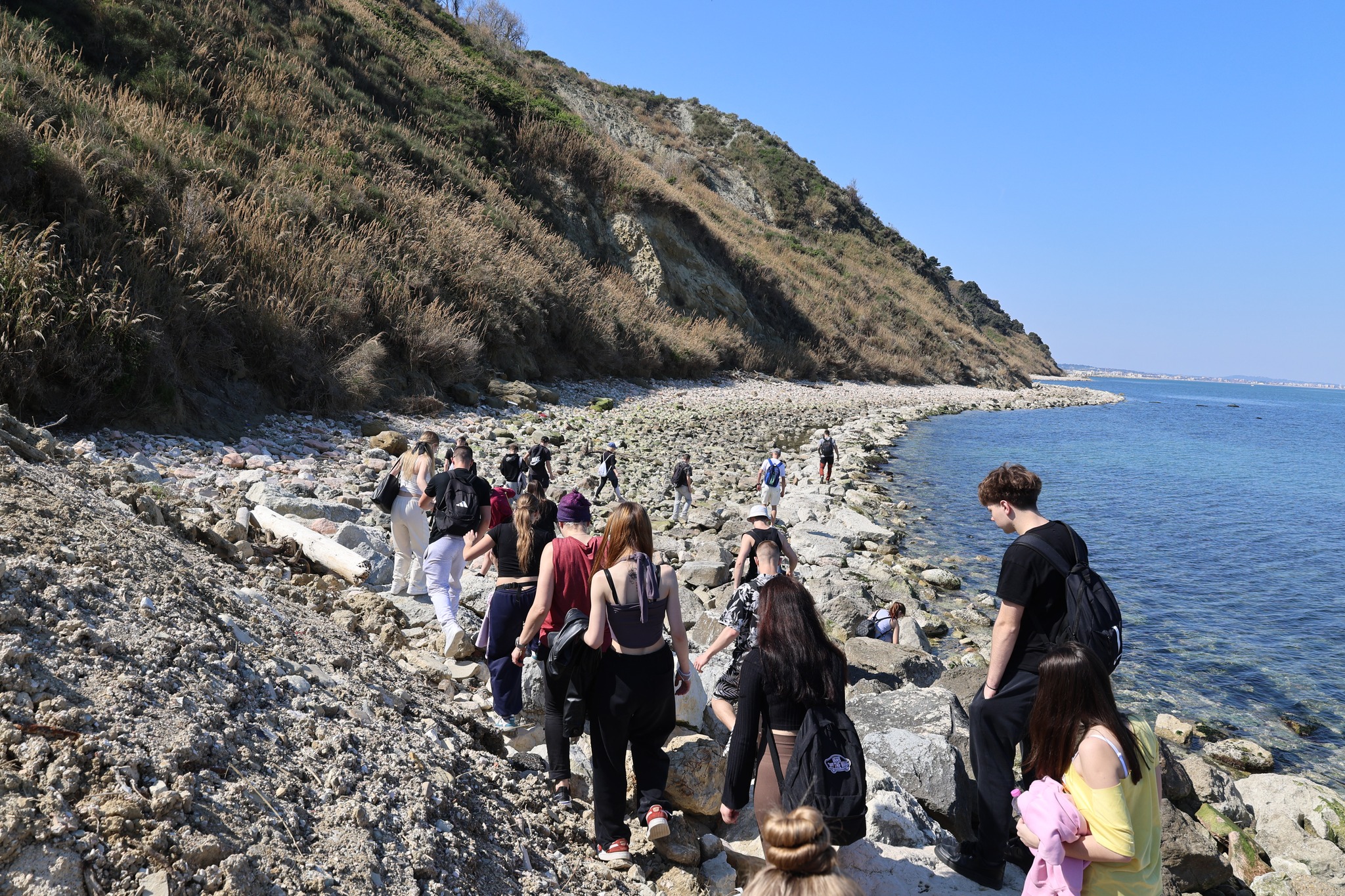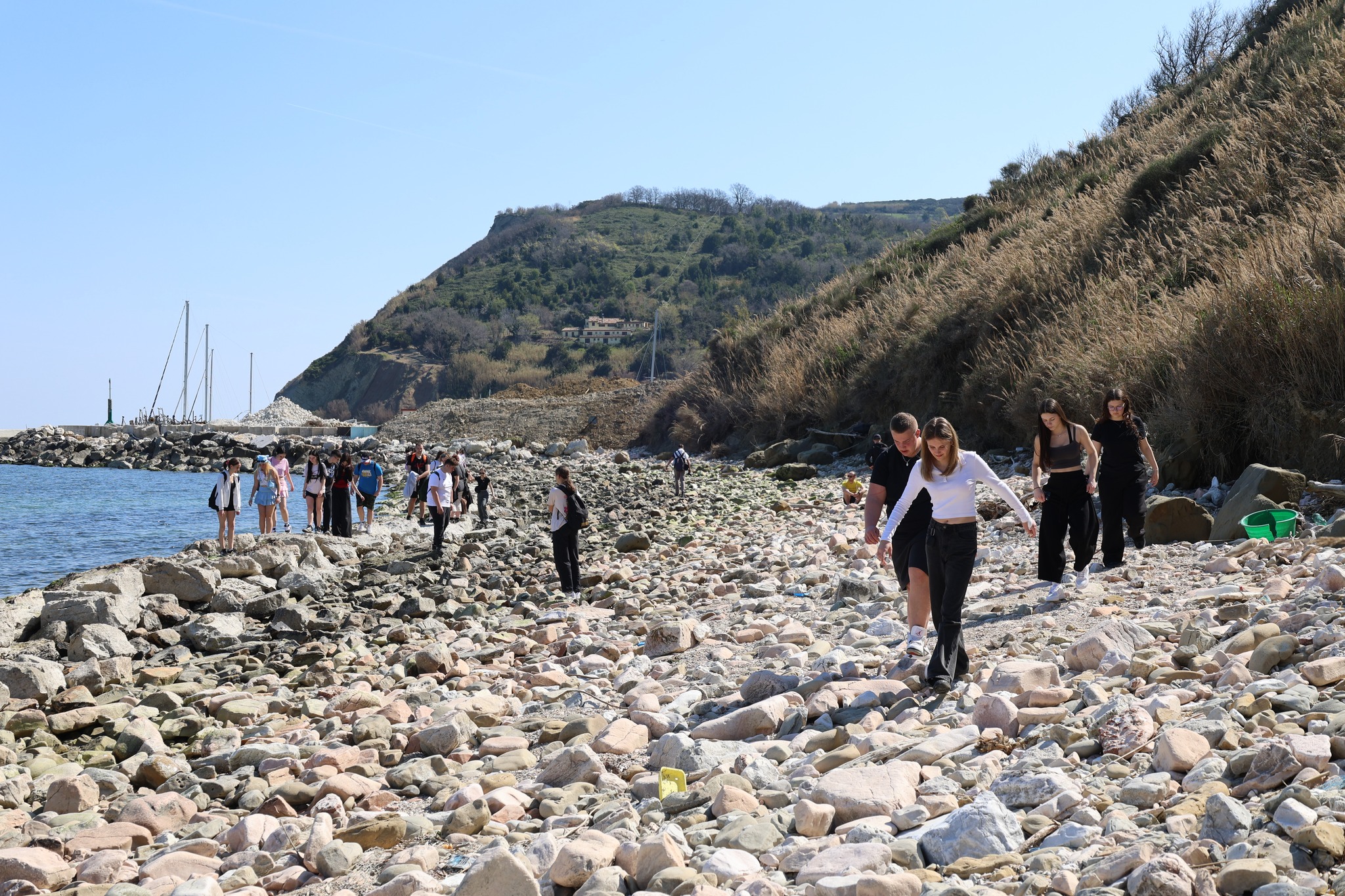 Na dole czekało nas trudne wyzwanie. Badając linię brzegową, uczniowie na własne oczy zobaczyli, co wyrzuca morze: plastikowe butelki, buty, a nawet części wyposażenia domowego. To bolesny dowód na to, jak nasza codzienna działalność wpływa na wody Adriatyku.