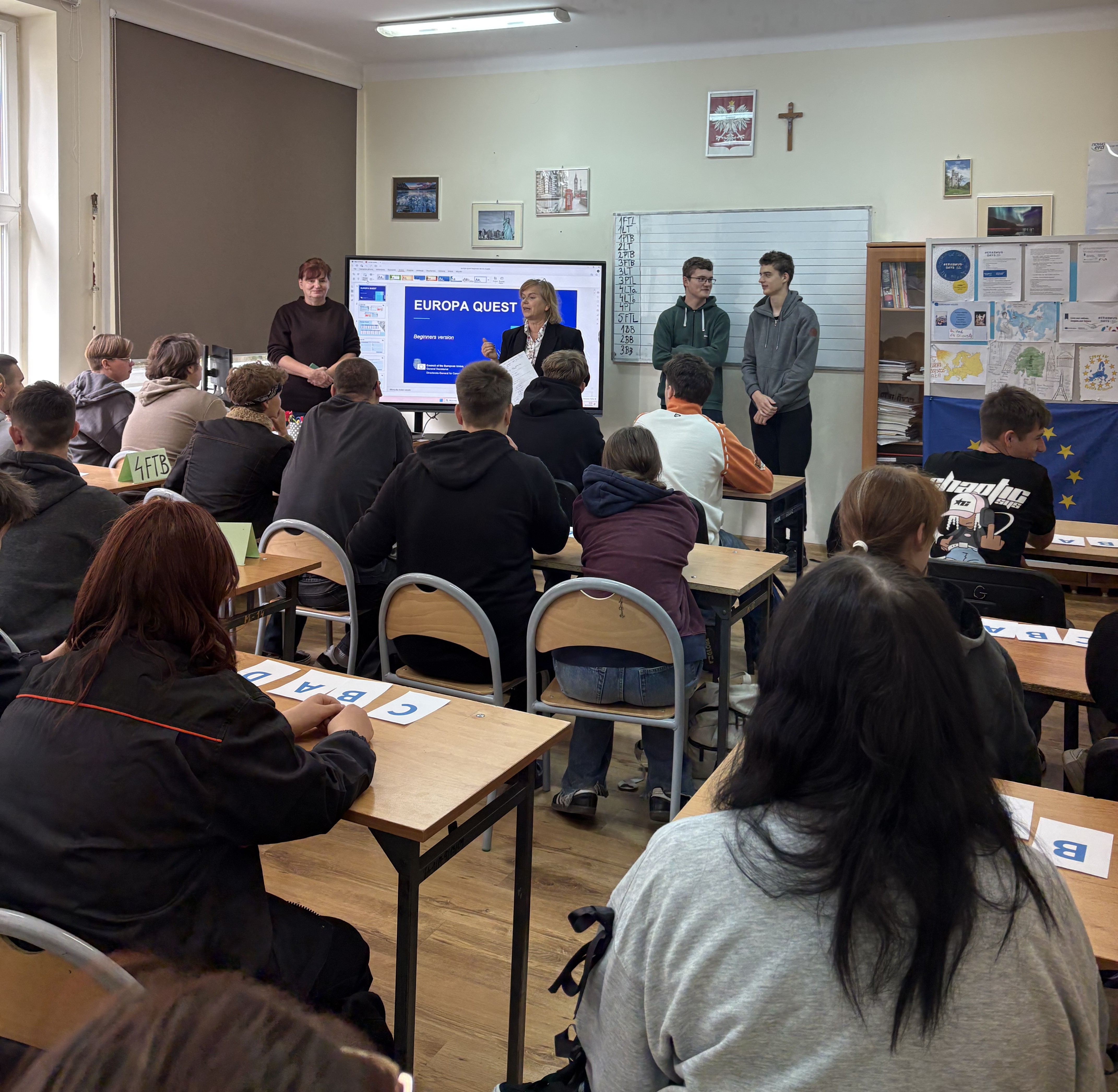 16 października odbył się konkurs „Europa Quest”, sprawdzający wiedzę o Europie – jej instytucjach, kulturze, geografii i wartościach. Zacięta rywalizacja zakończyła się emocjonującą dogrywką. Równolegle uczniowie oglądali wystawę fotograficzną z praktyk zawodowych we Włoszech, ukazującą efekty międzynarodowej współpracy. W konkursie plastycznym „Spraw, żeby Europa błyszczała!” zaprezentowano różnorodne, pełne symboliki wizje zjednoczonej Europy.