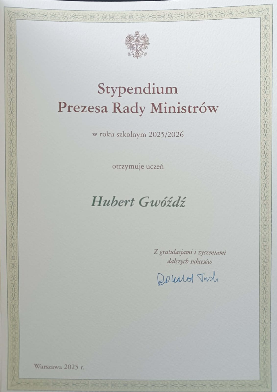 Miło nam poinformować, że Hubert Gwóźdź, uczeń klasy 5 FTL, otrzymał stypendium Prezesa Rady Ministrów za wybitne osiągnięcia w roku szkolnym 2025/2026.