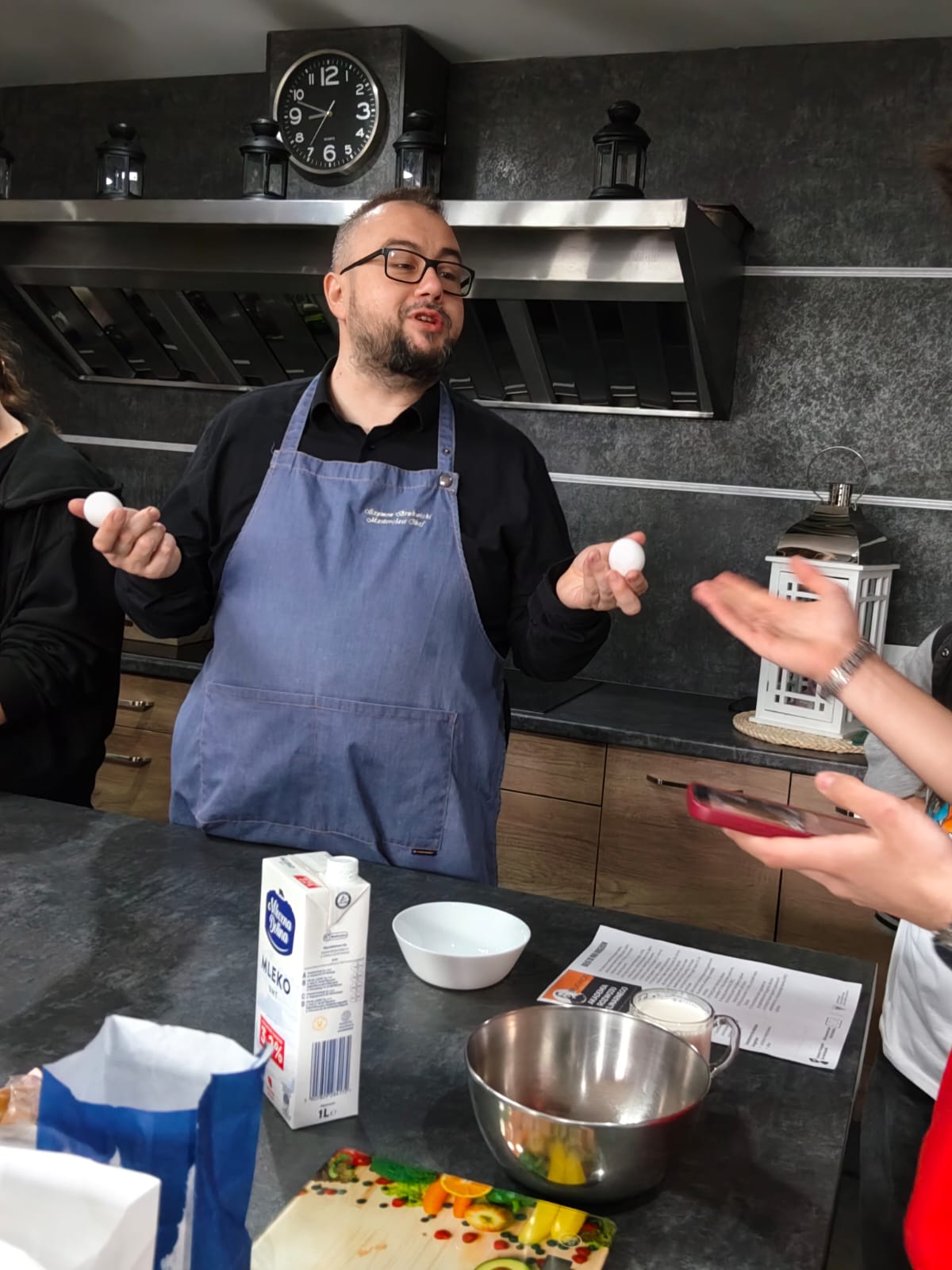 Zajęcia poprowadził pan Szymon Brukwicki – doświadczony szef kuchni, który w ciekawy sposób pokazał, jak łączyć lokalne dziedzictwo kulinarne z nowoczesnym podejściem do sztuki gotowania.
