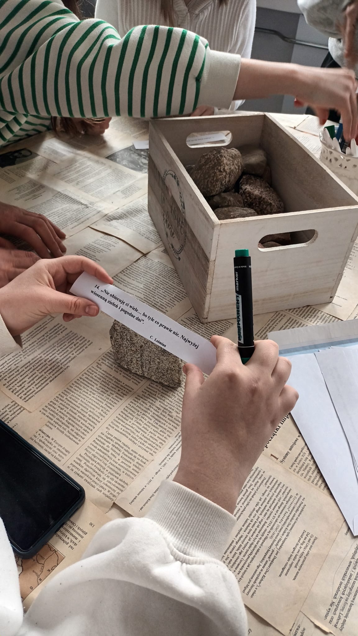 Jednym z zadań było zapisanie krótkiego fragmentu wiersza na kamieniu, a następnie pozostawienie go na zewnątrz szkoły, by ktoś inny mógł go odnaleźć i przeczytać. Był to piękny gest dzielenia się poezją oraz zachęcania innych do kontaktu z literaturą.