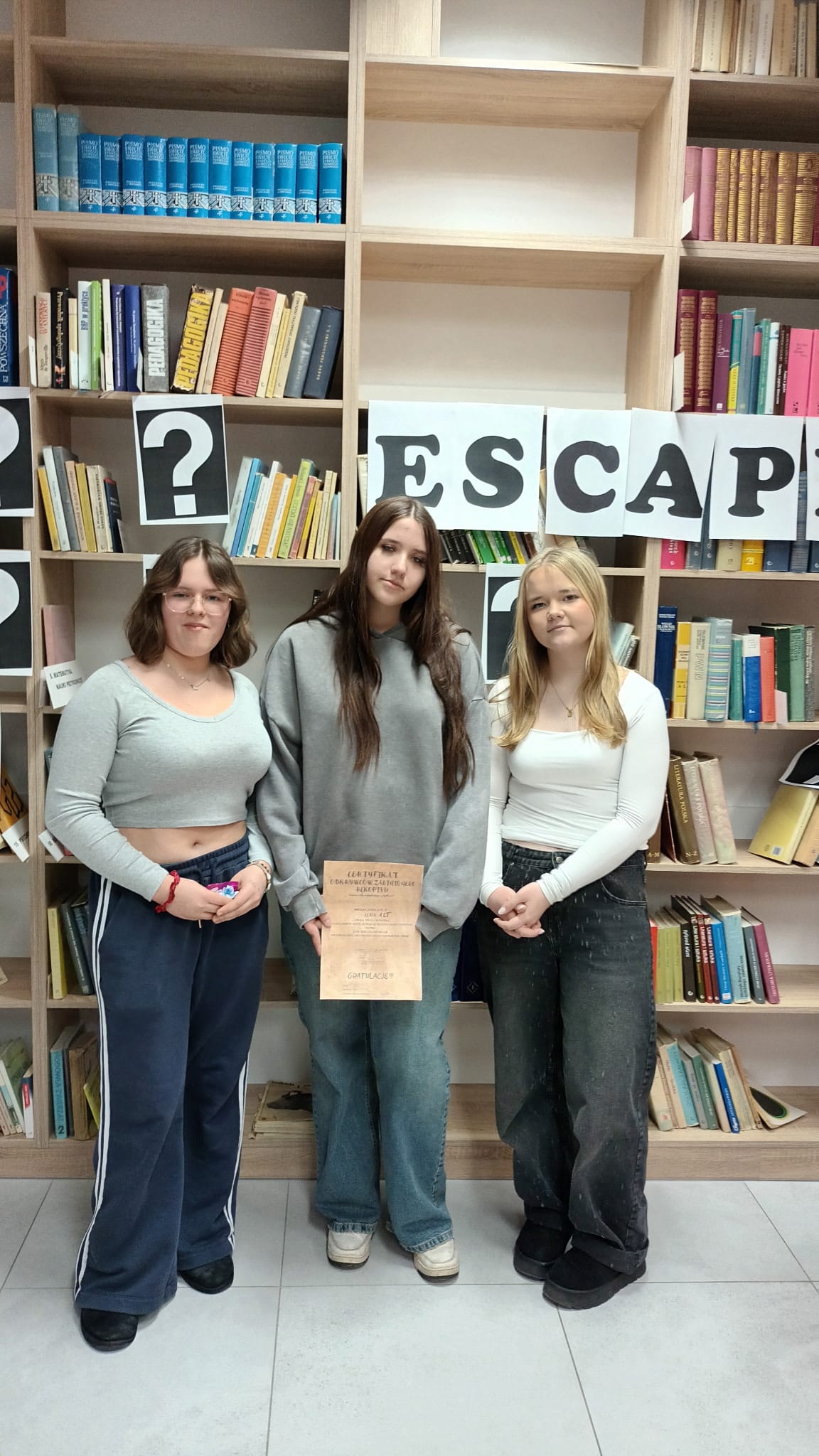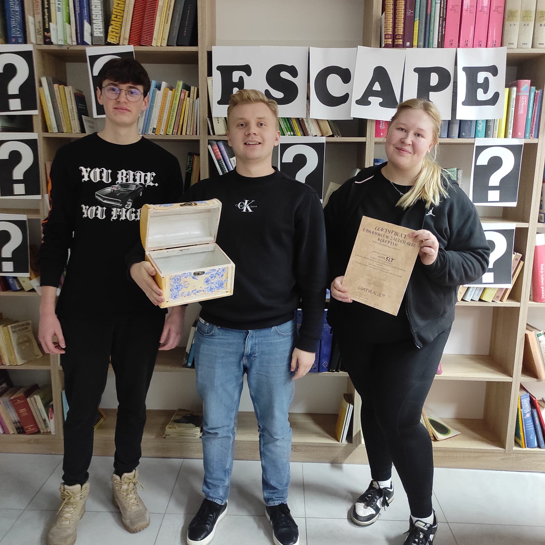 Kto powiedział, że biblioteka musi być cicha i nudna? U nas zamieniła się w prawdziwą arenę zagadek, szyfrów i tajemnic! Wszystko za sprawą escape roomu, w którym zmierzyło się aż 14 klas. Cel był jeden: odnaleźć zaginiony rękopis, zanim drzwi biblioteki zatrzasną się na… 100 lat!