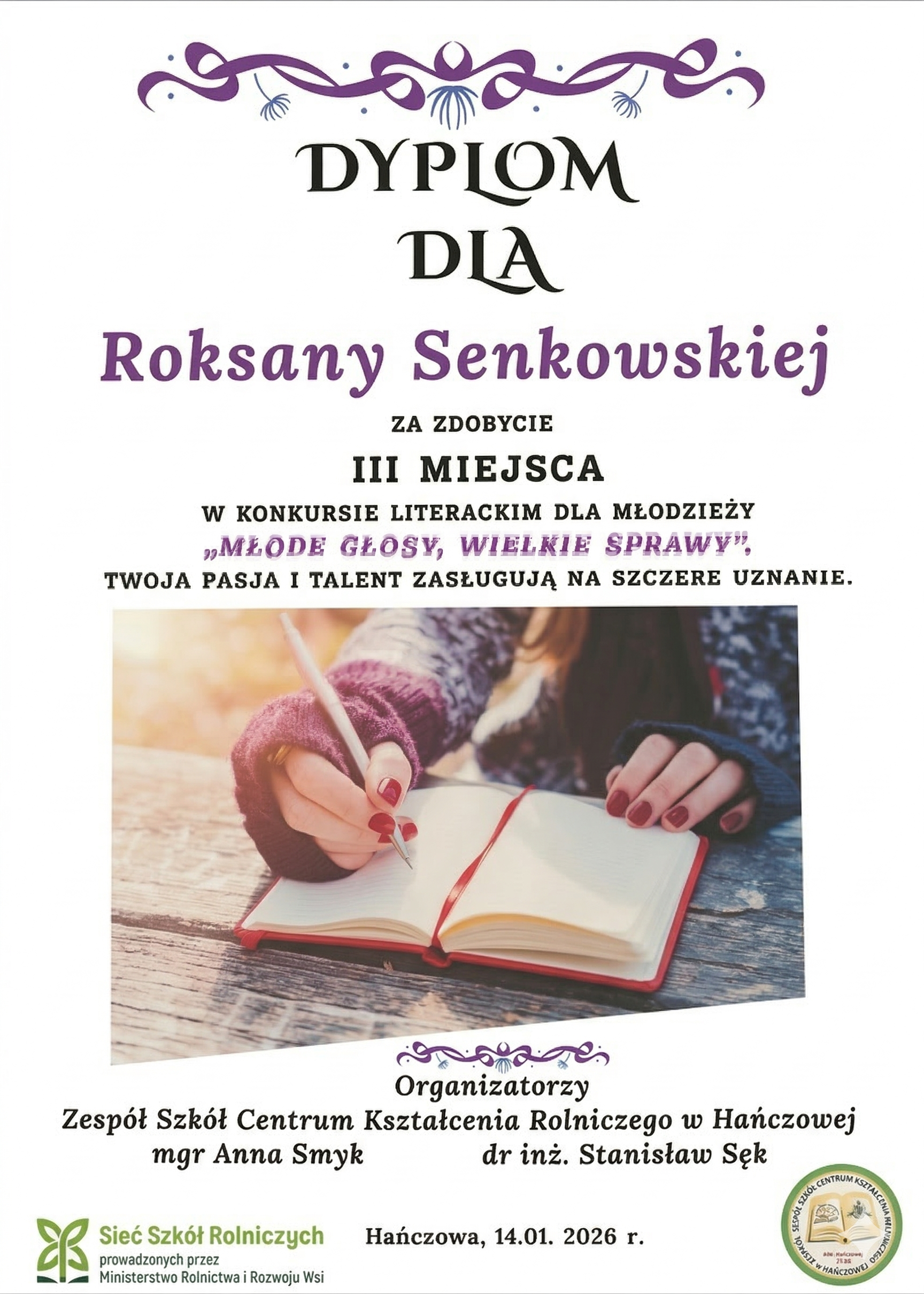 Z dumą informujemy o znaczącym osiągnięciu naszej uczennicy. Roksana Senkowska, uczennica klasy II HTL, zdobyła III miejsce w ogólnopolskim konkursie literackim „Młode głosy, wielkie sprawy”.