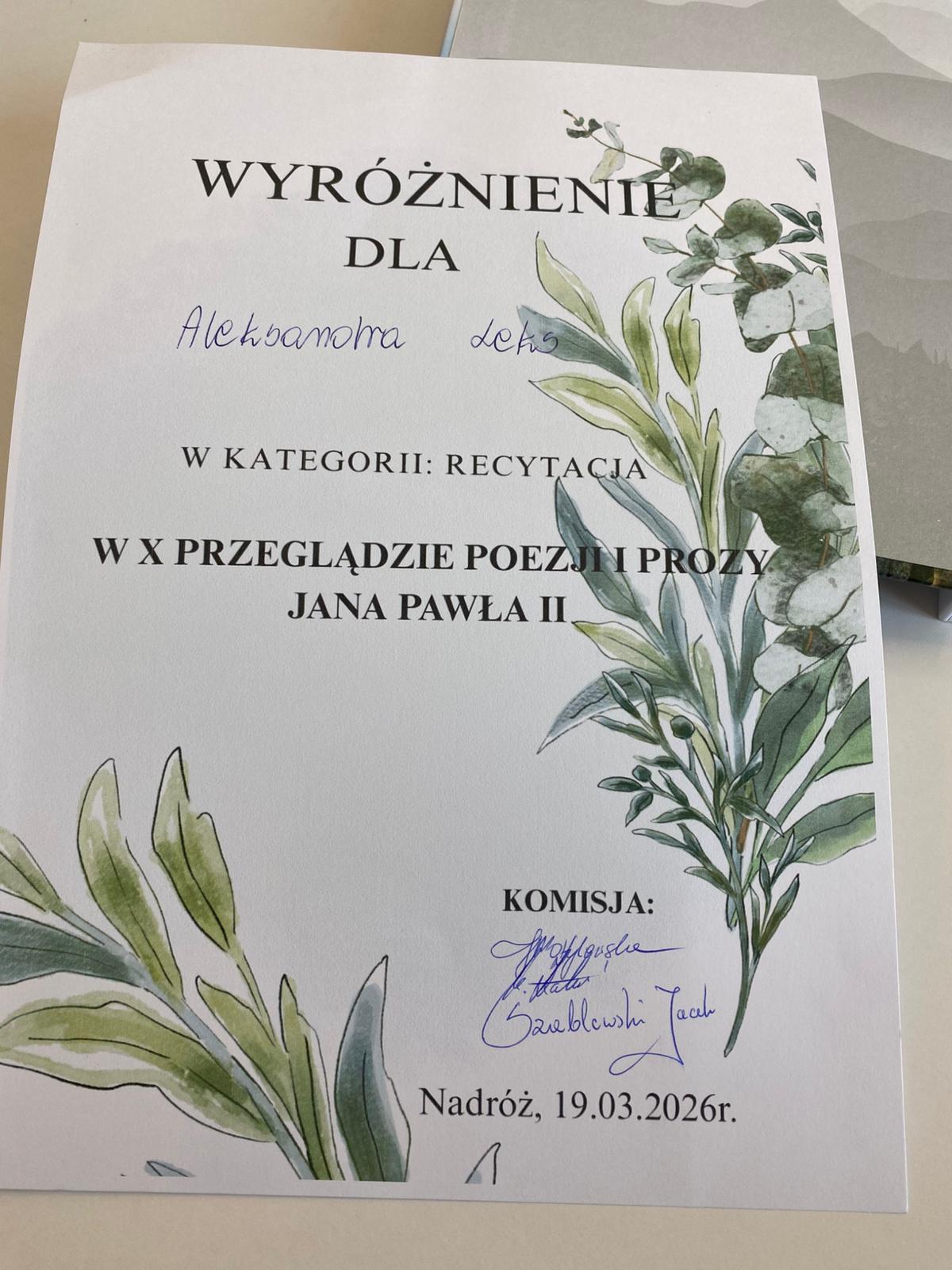 X Przegląd Poezji św. Jana Pawła II w Nadrożu - sukces uczniów z Samostrzela