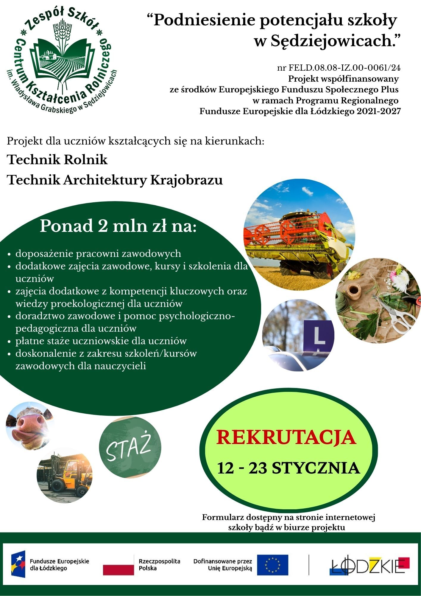 Zespół Szkół Centrum Kształcenia Rolniczego im. Władysława Grabskiego w Sędziejowicach realizuje projekt pn. „Podniesienie potencjału szkoły w Sędziejowicach.” nr FELD.08.008-IZ.00-0061/24 współfinansowany ze środków Europejskiego Funduszu Społecznego Plus w ramach Programu Regionalnego Fundusze Europejskie dla Łódzkiego 2021-2027.