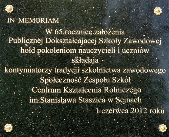 W roku 2012 obchodzono 65. rocznicę utworzenia w Sejnach szkoły zawodowej. Z tej okazji 1 czerwca odbyła się wyjątkowa uroczystość. Odsłonięta została pamiątkowa tablica poświęcona pokoleniom nauczycieli i uczniów, którzy tworzyli szkolnictwo zawodowe na Sejneńszczyźnie. W obchodach uczestniczyli przedstawiciele Ministerstwa Rolnictwa i Rozwoju Wsi, delegacje szkół rolniczych, reprezentanci instytucji społecznych, nauczyciele-emeryci oraz absolwenci szkoły. Z tej okazji odnowiono sztandar szkoły, na którym umieszczono aktualną nazwę placówki.