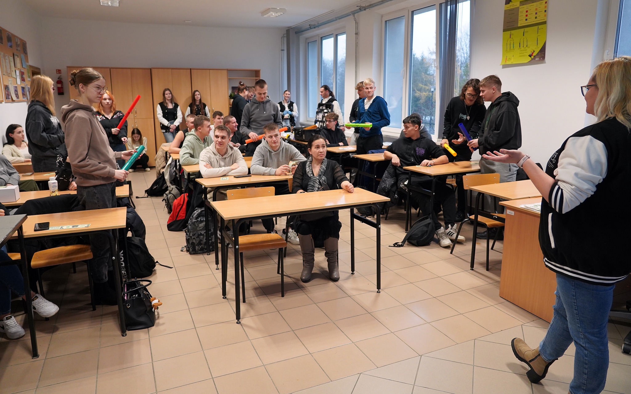 W ramach wizyty szkołę odwiedziła grupa studentów reprezentujących różne kierunki studiów wraz z rzecznikiem prasowym uczelni.