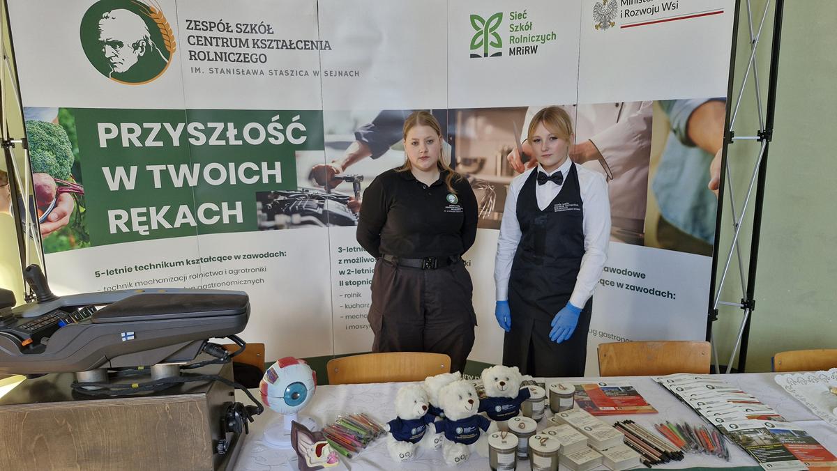 Naszą szkołę reprezentowali nauczyciele – pani Marta Wichert i pan Mariusz Hołubowicz – oraz uczennice III klasy technikum żywienia i usług gastronomicznych – Amelia Pawlukowska i Oliwia Staruch. Przygotowane stoisko cieszyło się zainteresowaniem. Odwiedzający mogli zapoznać się z materiałami promocyjnymi, otrzymać ulotki i gadżety, a przede wszystkim porozmawiać o kierunkach kształcenia oraz możliwościach rozwoju, jakie oferuje nasza placówka.