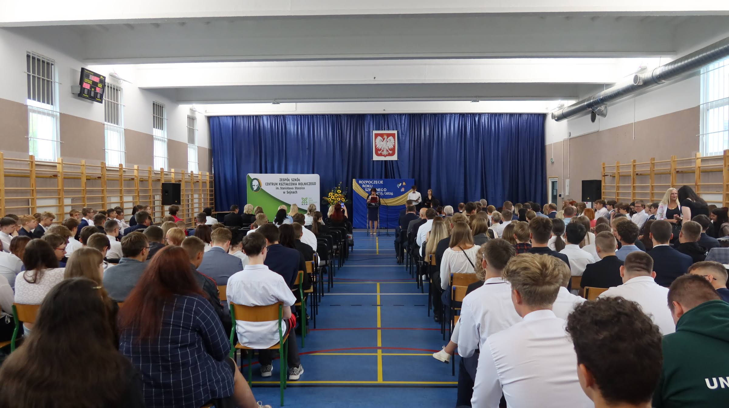 Tego dnia o godzinie 9:00 w ZSCKR w Sejnach rozpoczęła się uroczysta akademia. Po wprowadzeniu sztandaru szkoły i odśpiewaniu hymnu narodowego całą społeczność szkolną powitali przedstawiciele Samorządu Uczniowskiego - Mateusz Gawinowicz i Hanna Nowalska. Szczególnie ciepłe słowa skierowali do nowych koleżanek i kolegów z klas pierwszych.
