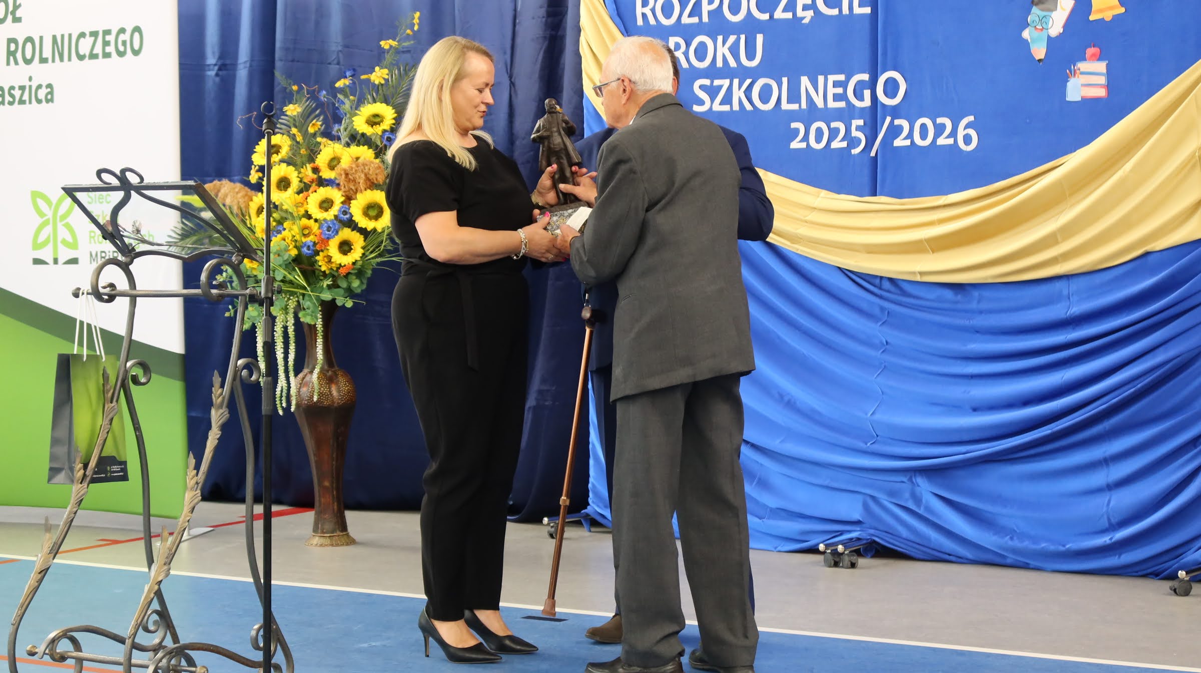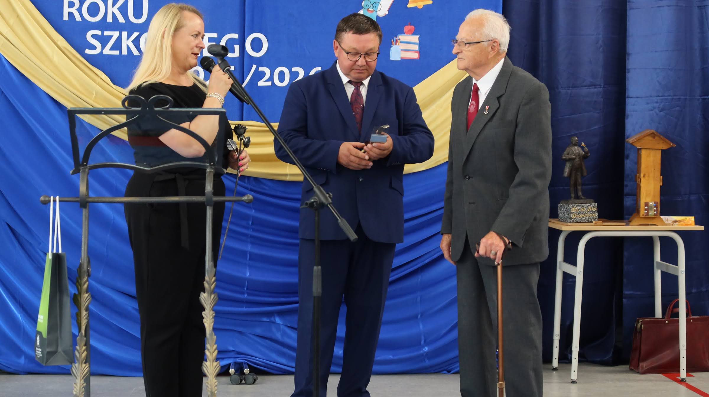 Pan Eugeniusz F. Klimaniec uhonorował naszą szkołę, wręczając pani dyrektor statuetkę ks. dr. Jana Dzierżona, zwanego ojcem współczesnego pszczelarstwa. Szczególnie wzruszającym momentem było przekazanie na ręce kierownika praktycznej nauki zawodu, pana Zbyszka Doroszki, dłuta pszczelarskiego. Był to gest symbolizujący ciągłość tradycji i współpracy międzypokoleniowej.