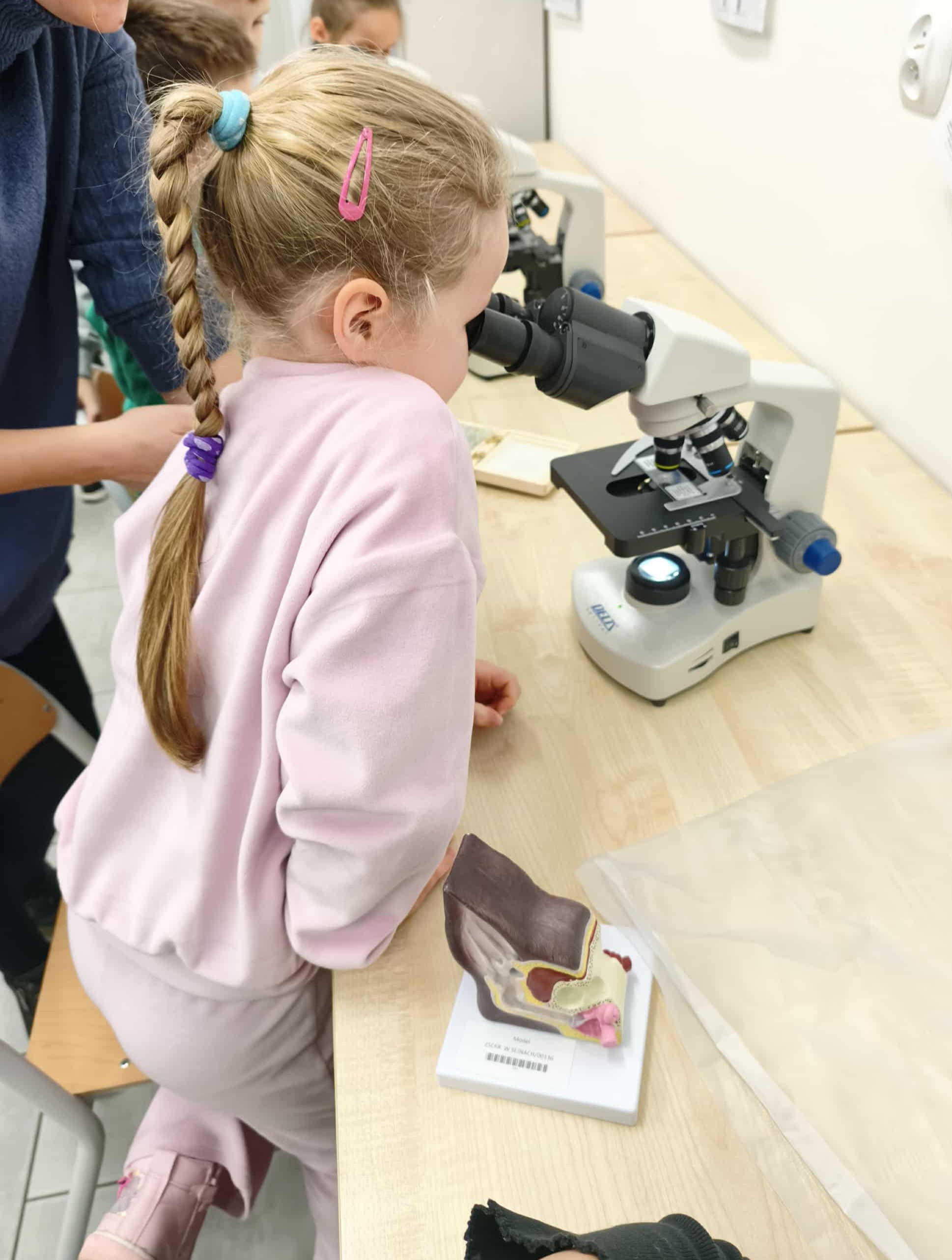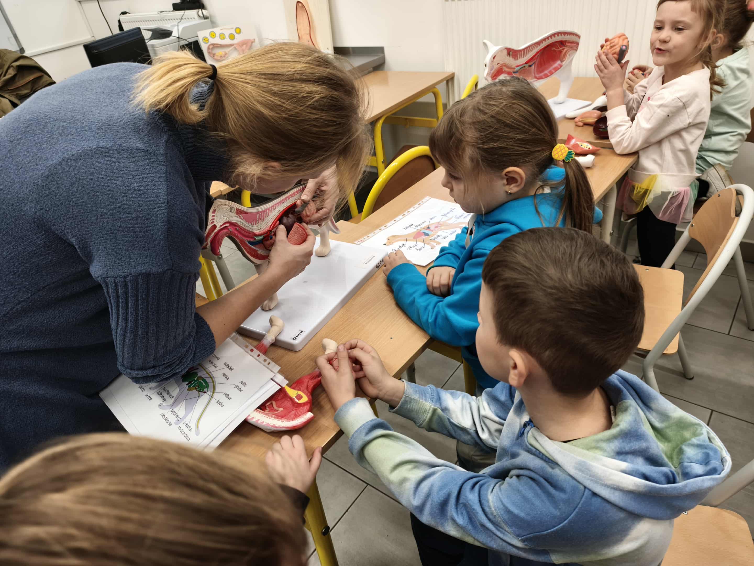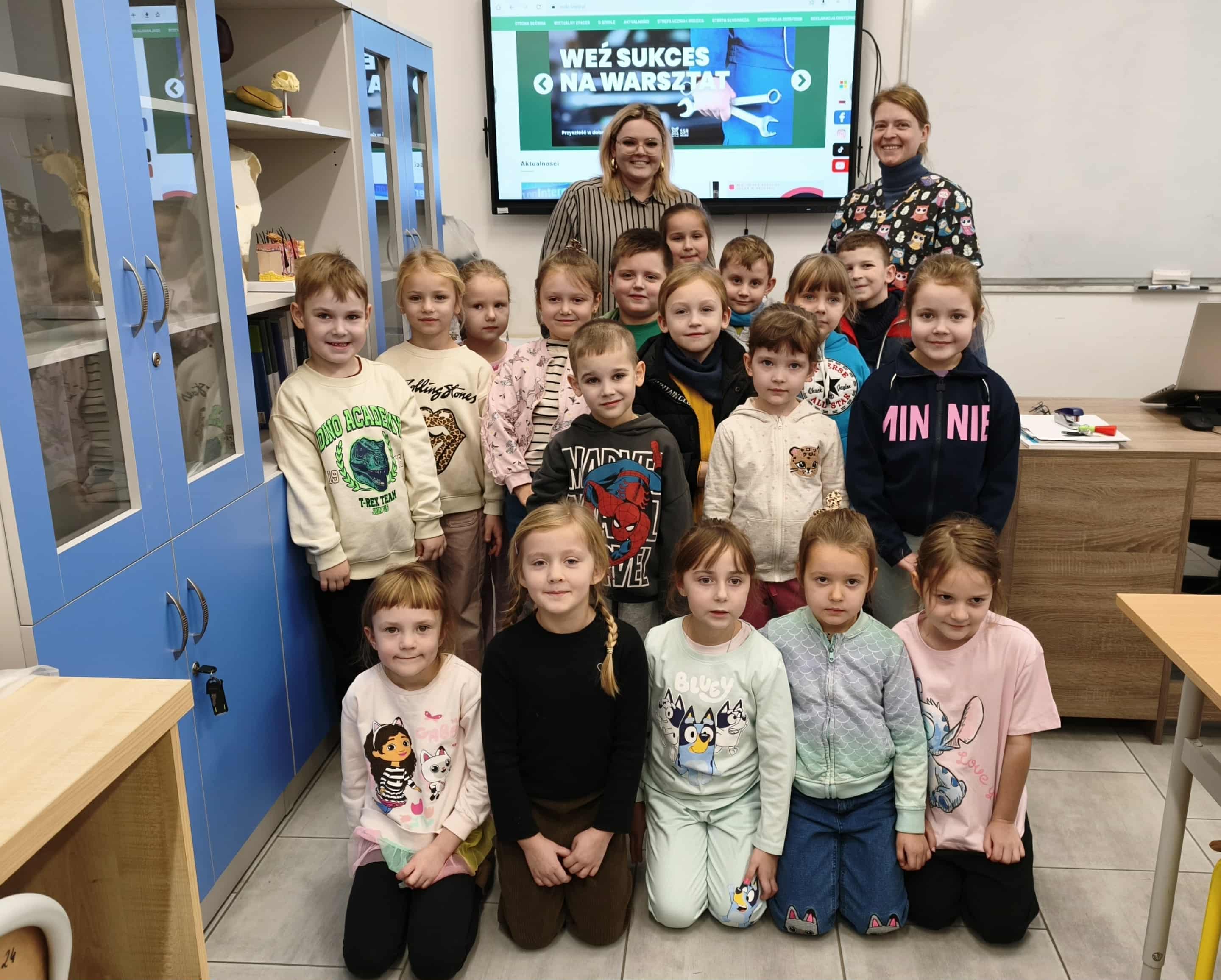 Dzieci zaproszono do pracowni weterynaryjnej, gdzie mogły zobaczyć, jak wygląda nauka przyszłych techników weterynarii. Obejrzały preparaty mikroskopowe, modele anatomiczne, posłuchały ciekawostek o zwierzętach i z ogromnym zainteresowaniem zadawały pytania. Ogromnym zainteresowaniem cieszył się ekran multimedialny, na którym dzieci rozwiązywały interaktywne zadania dostosowane do ich wieku.