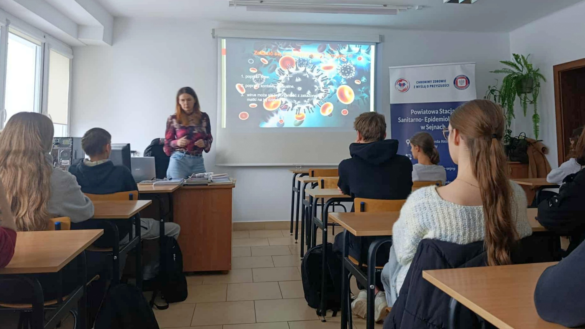 24 listopada 2025 r., w ramach działań edukacyjnych, uczniowie klasy II PTB uczestniczyli w wykładzie zatytułowanym „Uczymy się żyć bez ryzyka HIV”. Spotkanie poprowadzili dr Iwona Grasiuk oraz Kamil Mrozowicz z Wojewódzkiej Stacji Sanitarno-Epidemiologicznej, we współpracy z Powiatową Stacją Sanitarno-Epidemiologiczną w Sejnach.