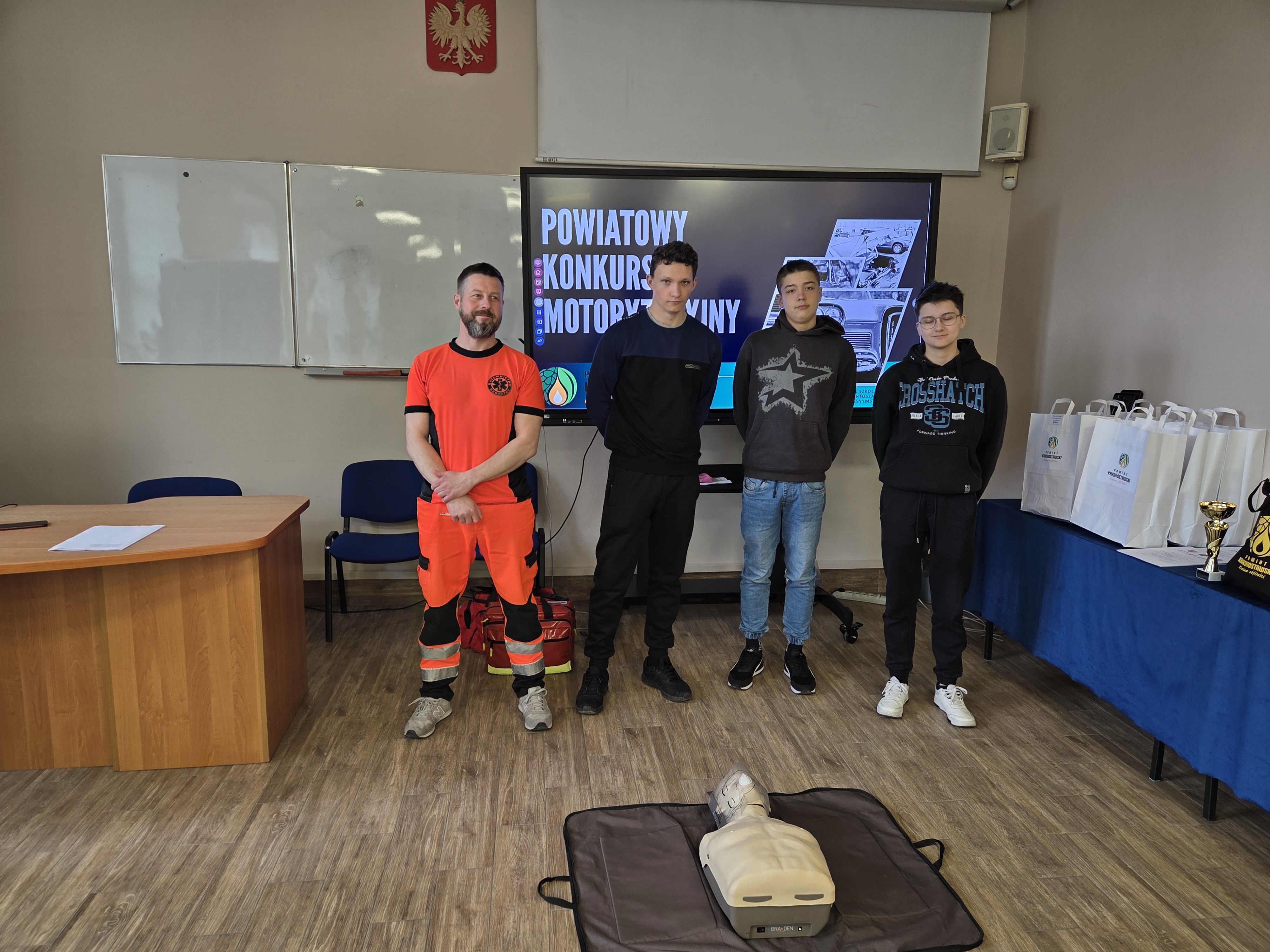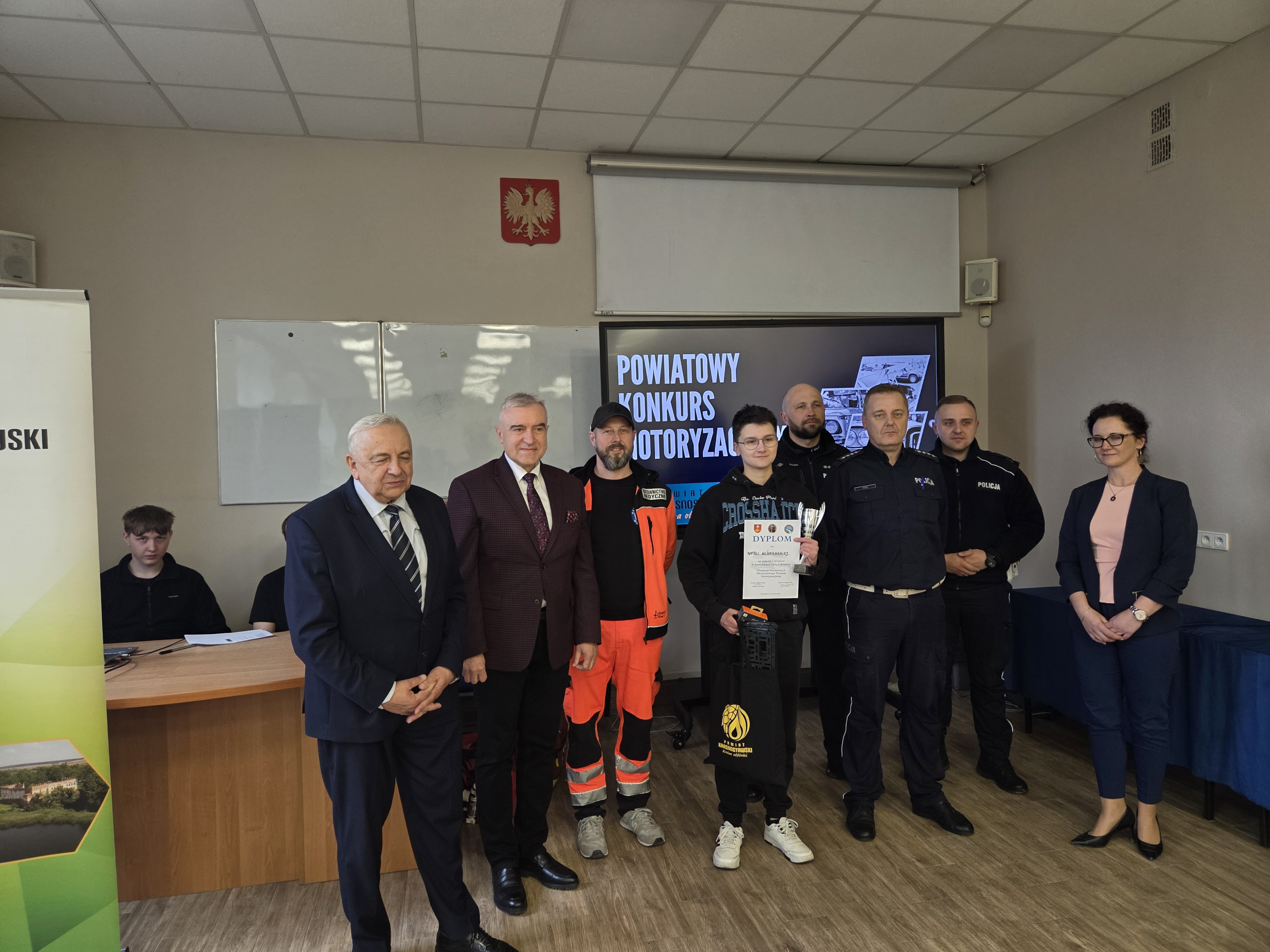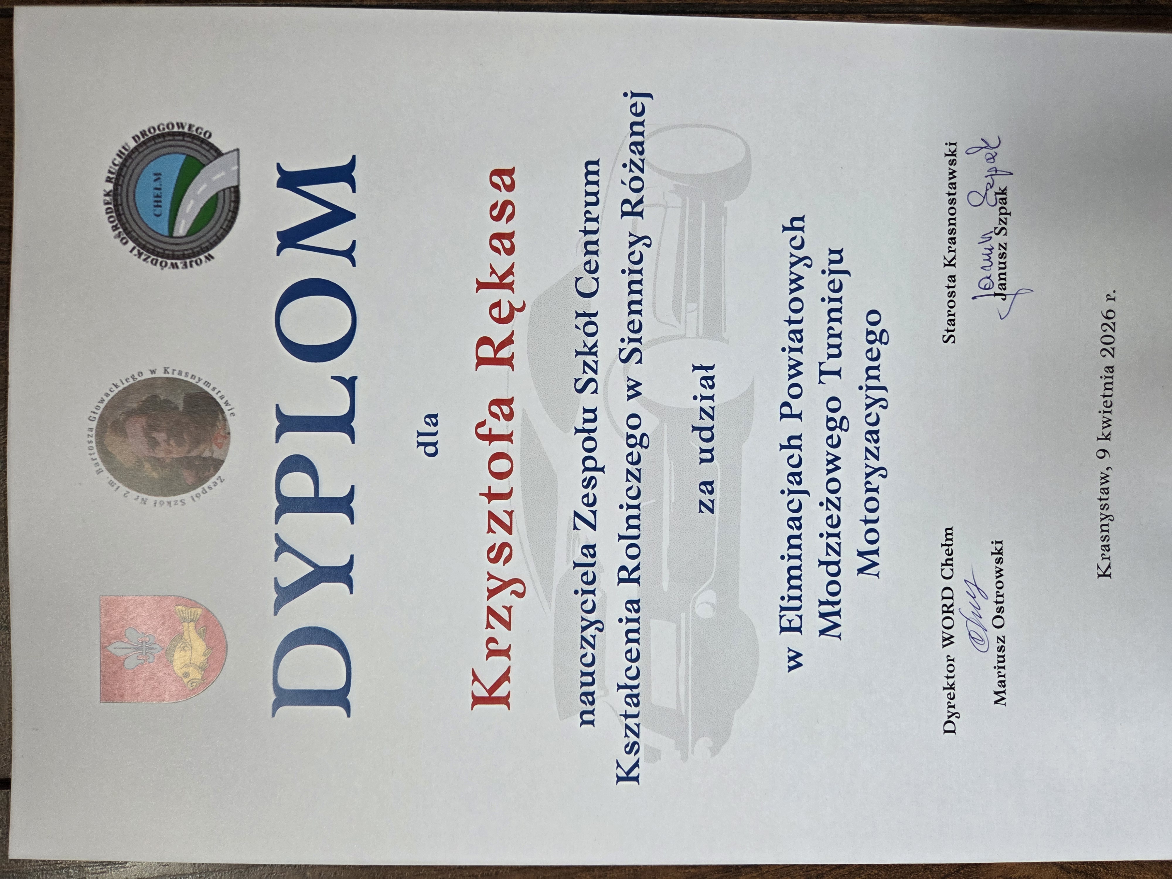 Każda drużyna otrzymała z rąk komisji organizacyjnej pamiątkowe dyplomy, najlepsze drużyny nagrody rzeczowe ufundowane przez WORD w Chełmie i Starostwo Powiatowe w Krasnymstawie. Nasza szkoła będzie reprezentowała powiat krasnostawski w turnieju wojewódzkim. Zwycięską drużynę do konkursu przygotował nauczyciel nauki jazdy - Krzysztof Rękas.