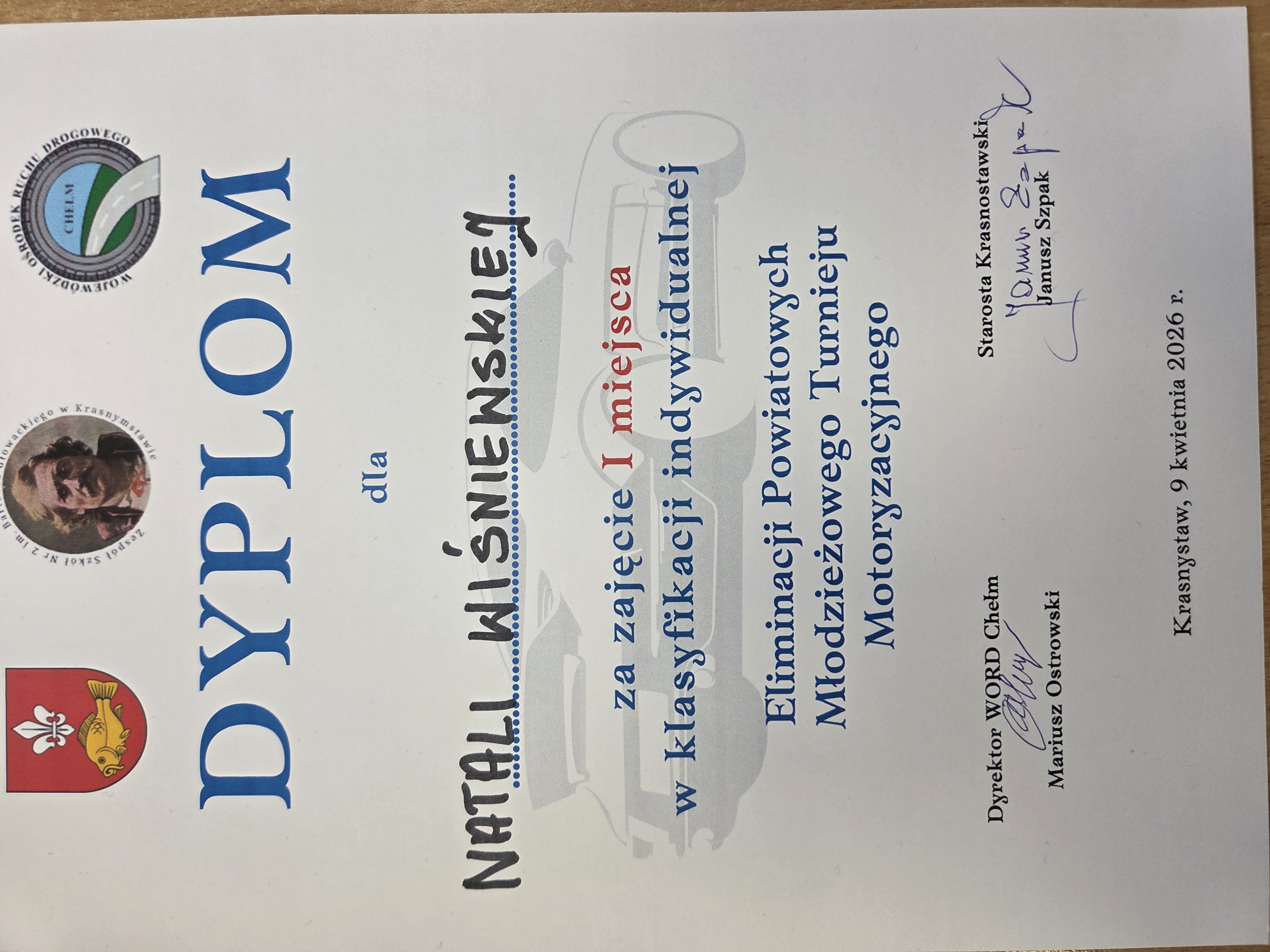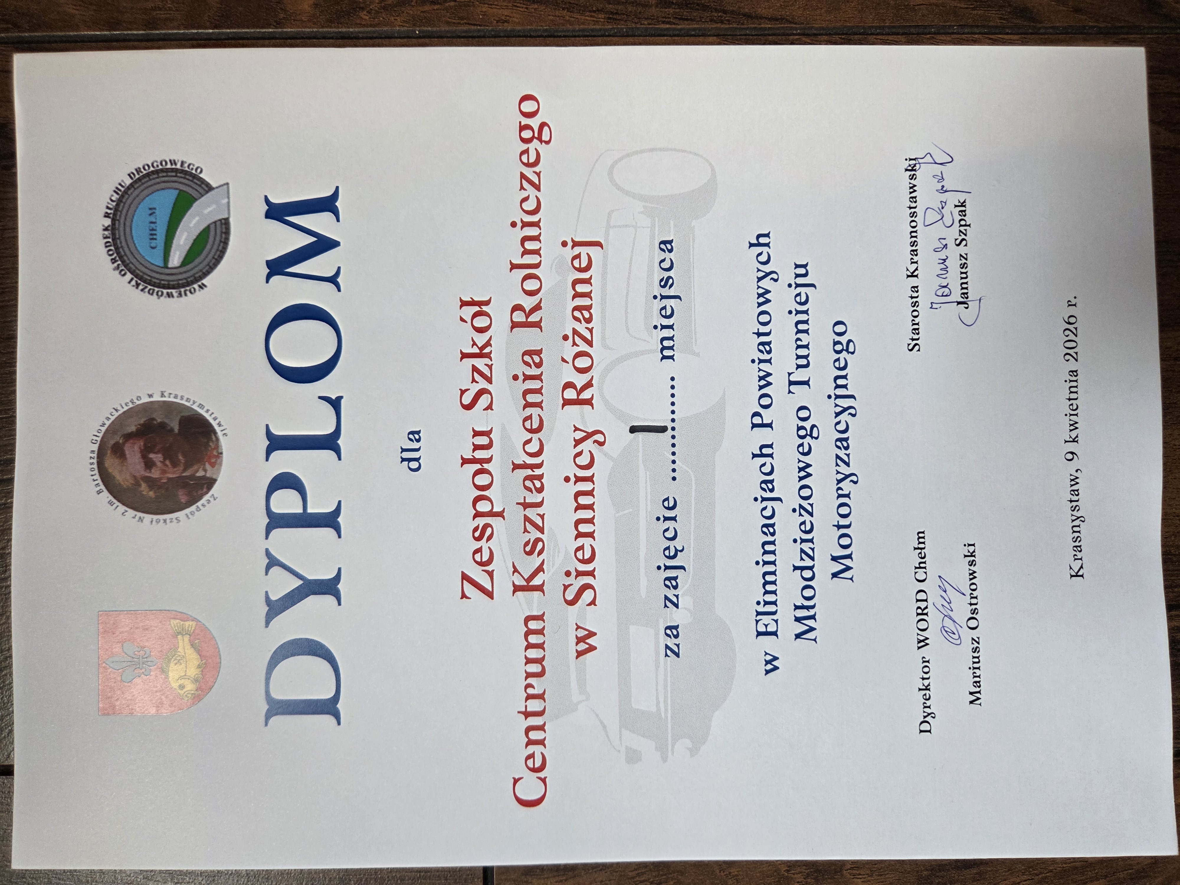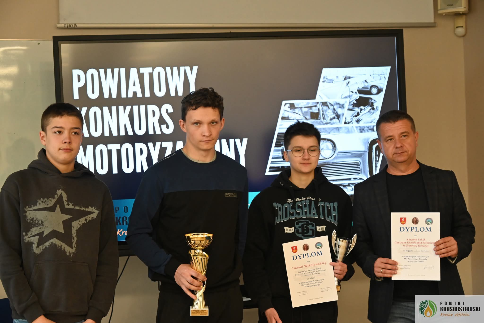 9 kwietnia 2026 roku w Zespole Szkół nr 2 im. Bartosza Głowackiego w Krasnymstawie odbył się XXVIII Powiatowy Młodzieżowy Turniej Motoryzacyjny dla uczniów szkół ponadpodstawowych. Naszą szkołę reprezentowali uczniowie: Natalia Wiśniewska, Szymon Matczuk i Mateusz Olech.