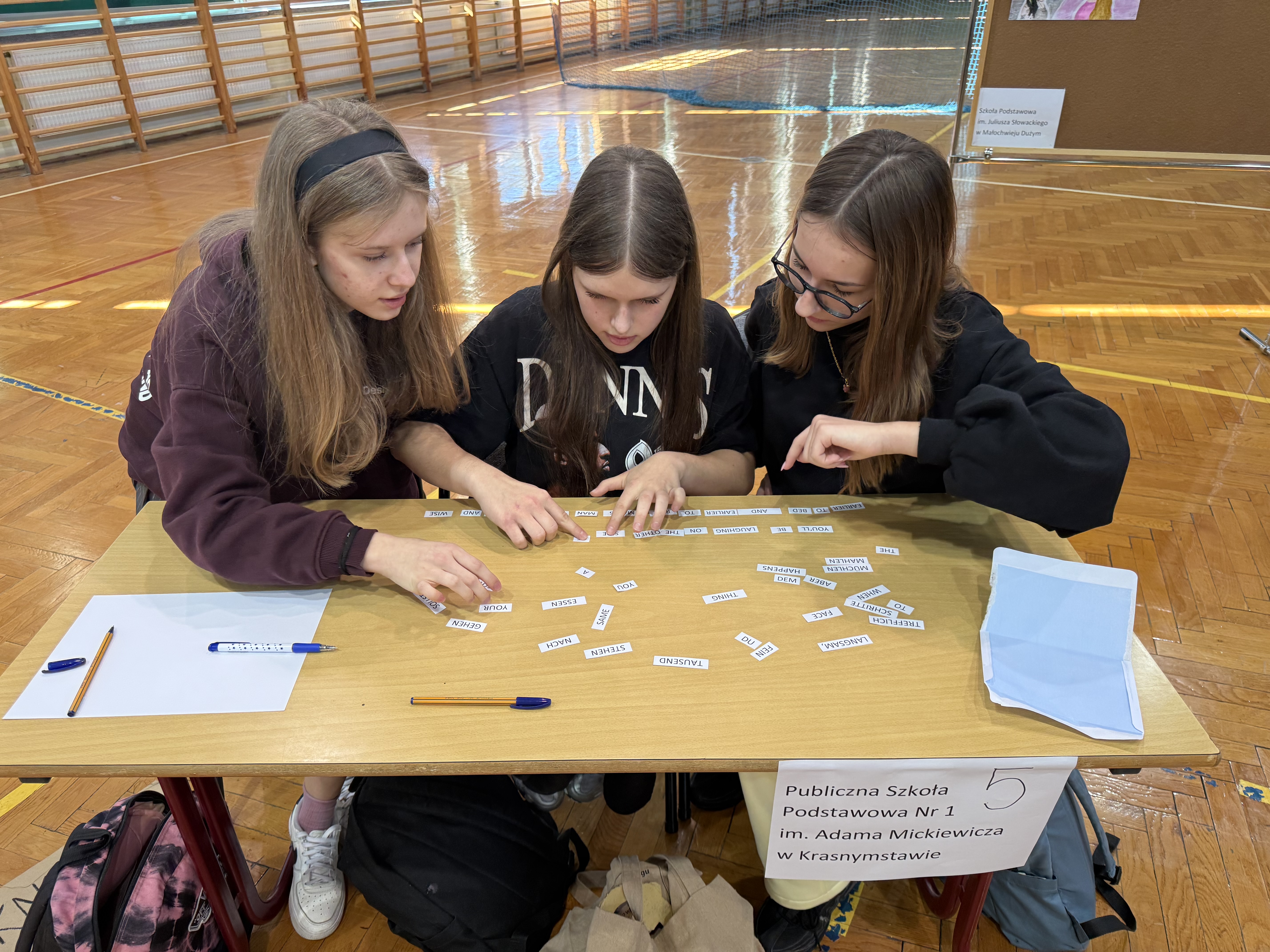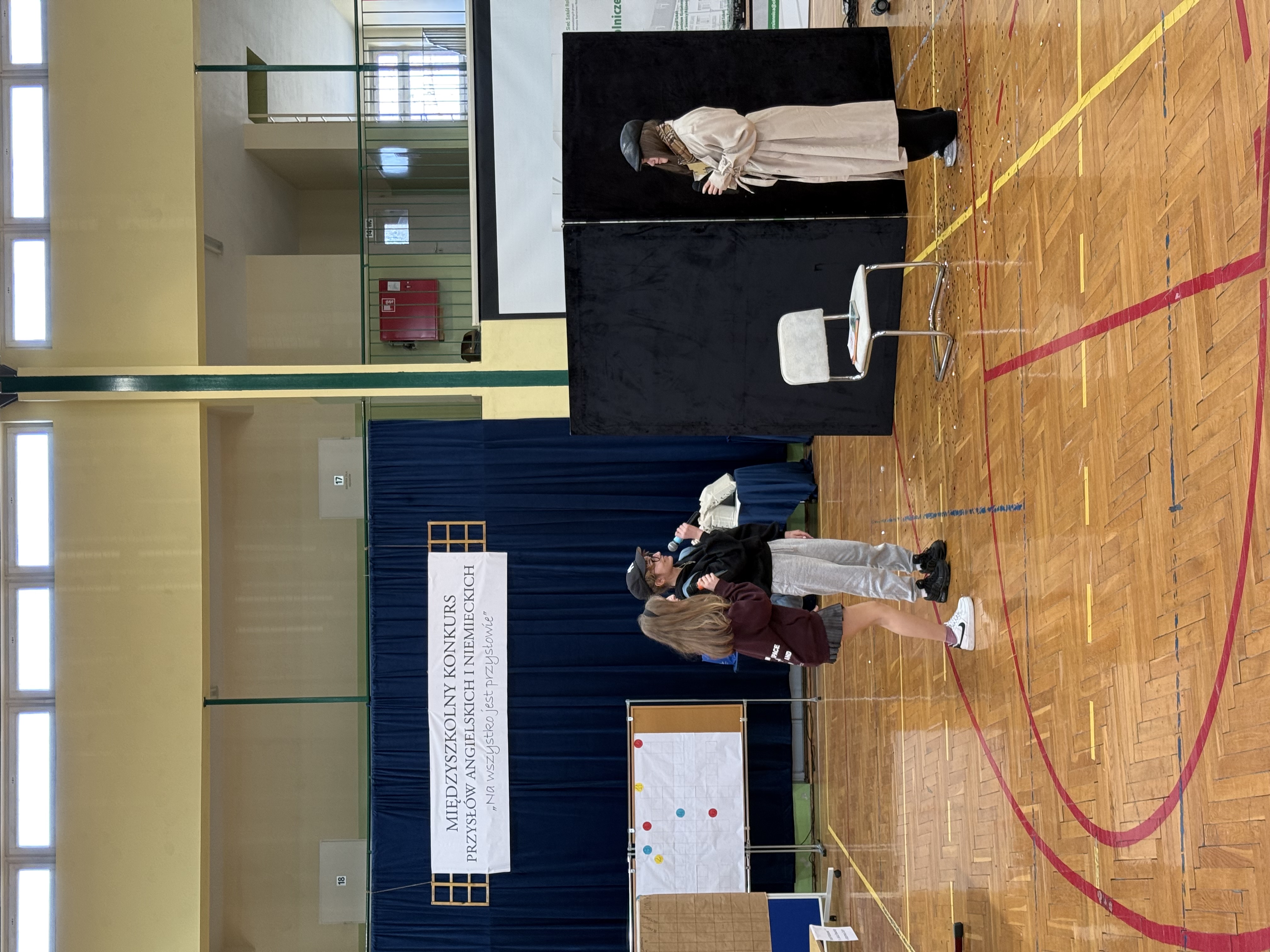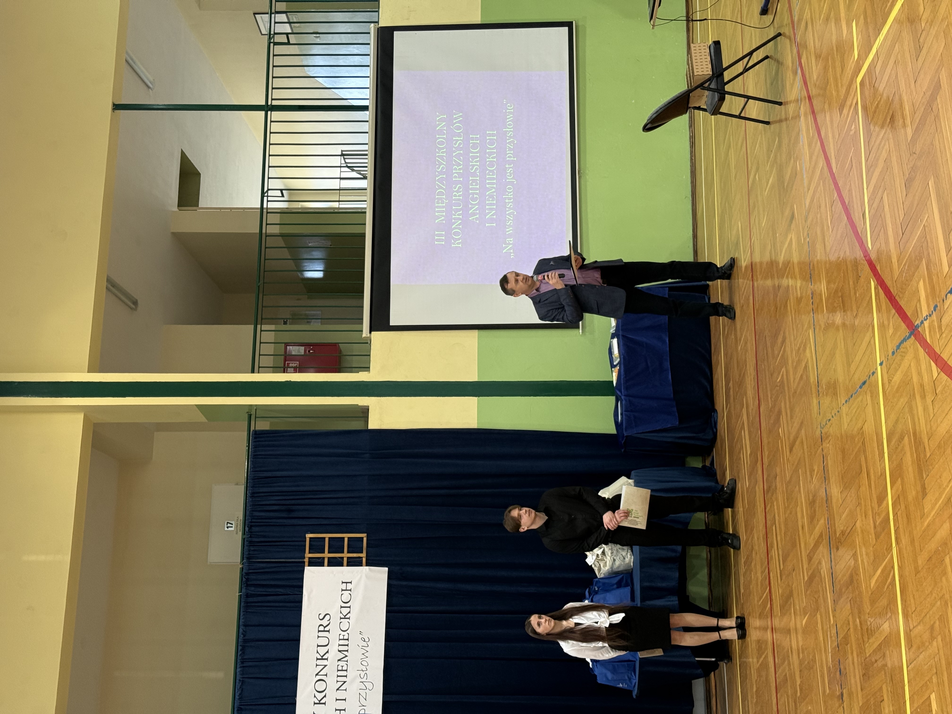 udział w konkursie. Uczestnicy zaprezentowali przygotowane wcześniej plakaty ilustrujące wybrane przysłowia. W kolejnych konkurencjach odgadywali przysłowia przedstawione za pomocą prezentacji, rekwizytów oraz kalamburów, układali puzzle, prezentowali scenki nawiązujące do wybranego przysłowia, a także rozwiązywali krzyżówkę. Odpowiadając na pytania konkursowe, uczniowie wykazali się bardzo dobrą znajomością języka angielskiego i niemieckiego. Rywalizacja była niezwykle emocjonująca i wyrównana. Zawodników gorąco dopingowali przybyli z nimi opiekunowie oraz uczniowie naszej szkoły.