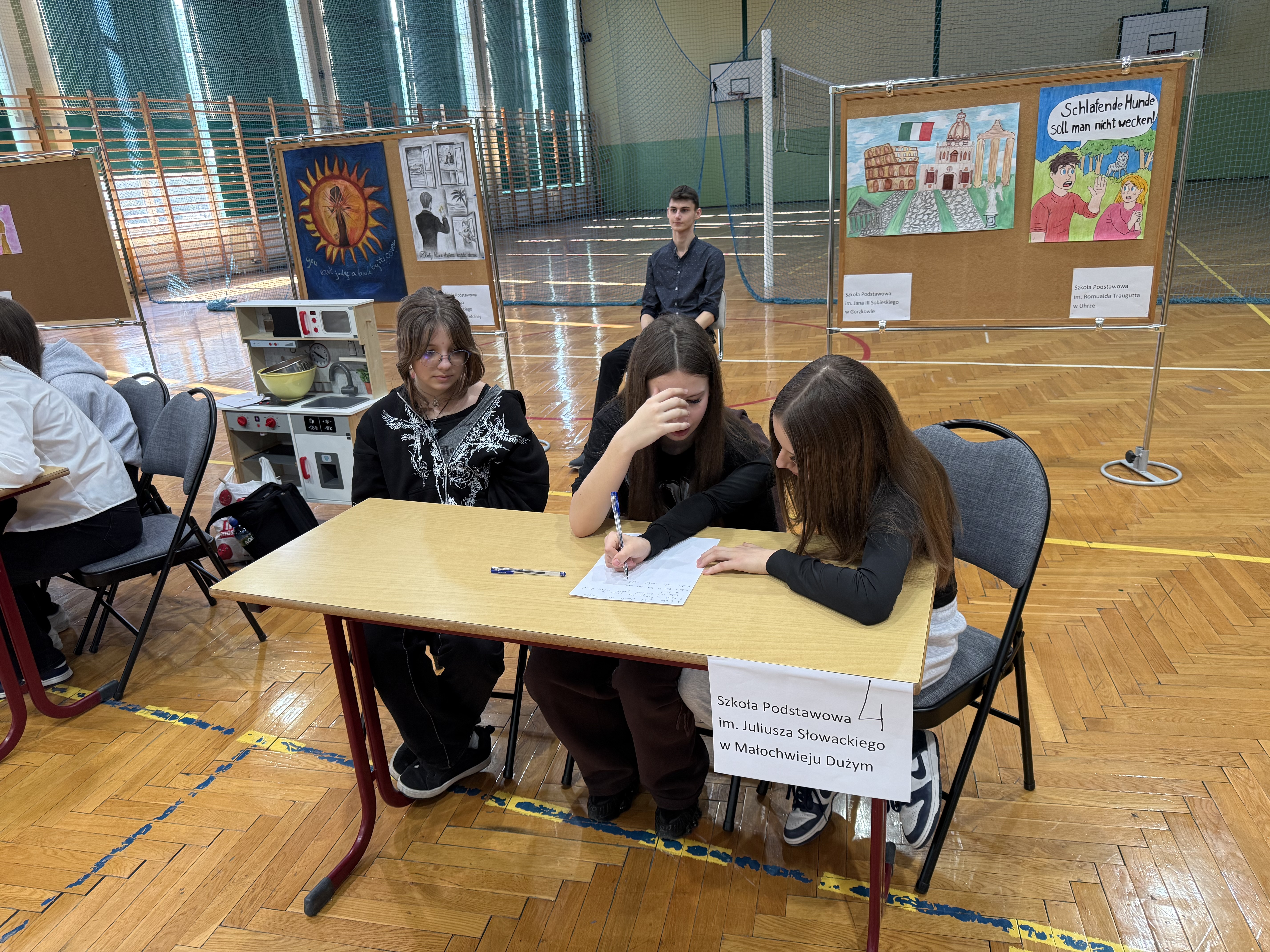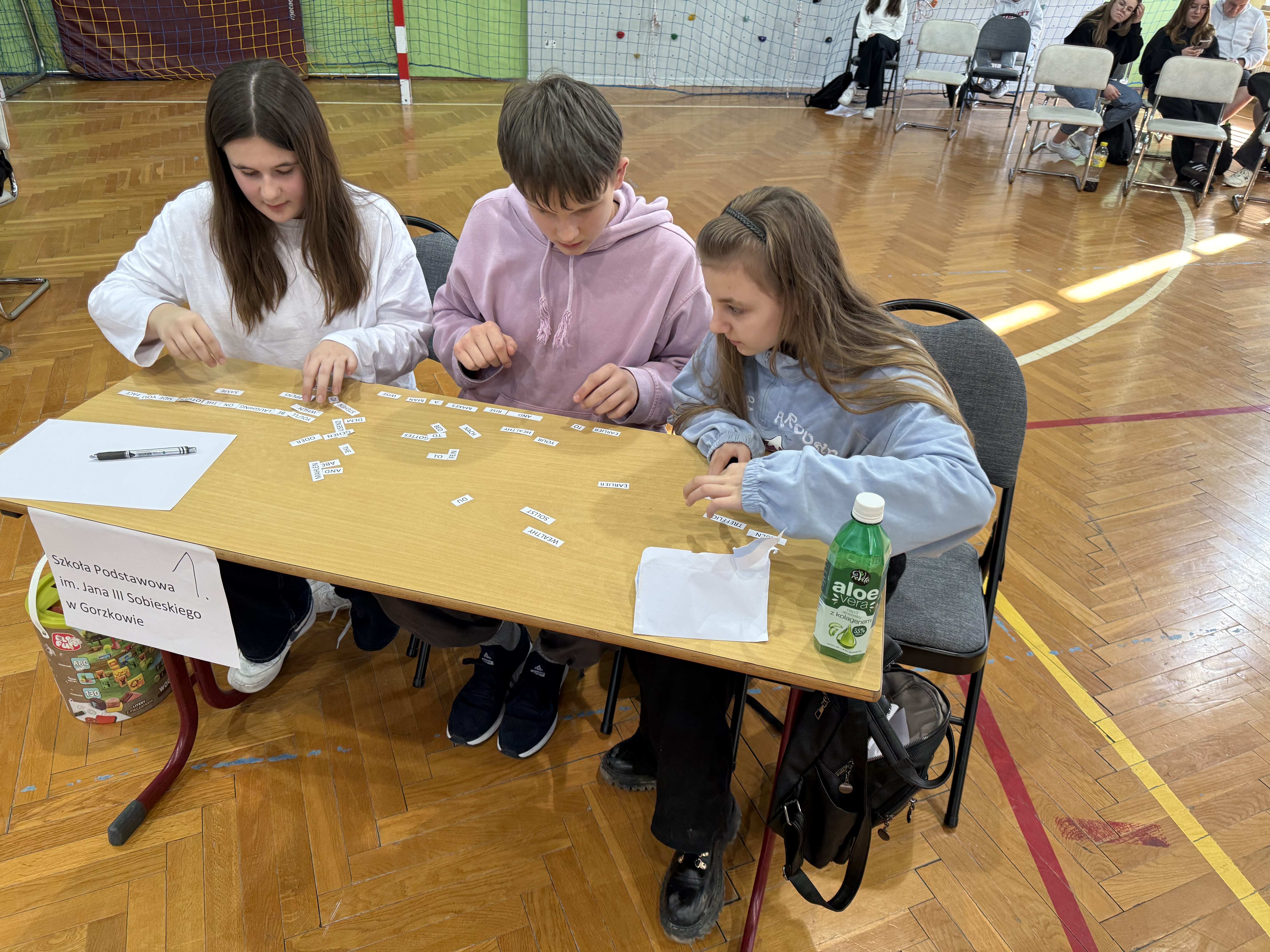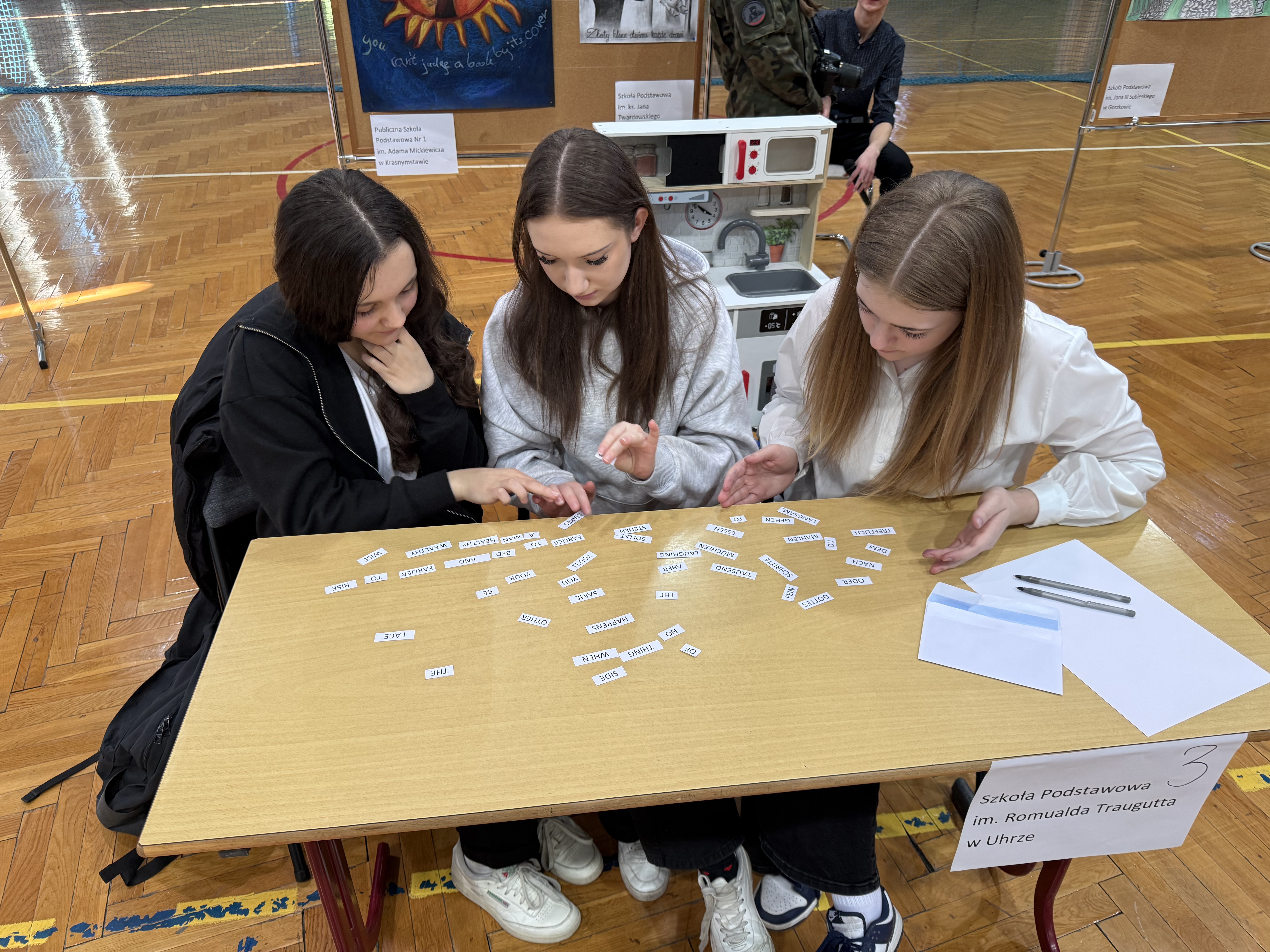 udział w konkursie. Uczestnicy zaprezentowali przygotowane wcześniej plakaty ilustrujące wybrane przysłowia. W kolejnych konkurencjach odgadywali przysłowia przedstawione za pomocą prezentacji, rekwizytów oraz kalamburów, układali puzzle, prezentowali scenki nawiązujące do wybranego przysłowia, a także rozwiązywali krzyżówkę. Odpowiadając na pytania konkursowe, uczniowie wykazali się bardzo dobrą znajomością języka angielskiego i niemieckiego. Rywalizacja była niezwykle emocjonująca i wyrównana. Zawodników gorąco dopingowali przybyli z nimi opiekunowie oraz uczniowie naszej szkoły.